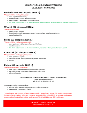 JADŁOSPIS DLA KLIENTÓW STOŁÓWKI 01.08.2016 - 05.08.2016 Poniedziałek (01 sierpnia 2016 r.) *Alergeny: białko mleka, gluten, seler • zupa koperkowa z zacierką • risotto, kurczak w sosie słodko-kwaśnym • sałata lodowa z pomidorem i natką pietruszki • lub danie extra w cenie 10 zł: ziemniaki młode, kotlet drobiowy w cieście włoskim, surówka + zupa gratis! Wtorek (02 sierpnia 2016 r.) *Alergeny: gluten, seler • rosół z tartym ciastem • kluski śląskie, schab faszerowany porem i marchewką w sosie beszamelowym • surówka z buraków Środa (03 sierpnia 2016 r.) *Alergeny: białko mleka, seler, gluten, jaja • zupa grochowa wojskowa z makaronem i kiełbasą • naleśniki z serem • lub danie extra w cenie 10 zł: ziemniaki młode, kieszeń ze schabu, surówka + zupa gratis! Czwartek (04 sierpnia 2016 r.) *Alergeny: białko mleka, jaja, gluten, seler • zupa ogórkowa z ryżem • ziemniaki młode, devolay nadziewany serem i czosnkiem • mizeria Piątek (05 sierpnia 2016 r.) *Alergeny: gluten, ryba, białko mleka • zupa krem z zielonego groszku z makaronem muszelką • ziemniaki młode, cytrynowa ryba z masłem i pietruszką • z kiszoną kapustą ZAPRASZAMY DO ODWIEDZENIA NASZEJ STRONY INTERNETOWEJ www.stolowka.grybow.pl tel. 18 445 03 80, 694 412 163 Polecamy w codziennej sprzedaży: • pierogi (z borówkami, z truskawkami, ruskie, chłopskie) • zapiekanki, hamburgery, frytki * w jadłospisie wyróżniono substancje lub produkty powodujące alergię lub reakcje nietolerancji. Rozporządzenie ministra rolnictwa i rozwoju wsi z dnia 23 grudnia 2014 r w sprawie znakowania poszczególnych rodzajów środków spożywczych (Dz. U. z 2014 r. poz. 669 z późn. zm.) NOWOŚĆ! DOWÓZ OBIADÓW zestaw dnia w cenie 12 zł