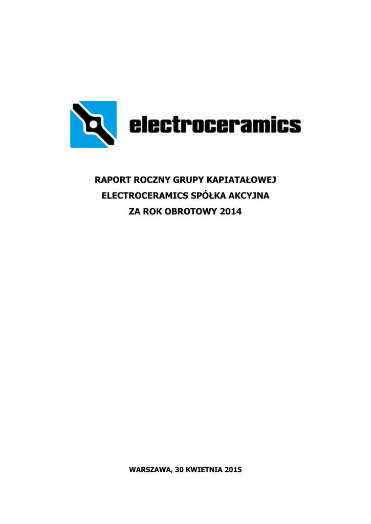 RAPORT ROCZNY GRUPY KAPIATAŁOWEJ ELECTROCERAMICS SPÓŁKA AKCYJNA ZA ROK OBROTOWY 2014 WARSZAWA, 30 KWIETNIA 2015 Raport roczny za 2014 rok ZAWARTOŚĆ RAPORTU: 1. List Prezesa Zarządu 2. Informacje o Spółce 3. Wybrane dane finansowe 4. Oświadczenia Zarządu 5. Informacja na temat stosowania przez Grupę Kapitałową Zasad Ładu Korporacyjnego ZAŁĄCZNIK DO RAPORTU 1. Roczne sprawozdanie finansowe za rok obrotowy 2014 2. Sprawozdanie Zarządu z działalności Grupy Kapitałowej w roku obrotowym 2014 3. Opinia i Raport biegłego rewidenta z badania sprawozdania finansowego za rok obrotowy 2014 2 Raport roczny za 2014 rok 1. List Prezesa Zarządu Warszawa, 30 kwietnia 2015 roku Szanowni Akcjonariusze, Inwestorzy! Przedstawiam Państwu Sprawozdanie Finansowe i Sprawozdanie Zarządu z działalności ELECTROCERAMICS S.A. za rok obrotowy 2014. W połowie roku 2014 Zarząd podjął decyzję o istotnej zmianie profilu działalności oraz przyjął nową strategię rozwoju Spółki. Wynikiem tych działań była również zmiana nazwy na ELECTROCERAMICS SA. Nabyliśmy 100% akcji Industry Technologies S.A., spółki która opanowała technologię izostatycznego formowania elektro-ceramiki C 130. Realizujemy inwestycję o wartości ponad 30 mln zł w technologię, która da nam trwałą przewagę nad branżą producentów elektroceramiki. Zajmiemy na tym rynku znaczącą pozycję. Większościowym akcjonariuszem stała się spółka IndygoTech Minerals S.A., notowana na rynku podstawowym Giełdy Papierów Wartościowych w Warszawie, tworząca technologiczną grupę przemysłową z branży ceramicznej. Zgodnie z przyjętą w dniu 17 czerwca 2014 r. nową strategią rozwoju, celem Spółki jest wejście na rynek ceramiki elektrostatycznej, a następnie dzięki przewadze technologicznej, zajęcie na nim ważnej pozycji lidera wyznaczającego nowe kierunki rozwoju. Branża już dostrzegła zalety wprowadzanej przez nas innowacyjnej technologii, co zaowocowało podpisaniem przez spółkę zależną Industry Technologies SA trzech listów intencyjnych z przyszłymi odbiorcami jej produktów. Deklarowane ilości dostaw tylko z tych trzech list dają poziom 880 tys. szt. z planowanej mocy 1 miliona. Zapewni to przekroczenie progu rentowności. W dniu 12.08.2014 r. wykupiliśmy 30 obligacji serii B oraz uregulowaliśmy zaległości związane z nieterminową ich spłatą. Pracujemy obecnie nad możliwością wykupu pozostałych obligacji. Chcemy do tego celu wykorzystać uchwaloną nową emisję akcji. Andrzej Krakówka Prezes Zarządu 3 Raport roczny za 2014 rok 2. Informacje o Spółce Podmiot Dominujący Electroceramics S.A. Firma spółki Siedziba Adres Numer Identyfikacji Podatkowej (NIP) Statystyczny Numer Identyfikacyjny (REGON) Przedmiot działalności wg PKD Rejestracja Spółki w KRS Electroceramics S.A. Warszawa ul. Świętokrzyska 30/63, 00-116 Warszawa 899-262-72-60 020638951 Działalność holdingów finansowych Sąd Rejonowy dla Wrocławia-Fabrycznej we Wrocławiu, VI Wydział Gospodarczy, KRS nr 0000296734 Kapitał zakładowy 16.472.030,00 zł Skład Zarządu na 31.12.2014 r. Maciej Marchwicki – Prezes Zarządu Skład Zarządu na dzień przekazania raportu Andrzej Krakówka – Prezes Zarządu Skład Rady Nadzorczej na 31.12.2014 r. Dariusz Janus Andrzej Krakówka Artur Sławiński Krzysztof Tytko Zenon Skowroński Skład Rady Nadzorczej na dzień przekazania Dariusz Janus raportu Łukasz Piasecki Marcin Zimny Maria Aleksnin Małgorzata Piasecka Podmiot zależny Industry Technologies S.A. Firma spółki zależnej Siedziba Adres Numer Identyfikacji Podatkowej (NIP) Industry Technologies S.A. Lubsko ul. Reymonta 8, 68-300 Lubsko 928-205-62-22 4 Raport roczny za 2014 rok Statystyczny Numer Identyfikacyjny 080445263 (REGON) Przedmiot działalności wg PKD Produkcja wyrobów ogniotrwałych Rejestracja Spółki w KRS Sąd Rejonowy w Zielonej Górze, VIII wydział gospodarczy Krajowego Rejestru Sądowego , KRS nr 0000359211 Kapitał zakładowy 1.610.363,50 zł Skład Zarządu na dzień przekazania raportu Maciej Marchwicki – Prezes Zarządu Skład Rady Nadzorczej na dzień przekazania Dariusz Janus raportu Małgorzata Piasecka Łukasz Piasecki 5 Raport roczny za 2014 rok 3. Wybrane dane finansowe WYBRANE DANE FINANSOWE Przychody netto ze sprzedaży produktów, towarów i materiałów Zysk (strata) z działalności operacyjnej PLN 31.12.2014 10 507,00 EUR 31.12.2013 31.12.2014 78 324,85 2 508,09 31.12.2013 18 600,06 -2785 530,77 -1 183 841,78 -664 923,50 -281 130,80 Zysk (strata) brutto -3 123 937,45 -2 702 559,09 -745 703,28 -641 785,58 Zysk (strata) netto -3 400 483,45 -2 539 202,49 -811 716,52 -602 992,75 Przepływy pieniężne netto z działalności operacyjnej Przepływy pieniężne netto z działalności inwestycyjnej Przepływy pieniężne netto z działalności finansowej Przepływy pieniężne netto, razem -10 436 054,65 -25 524,25 -2 448 456,15 -6 061,33 -14 045 547,28 62 783,61 -3 295 297,67 14 909,43 24 485 944,41 -29 723,10 5 744 772,64 -7 058,44 4 342,48 7 536,26 1 018,81 1 789,66 Aktywa, razem 26 156 272,90 1 813 530,00 6 136 656,95 437 290,22 Zobowiązania i rezerwy na zobowiązania 14 837 177,67 1 678 675,53 3 481 026,13 404 773,23 Zobowiązania długoterminowe 0,00 0,00 0,00 0,00 Zobowiązania krótkoterminowe 4 595 613,02 1 458 364,37 1 078 200,27 351 650,36 Kapitał własny 11 319 095,23 134 854,47 2 655 630,82 32 516,99 Kapitał zakładowy 16 472 030,00 1 722 029,95 3 864 587,19 415 227,13 Zasady przeliczania danych finansowych na euro: a) wybrane pozycje bilansu przeliczono według kursu średniego EUR podanego przez Narodowy Bank Polski: a. Z dnia 31.12.2013 roku – tabela nr 251/A/NBP/2013 – kurs 4,1472 PLN/EUR, b. Z dnia 31.12.2014 roku – tabela nr 252/A/NBP/2014 – kurs 4,2623 PLN/EUR. b) wybrane pozycje Rachunku Zysków i Strat oraz Rachunku przepływów pieniężnych przeliczono według średniej arytmetycznej kursów średnich opublikowanych przez NBP na o