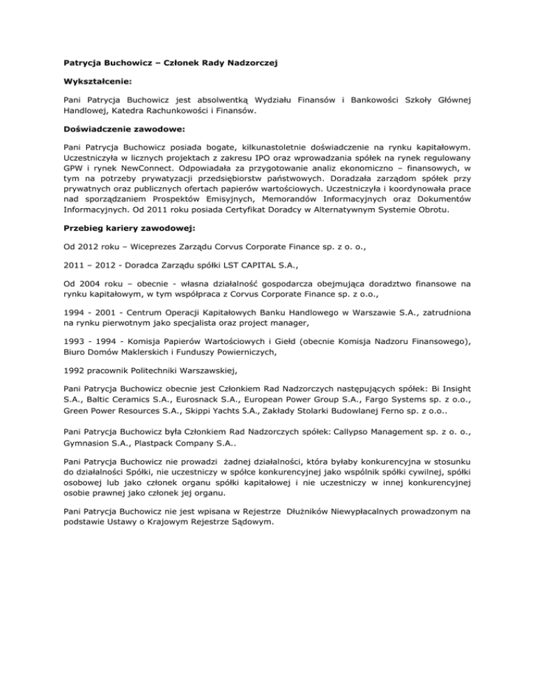 Patrycja Buchowicz – Członek Rady Nadzorczej Wykształcenie: Pani Patrycja Buchowicz jest absolwentką Wydziału Finansów i Bankowości Szkoły Głównej Handlowej, Katedra Rachunkowości i Finansów. Doświadczenie zawodowe: Pani Patrycja Buchowicz posiada bogate, kilkunastoletnie doświadczenie na rynku kapitałowym. Uczestniczyła w licznych projektach z zakresu IPO oraz wprowadzania spółek na rynek regulowany GPW i rynek NewConnect. Odpowiadała za przygotowanie analiz ekonomiczno – finansowych, w tym na potrzeby prywatyzacji przedsiębiorstw państwowych. Doradzała zarządom spółek przy prywatnych oraz publicznych ofertach papierów wartościowych. Uczestniczyła i koordynowała prace nad sporządzaniem Prospektów Emisyjnych, Memorandów Informacyjnych oraz Dokumentów Informacyjnych. Od 2011 roku posiada Certyfikat Doradcy w Alternatywnym Systemie Obrotu. Przebieg kariery zawodowej: Od 2012 roku – Wiceprezes Zarządu Corvus Corporate Finance sp. z o. o., 2011 – 2012 - Doradca Zarządu spółki LST CAPITAL S.A., Od 2004 roku – obecnie - własna działalność gospodarcza obejmująca doradztwo finansowe na rynku kapitałowym, w tym współpraca z Corvus Corporate Finance sp. z o.o., 1994 - 2001 - Centrum Operacji Kapitałowych Banku Handlowego w Warszawie S.A., zatrudniona na rynku pierwotnym jako specjalista oraz project manager, 1993 - 1994 - Komisja Papierów Wartościowych i Giełd (obecnie Komisja Nadzoru Finansowego), Biuro Domów Maklerskich i Funduszy Powierniczych, 1992 pracownik Politechniki Warszawskiej, Pani Patrycja Buchowicz obecnie jest Członkiem Rad Nadzorczych następujących spółek: Bi Insight S.A., Baltic Ceramics S.A., Eurosnack S.A., European Power Group S.A., Fargo Systems sp. z o.o., Green Power Resources S.A., Skippi Yachts Pani Patrycja Buchowicz S.A., Zakłady Stolarki Budowlanej Ferno sp. z o.o.. była Członkiem Rad Nadzorczych spółek: Callypso Management sp. z o. o., Gymnasion S.A., Plastpack Company S.A.. Pani Patrycja Buchowicz nie prowadzi żadnej działalności, która byłaby konkurencyjna w stosunku do działalności Spółki, nie uczestniczy w spółce konkurencyjnej jako wspólnik spółki cywilnej, spółki osobowej lub jako członek organu spółki kapitałowej i nie uczestniczy w innej konkurencyjnej osobie prawnej jako członek jej organu. Pani Patrycja Buchowicz nie jest wpisana w Rejestrze Dłużników Niewypłacalnych prowadzonym na podstawie Ustawy o Krajowym Rejestrze Sądowym.