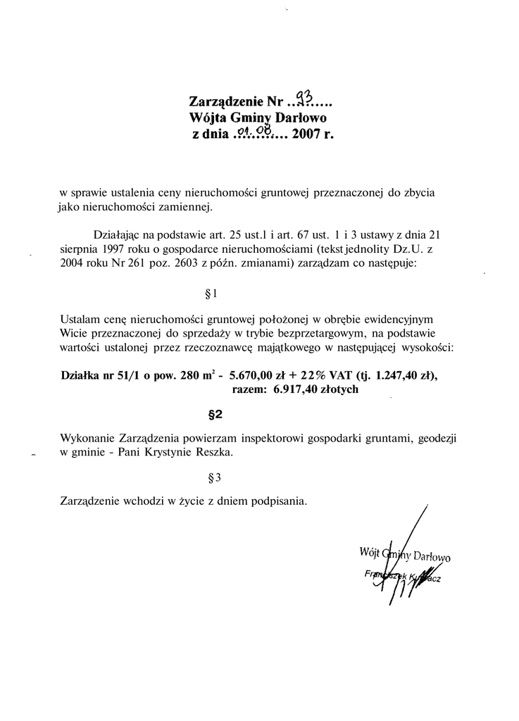 w sprawie ustalenia ceny nieruchomości gruntowej przeznaczonej do zbycia jako nieruchomości zamiennej. Działając na podstawie art. 25 ust.l i art. 67 ust. 1 i 3 ustawy z dnia 21 sierpnia 1997 roku o gospodarce nieruchomościami (tekst jednolity Dz.U. z 2004 roku Nr 261 poz. 2603 z późn. zmianami) zarządzam co następuje: §1 Ustalam cenę nieruchomości gruntowej położonej w obrębie ewidencyjnym Wicie przeznaczonej do sprzedaży w trybie bezprzetargowym, na podstawie wartości ustalonej przez rzeczoznawcę majątkowego w następującej wysokości: Działka nr 51/1 o pow. 280 m2 - 5.670,00 zł + 22% VAT (tj. 1.247,40 zł), razem: 6.917,40 złotych §2 Wykonanie Zarządzenia powierzam inspektorowi gospodarki gruntami, geodezji w gminie - Pani Krystynie Reszka. §3 Zarządzenie wchodzi w życie z dniem podpisania.