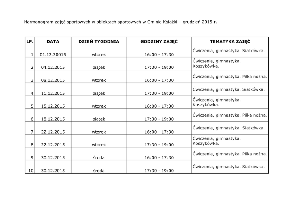 Harmonogram zajęć sportowych w obiektach sportowych w Gminie Książki – grudzień 2015 r. LP. 1 DATA DZIEŃ TYGODNIA GODZINY ZAJĘĆ 01.12.20015 wtorek 16:00 - 17:30 2 04.12.2015 piątek 17:30 - 19:00 3 08.12.2015 wtorek 16:00 - 17:30 4 11.12.2015 piątek 17:30 - 19:00 5 15.12.2015 wtorek 16:00 - 17:30 6 18.12.2015 piątek 17:30 - 19:00 7 22.12.2015 wtorek 16:00 - 17:30 8 22.12.2015 wtorek 17:30 - 19:00 9 30.12.2015 środa 16:00 - 17:30 10 30.12.2015 środa 17:30 - 19:00 TEMATYKA ZAJĘĆ Ćwiczenia, gimnastyka. Siatkówka. Ćwiczenia, gimnastyka. Koszykówka. Ćwiczenia, gimnastyka. Piłka nożna. Ćwiczenia, gimnastyka. Siatkówka. Ćwiczenia, gimnastyka. Koszykówka. Ćwiczenia, gimnastyka. Piłka nożna. Ćwiczenia, gimnastyka. Siatkówka. Ćwiczenia, gimnastyka. Koszykówka. Ćwiczenia, gimnastyka. Piłka nożna. Ćwiczenia, gimnastyka. Siatkówka.