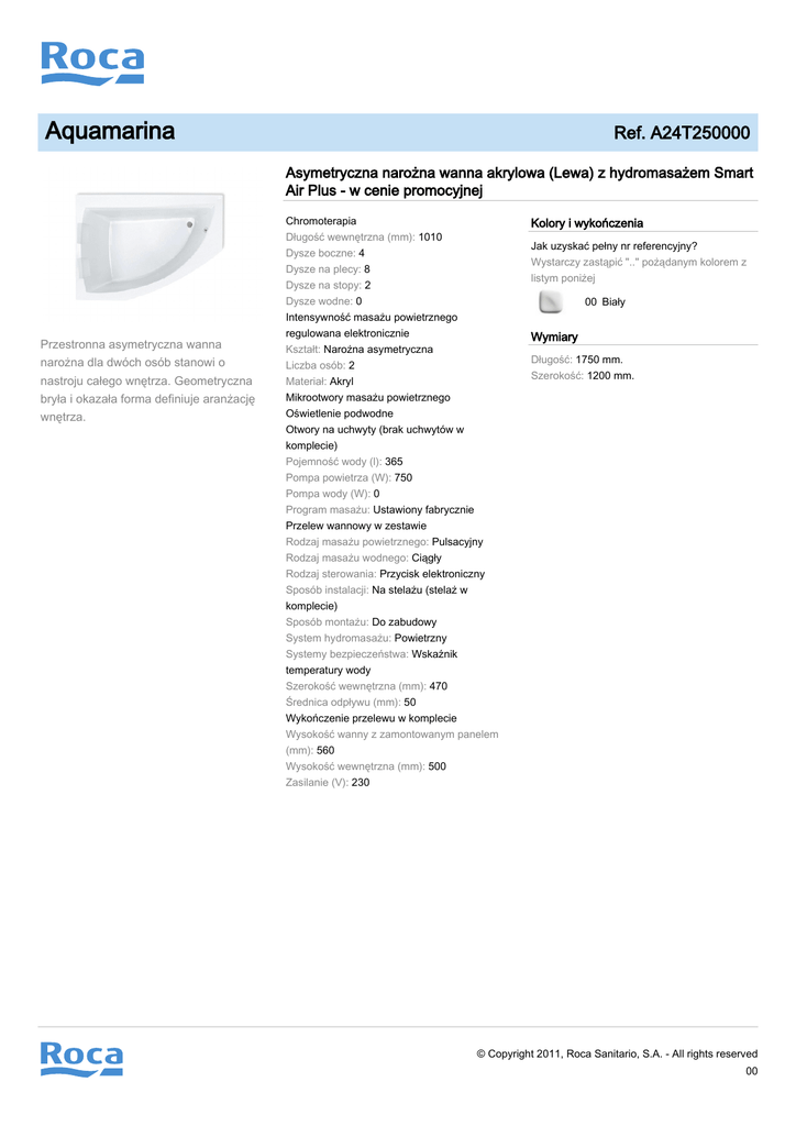 Aquamarina Ref. A24T250000 Asymetryczna narożna wanna akrylowa (Lewa) z hydromasażem Smart Air Plus - w cenie promocyjnej Przestronna asymetryczna wanna narożna dla dwóch osób stanowi o nastroju całego wnętrza. Geometryczna bryła i okazała forma definiuje aranżację wnętrza. Chromoterapia Długość wewnętrzna (mm): 1010 Dysze boczne: 4 Dysze na plecy: 8 Dysze na stopy: 2 Dysze wodne: 0 Intensywność masażu powietrznego regulowana elektronicznie Kształt: Narożna asymetryczna Liczba osób: 2 Materiał: Akryl Mikrootwory masażu powietrznego Oświetlenie podwodne Otwory na uchwyty (brak uchwytów w komplecie) Pojemność wody (l): 365 Pompa powietrza (W): 750 Pompa wody (W): 0 Program masażu: Ustawiony fabrycznie Przelew wannowy w zestawie Rodzaj masażu powietrznego: Pulsacyjny Rodzaj masażu wodnego: Ciągły Rodzaj sterowania: Przycisk elektroniczny Sposób instalacji: Na stelażu (stelaż w komplecie) Sposób montażu: Do zabudowy System hydromasażu: Powietrzny Systemy bezpieczeństwa: Wskaźnik temperatury wody Szerokość wewnętrzna (mm): 470 Średnica odpływu (mm): 50 Wykończenie przelewu w komplecie Wysokość wanny z zamontowanym panelem (mm): 560 Wysokość wewnętrzna (mm): 500 Zasilanie (V): 230 Kolory i wykończenia Jak uzyskać pełny nr referencyjny? Wystarczy zastąpić ".." pożądanym kolorem z listym poniżej 00 Biały Wymiary Długość: 1750 mm. Szerokość: 1200 mm. © Copyright 2011, Roca Sanitario, S.A. - All rights reserved 00 Aquamarina Ref. A24T250000 Rysunki techniczne 1200 980 750 612 1750 1545 1115 110 130 690 500 40 610 © Copyright 2011, Roca Sanitario, S.A. - All rights reserved 01