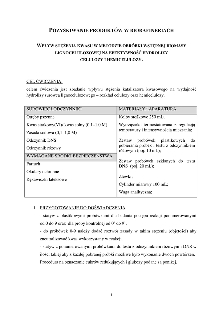 POZYSKIWANIE PRODUKTÓW W BIORAFINERIACH WPŁYW STĘŻENIA KWASU W METODZIE OBRÓBKI WSTĘPNEJ BIOMASY LIGNOCELULOZOWEJ NA EFEKTYWNOŚĆ HYDROLIZY CELULOZY I HEMICELULOZY. CEL ĆWICZENIA: celem ćwiczenia jest zbadanie wpływu stężenia katalizatora kwasowego na wydajność hydrolizy surowca lignocelulozowego – rozkład celulozy oraz hemicelulozy. SUROWIEC i ODCZYNNIKI MATERIAŁY i APARATURA Otręby pszenne Kolby stożkowe 250 mL; Kwas siarkowy(VI)/ kwas solny (0,1–1,0 M) Wytrząsarka termostatowana z regulacją temperatury i intensywnością mieszania; Zasada sodowa (0,1–1,0 M) Zestaw probówek plastikowych do pobierania próbek i testu z odczynnikiem różowym (poj. 10 mL); Odczynnik DNS Odczynnik różowy WYMAGANE ŚRODKI BEZPIECZEŃSTWA Fartuch Okulary ochronne Zestaw probówek szklanych do testu DNS (poj. 20 mL); Zlewki; Rękawiczki lateksowe Cylinder miarowy 100 mL; Waga analityczna; 1. PRZYGOTOWANIE DO DOŚWIADCZENIA - statyw z plastikowymi probówkami dla badania postępu reakcji ponumerowanymi od 0 do 9 oraz dla próby kontrolnej od 0’ do 9’. - do próbówek 0-9 należy dodać roztwór zasady w takim stężeniu (objętości) aby zneutralizować kwas wykorzystany w reakcji. - statyw z ponumerowanymi probówkami do testu z odczynnikiem różowym i DNS w ilości takiej aby z każdej pobranej próbki możliwe było wykonanie dwóch powtórzeń. Procedura na oznaczanie cukrów redukujących i glukozy podane są poniżej. 1 • TEST DNS (analiza na obecność glukozy i innych cukrów redukujących) Do 0,5 mL roztworu zawierającego glukozę o stężeniu 0,1 – 2,0 g/L dodać 1,5 mL odczynnika DNS i próby wstawić na 5 min do 100 °C. Następnie próby ochłodzić, dodać 8 mL wody destylowanej i po 25 min od wyciągnięcia z łaźni zmierzyć absorbancję przy 550 nm względem próby kontrolnej. Do kontroli zamiast roztworu cukru dodaje się 0,5 mL wody, a następnie próbkę tą traktuje się jak wszystkie pozostałe. Równanie krzywej: Abs=0,634∙Cred[g/L] – 0,01 • Oznaczanie stężenia glukozy testem enzymatycznym. Zasada metody. Glukoza pod wpływem oksydazy glukozowej utlenia się do kwasu glukonowego z wytworzeniem nadtlenku wodoru. Ten ostatni reaguje w obecności peroksydazy z kwasem hydrobenzoesowym (HBA) i 4-aminoantypiryną (AAP) tworząc czerwony barwnik chinonoiminę, którego intensywność zabarwienia mierzona przy długości fali 500 nm jest wprost proporcjonalna do stężenia glukozy w próbce. Glukoza + O2 + H2O Oksydaza glukozowa H2O2 + HBA + AAP Peroksydaza kwas glukonowy +H2O2 chinonoimina + 4 H2O Odczynniki: Odczynnik I (składniki aktywne: oksydaza glukozowa, peroksydaza, AAP, HBA, bufor fosforanowy), stabilizowany standard glukozy. Z odpowiednio rozcieńczonej próbki pobrać 10 µl do 1 ml odczynnika zawierającego oksydazę glukozową (Glukoza OXY DST, Alpha Diagnostics), inkubować przez 5 min w 37oC, a następnie mierzyć absorbancję przy długości fali 550 nm. Równanie krzywej: Abs=0,371∙Cgluk [g/L] – 0,109 2. WYKONANIE DOŚWIADCZENIA 1. Kolba do reakcji – surowiec + r-ór kwasu 2. Kolba kontrolna – surowiec + woda Kwaśna hydroliza surowca lignocelulozowego: − Do kolb 250 mL zawierającej 5 g otrębów pszennych zwilżonych 20 mL wody należy dodać 100 mL kwasu siarkowego(VI) o stężeniu podanym przed prowadzącego w zakresie 0,1-1,0 M. − Start procesu rozpoczyna się w momencie dodania kwasu (należy włączyć stoper). Natychmiast po wlaniu kwasu pobrać próbkę 1,0 mL (próbka w czasie t=0 min) i zneutralizować ją roztworem zasady. 2 − Włączyć wytrząsanie. Hydrolizę należy prowadzić w temperaturze 60 °C przez 60-120 minut z intensywnością mieszania 100-200 obr/min. − Próbki należy pobierać w 0, 4, 8, 12, 16, 20, 40, 60, 90 (120) min i neutralizować zasadą, za każdym razem wyłączając wytrząsanie na czas pobierania. − Analogicznie należy postępować z kolbą kontrolną z tym, że pobrane próbki nie należy neutralizować zasadą, czyli w momencie dodania wody, należy pobrać próbkę zerową (~1,5 mL), następnie próbki pobierać w 0, 4, 8, 12, 16, 20, 40, 60, 90 (120) min. − Wszystkie próbki należy odwirować 6000 rpm przez 10 min i supernatant wykorzystać do oznaczeń – DNS i odczynnik różowy. − Po zakończeniu reakcji otręby oddzielić od fazy ciekłej na sitku i przemywać wodą destylowaną porcjami 3 x 100 mL. − Przemyte otręby przenieść na zważoną szalkę Petriego i wysuszyć do stałej masy w temp. 70 °C przez około dobę i zważyć. 3. OPRACOWANIE WYNIKÓW: KOLBA Z REAKCJĄ t [min] V próbki [mL] V NaOH [mL] R Test DNS Abs1 Test DNS Abs2 R Stężenie cukrów redukujących, Cred [g/L] R- rozcieńczenie; 3 Test odczynnik różowy Abs1 Test odczynnik różowy Abs2 R Stężenie glukozy, Cgluk [g/L] KOLBA KONTROLNA t [min] V próbki [mL] V NaOH [mL] R Test DNS Abs1 Test DNS Abs2 R Stężenie cukrów redukujących, CredK [g/L] Test odczynnik różowy Abs1 Test odczynnik różowy Abs2 R Stężenie glukozy, CglukK [g/L] R- rozcieńczenie; 1. Uwzględnić ilość cukrów pochodzących z kolby kontrolnej CredK i CglukK. Stężenie cukrów pochodzące z reakcji hydrolizy: Stężenie rzeczywiste wszystkich cukrów redukujących: Crz,red = Cred - CredK [g/L] Stężenie rzeczywiste glukozy: Crz,gluk = Cgluk – CglukK [g/L] 2. Przedstawić przebieg reakcji hydrolizy na wykresie Crz,red = f(t) i Crz,gluk = f(t) i wyznaczyć maksymalną szybkość reakcji uwalniania cukrów redukujących i glukozy; 3. Dla użytych stężeń kwasu siarkowego(VI) porównać szybkość reakcji hydrolizy składników zawartych w surowcu. Należy przyjąć, że celuloza jest jedynym składnikiem dającym cząsteczki glukozy, natomiast hydroliza hemicelulozy uwalnia wszystkie pozostałe cukry redukujące. Stąd, stężenie oznaczone za pomocą odczynnika różowego będzie odpowiadało hydrolizie wyłącznie celulozy, a różnica Crz,red - Crz,gluk będzie odpowiadała stężeniu cukrów budują