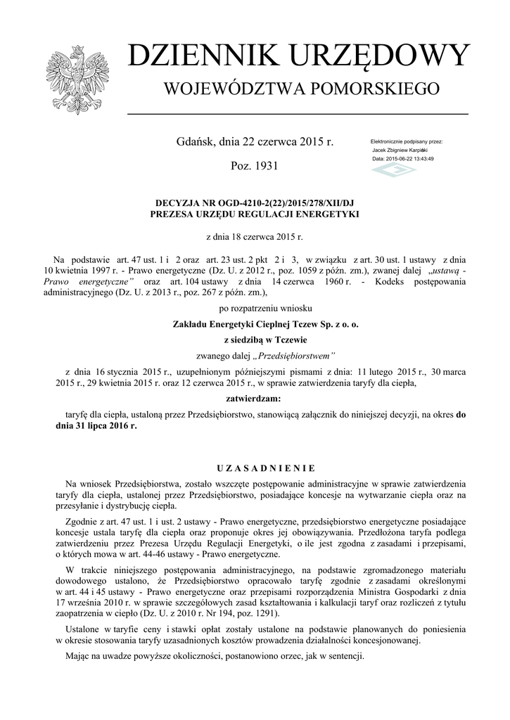 DZIENNIK URZĘDOWY WOJEWÓDZTWA POMORSKIEGO Gdańsk, dnia 22 czerwca 2015 r. Elektronicznie podpisany przez: Jacek Zbigniew Karpiński Poz. 1931 Data: 2015-06-22 13:43:49 DECYZJA NR OGD-4210-2(22)/2015/278/XII/DJ PREZESA URZĘDU REGULACJI ENERGETYKI z dnia 18 czerwca 2015 r. Na podstawie art. 47 ust. 1 i 2 oraz art. 23 ust. 2 pkt 2 i 3, w związku z art. 30 ust. 1 ustawy z dnia 10 kwietnia 1997 r. - Prawo energetyczne (Dz. U. z 2012 r., poz. 1059 z późn. zm.), zwanej dalej „ustawą Prawo energetyczne” oraz art. 104 ustawy z dnia 14 czerwca 1960 r. - Kodeks postępowania administracyjnego (Dz. U. z 2013 r., poz. 267 z późn. zm.), po rozpatrzeniu wniosku Zakładu Energetyki Cieplnej Tczew Sp. z o. o. z siedzibą w Tczewie zwanego dalej „Przedsiębiorstwem” z dnia 16 stycznia 2015 r., uzupełnionym późniejszymi pismami z dnia: 11 lutego 2015 r., 30 marca 2015 r., 29 kwietnia 2015 r. oraz 12 czerwca 2015 r., w sprawie zatwierdzenia taryfy dla ciepła, zatwierdzam: taryfę dla ciepła, ustaloną przez Przedsiębiorstwo, stanowiącą załącznik do niniejszej decyzji, na okres do dnia 31 lipca 2016 r. UZASADNIENIE Na wniosek Przedsiębiorstwa, zostało wszczęte postępowanie administracyjne w sprawie zatwierdzenia taryfy dla ciepła, ustalonej przez Przedsiębiorstwo, posiadające koncesje na wytwarzanie ciepła oraz na przesyłanie i dystrybucję ciepła. Zgodnie z art. 47 ust. 1 i ust. 2 ustawy - Prawo energetyczne, przedsiębiorstwo energetyczne posiadające koncesje ustala taryfę dla ciepła oraz proponuje okres jej obowiązywania. Przedłożona taryfa podlega zatwierdzeniu przez Prezesa Urzędu Regulacji Energetyki, o ile jest zgodna z zasadami i przepisami, o których mowa w art. 44-46 ustawy - Prawo energetyczne. W trakcie niniejszego postępowania administracyjnego, na podstawie zgromadzonego materiału dowodowego ustalono, że Przedsiębiorstwo opracowało taryfę zgodnie z zasadami określonymi w art. 44 i 45 ustawy - Prawo energetyczne oraz przepisami rozporządzenia Ministra Gospodarki z dnia 17 września 2010 r. w sprawie szczegółowych zasad kształtowania i kalkulacji taryf oraz rozliczeń z tytułu zaopatrzenia w ciepło (Dz. U. z 2010 r. Nr 194, poz. 1291). Ustalone w taryfie ceny i stawki opłat zostały ustalone na podstawie planowanych do poniesienia w okresie stosowania taryfy uzasadnionych kosztów prowadzenia działalności koncesjonowanej. Mając na uwadze powyższe okoliczności, postanowiono orzec, jak w sentencji. Dziennik Urzędowy Województwa Pomorskiego –2– Poz. 1931 _______________________________________________________________________________________________________________ POUCZENIE 1) Od niniejszej decyzji przysługuje odwołanie do Sądu Okręgowego w Warszawie - Sądu Ochrony Konkurencji i Konsumentów, za pośrednictwem Prezesa URE, w terminie dwutygodniowym od dnia jej doręczenia (art. 30 ust. 2 i 3 ustawy - Prawo energetyczne oraz art. 47946 pkt 1 i art. 47947 § 1 Kodeksu postępowania cywilnego). Odwołanie należy przesłać na adres Północnego Oddziału Terenowego Urzędu Regulacji Energetyki - ul. Okopowa 7, 80-819 Gdańsk. 2) Odwołanie od decyzji powinno czynić zadość wymaganiom przepisanym dla pisma procesowego oraz zawierać oznaczenie zaskarżonej decyzji i wartości przedmiotu sporu, przytoczenie zarzutów, zwięzłe ich uzasadnienie, wskazanie dowodów, a także zawierać wniosek o uchylenie albo zmianę decyzji w całości lub w części (art. 47949 Kodeksu postępowania cywilnego). 3) Stosownie do art. 47 ust. 3 w związku z art. 31 ust. 4 ustawy – Prawo energetyczne, taryfa zostanie skierowana do ogłoszenia w Dzienniku Urzędowym Województwa Pomorskiego. 4) Stosownie do art. 47 ust. 4 ustawy - Prawo energetyczne, Przedsiębiorstwo wprowadza taryfę do stosowania nie wcześniej niż po upływie 14 dni i nie później niż do 45 dnia od dnia jej opublikowania. Z upoważnienia Prezesa Urzędu Regulacji Energetyki Dyrektor Północnego Oddziału Terenowego Urzędu Regulacji Energetyki z siedzibą w Gdańsku Mirosława Szatybełko-Połom K. o.: 1) Zakład Energetyki Cieplnej Tczew Sp. z o. o., ul. Rokicka 16, 83-110 Tczew na ręce Pełnomocnika Rafała Ruszczyńskiego 2) Wojewoda Pomorski, ul. Okopowa 21/27, 80-810 Gdańsk 3) a/a Uiszczono opłatę skarbową w wysokości 10 zł w dniu 12.01.2015 r. na rachunek: 95 1030 1508 0000 0005 5002 4055 Starszy Specjalista w Północnym Oddziale Terenowym Urzędu Regulacji Energetyki z siedzibą w Gdańsku Daniel Jankiewicz Dziennik Urzędowy Województwa Pomorskiego –3– Poz. 1931 _______________________________________________________________________________________________________________ ZAKŁAD ENERGETYKI CIEPLNEJ Tczew Spółka z o.o. Taryfa dla ciepła NINIEJSZA TARYFA STANOWI ZAŁĄCZNIK DO DECYZJI PREZESA URE z dnia 18 czerwca 2015 r. nr OGD–4210–2(22)/2015/278/XII/DJ Z upoważnienia Prezesa Urzędu Regulacji Energetyki DYREKTOR Północnego Oddziału Terenowego Urzędu Regulacji Energetyki z siedzibą w Gdańsku Mirosława Szatybełko-Połom 2015 r. Dziennik Urzędowy Województwa Pomorskiego –4– Poz. 1931 _______________________________________________________________________________________________________________ SPIS TREŚCI strona CZĘŚĆ I Objaśnienia pojęć i skrótów używanych w taryfie. 3 CZĘŚĆ II Zakres działalności gospodarczej związanej z zaopatrzeniem w ciepło. 5 CZĘŚĆ III Podział odbiorców na grupy. 5 CZĘŚĆ IV Rodzaje oraz wysokość cen i stawek opłat. 6 CZĘŚĆ V Warunki stosowania cen i stawek opłat. 9 CZĘŚĆ VI Zasady wprowadzania cen i stawek opłat. 9 Dziennik Urzędowy Województwa Pomorskiego –5– Poz. 1931 _______________________________________________________________________________________________________________ CZĘŚĆ I Objaśnienia pojęć i skrótów używanych w taryfie. A. Użyte w taryfie pojęcia oznaczają: ¨ ustawa – ustawę z dnia 10 kwietnia 1997 r. - Prawo energetyczne (Dz. U. z 20