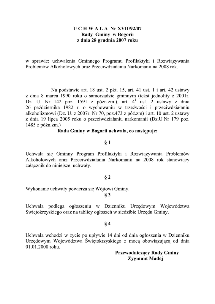 U C H W A Ł A Nr XVII/92/07 Rady Gminy w Bogorii z dnia 28 grudnia 2007 roku w sprawie: uchwalenia Gminnego Programu Profilaktyki i Rozwiązywania Problemów Alkoholowych oraz Przeciwdziałania Narkomanii na 2008 rok. Na podstawie art. 18 ust. 2 pkt. 15, art. 41 ust. 1 i art. 42 ustawy z dnia 8 marca 1990 roku o samorządzie gminnym (tekst jednolity z 2001r. Dz. U. Nr 142 poz. 1591 z późn.zm.), art. 41 ust. 2 ustawy z dnia 26 października 1982 r. o wychowaniu w trzeźwości i przeciwdziałaniu alkoholizmowi (Dz. U. z 2007r. Nr 70, poz.473 z póź.zm) i art. 10 ust. 2 ustawy z dnia 19 lipca 2005 roku o przeciwdziałaniu narkomanii (Dz.U.Nr 179 poz. 1485 z późn.zm.) Rada Gminy w Bogorii uchwala, co następuje: §1 Uchwala się Gminny Program Profilaktyki i Rozwiązywania Problemów Alkoholowych oraz Przeciwdziałania Narkomanii na 2008 rok stanowiący załącznik do niniejszej uchwały. §2 Wykonanie uchwały powierza się Wójtowi Gminy. §3 Uchwała podlega ogłoszeniu w Dzienniku Urzędowym Województwa Świętokrzyskiego oraz na tablicy ogłoszeń w siedzibie Urzędu Gminy. §4 Uchwała wchodzi w życie po upływie 14 dni od dnia ogłoszenia w Dzienniku Urzędowym Województwa Świętokrzyskiego z mocą obowiązującą od dnia 01.01.2008 roku. Przewodniczący Rady Gminy Zygmunt Madej Załącznik do Uchwały Nr XVII/92/07 Rady Gminy w Bogorii z dnia 28 grudnia 2007 r. GMINNY PROGRAM PROFILAKTYKI I ROZWIĄZYWANIA PROBLEMÓW ALKOHOLOWYCH ORAZ PRZECIWDZIAŁANIA NARKOMANII NA 2008 r. W oparciu o „Ustawę o wychowaniu w trzeźwości i przeciwdziałaniu alkoholizmowi” z dnia 26 października 1982 roku (tj. Dz.U. z 2007 roku Nr 70 poz. 473 z późniejszymi zmianami) oraz ustawy z dnia 29 lipca 2005 roku o przeciwdziałaniu narkomanii ( Dz. U. Nr 179 poz. 1485 z późniejszymi zmianami) Rada Gminy w Bogorii dla zmniejszenia problemów związanych ze spożyciem napojów alkoholowych, przeciwdziałaniu narkomanii uznaje za celowe podjęcie działań związanych z profilaktyką i rozwiązywaniem problemów alkoholowych i przeciwdziałaniu narkomanii. ZADANIA GMINNEJ KOMISJI PROFILAKTYKI i ROZWIĄZYWANIA PROBLEMÓW ALKOHOLOWYCH ORAZ PRZECIWDZIAŁANIA NARKOMANII Prowadzenie działań związanych z profilaktyką i rozwiązywaniem problemów alkoholowych i przeciwdziałaniu narkomanii należy do zadań własnych gminy. Zadania te realizowane są w ramach „Gminnego Programu Profilaktyki i Rozwiązywania Problemów Alkoholowych” i „ Przeciwdziałaniu Narkomanii”. W szczególności zadania te obejmują: Zadanie I Zwiększenie dostępności pomocy terapeutycznej i rehabilitacyjnej dla osób uzależnionych od alkoholu i narkotyków oraz dla rodzin w których występuje przemoc: 1. Systematyczne szkolenia i kursy dla członków Gminnej Komisji Problemów Alkoholowych oraz Przeciwdziałania Narkomanii ds. Rozwiązywania 2. Zapewnienie informacji o możliwościach korzystania z usług terapeutycznych dla osób uzależnionych i ich rodzin, 3. Pomoc osobom uzależnionym od alkoholu i narkotyków, które podjęły się leczenia lub rehabilitacji. 4. Rozpoznanie zjawiska przemocy domowej, udzielenie stosownego wsparcia i informacji o możliwościach uzyskania pomocy i powstrzymania przemocy. 5. Inicjowanie interwencji w przypadku diagnozy przemocy domowej. Zadanie II Wspieranie psychospołeczne i prawne rodzin, w których w związku z nadużywaniem alkoholu i narkotyków występuje przemoc : 1. Organizacja świetlic opiekuńczo-wychowawczych dla dzieci i młodzieży oraz doposażenie ich w sprzęt i pomoce niezbędne do prowadzenia zajęć terapeutycznych i profilaktycznych, 2. Dofinansowanie w miarę potrzeb wyżywienia dzieci i młodzieży w szkołach z rodzin zagrożonych alkoholizmem, 3. Upowszechnienie wiedzy (ulotki, plakaty) o możliwościach i procedurze administracyjnoprawnej kierowania osób uzależnionych na przymusowe leczenie odwykowe oraz działaniach jakie może podjąć osoba doznająca przemocy w celu powstrzymania i uwolnienia od przemocy jak i od sprawcy, 4. Dofinansowanie szkoleń i kursów specjalistycznych zwiększających kompetencje osób zajmujących się pomaganiem ofiarom przemocy, 5. Zorganizowanie dla nauczycieli z terenu gminy kursu specjalistycznego w zakresie pracy profilaktycznej z dziećmi i młodzieżą oraz rozwijanie umiejętności prowadzenia zajęć profilaktycznych, 6. Współpraca z policją i pomocą społeczną w zakresie wdrażania „Niebieskich Kart” celem rozpoznania zaburzeń życia rodzinnego wywołanych nadużywaniem alkoholu i stosowanie przemocy oraz wdrażanie procedur interwencji pracowników lecznictwa odwykowego w przypadkach przemocy domowej, 7. Współpraca z przedstawicielami wymiaru sprawiedliwości w zakresie przeciwdziałania przemocy w rodzinie: kuratorem, prokuratorem i sędziami. Zadanie III Prowadzenie działalności profilaktycznej, edukacyjnej w zakresie rozwiązywania problemów alkoholowych i przeciwdziałania narkomanii wśród mieszkańców gminy, a w szczególności młodzieży i dzieci: 1. Realizowanie i finansowanie ogólnopolskich programów z profilaktyki uzależnień, 2. Zakup materiałów informacyjno-edukacyjnych. 3. Organizowanie lokalnych imprez rozrywkowych, sportowych, wystaw dla dzieci i młodzieży na tematy związane z profilaktyką problemów alkoholowych w szkołach przy współpracy z Ośrodkiem Pomocy Społecznej w Bogorii i Gminnym Ośrodkiem Kultury w Bogorii, 4. Pomoc finansowa w organizowaniu form spędzania wolnego czasu poprzez organizowanie wakacyjnych obozów wypoczynkowo-terapeutycznych, 5. Pomoc finansowa w organizacji wyjazdów dzieci i młodzieży z rodzin patologicznych do teatrów, kin i innych imprez kulturalnych, celem pokazania sposobu spędzania wolnego czasu i rozwijania doznań estetycznych, 6. Dofinansowanie do zakupu sprzętu sportowego wykorzystywanego do organizowania zajęć sportowych w ramach „Szkolnych Programów Profilaktyki”, 7. Wspieranie działań profilaktycznych szk