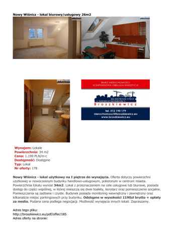 Nowy Wiśnicz - lokal biurowy/usługowy 26m2 Wynajem: Lokale Powierzchnia: 34 m2 Cena: 1.190 PLN/m-c Dostępność: Dostępne Typ: Lokal Nr oferty: 178 Nowy Wiśnicz - lokal użytkowy na I piętrze do wynajęcia. Oferta dotyczy powierzchni użytkowej w nowoczesnym budynku handlowo-usługowym, położonym w centrum miasta. Powierzchnia lokalu wynosi 34m2. Lokal z przeznaczeniem na cele usługowe lub biurowe, posiada dostęp do części wspólnej, w której mieszczą się dwie toalety, korytarz oraz pomieszczenie socjalne. Pomieszczenia są zadbane i czyste. Budynek posiada monitoring wewnętrzny i zewnętrzny oraz kilkanaście miejsc parkingowych przy budynku. Odstępne w wysokości 1190zł brutto + opłaty za media. Podana cena podlega negocjacji. Możliwość wynajęcia innych lokali. Zapraszamy. Adres tego pliku: http://broszkiewicz.eu/pdf/offer/185 Adres oferty na stronie: http://broszkiewicz.eu/site/offers/show/185/nowy-wisnicz-lokal-biurowy/uslugowy-26m2.html