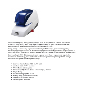 Zszywacz elektryczny nowej generacji Rapid 5050, ze zszywkami w kasecie. Mechanizm zszywacza opracowany przez firmę Rapid jest instalowany w wielu kserokopiarkach oraz automatycznych urządzeniach poligraficznych i przemysłowych. Cichy, trwały i niezawodny, w połączeniu z kasetą na 5.000 zszyć, pozwala na wygodną i bezawaryjną pracę przez wiele lat. Wraz z kasetą wymienione zostają elementy zużywające się w trakcie zszywania, co znacznie wydłuża trwałość samego zszywacza i podnosi jego bezawaryjność. Zszywacz Rapid 5050 działa automatycznie poprzez wyzwalacz o regulowanej głębokości zadziałania. Dostarczany jest z zasilaczem sieciowym i pełną kasetą ze zszywkami. Istnieje możliwość dokupienia pedału wyzwalającego. • • • • • • • • • Zszywki: Kaseta Rapid 5050 - 5.000 sztuk Zasilanie: 230V/24V - zasilacz Wyzwalanie: automatyczne Wymiary: (Dł.) 245mm (Szer.) 120mm (Wys.) 160mm Waga: 2,2 kg Pojemność magazynka: 5.000 Kolory: biały, pomarańczowo-szary Głębokość zszywania: 50 mm Grubość pliku: 50 kartek