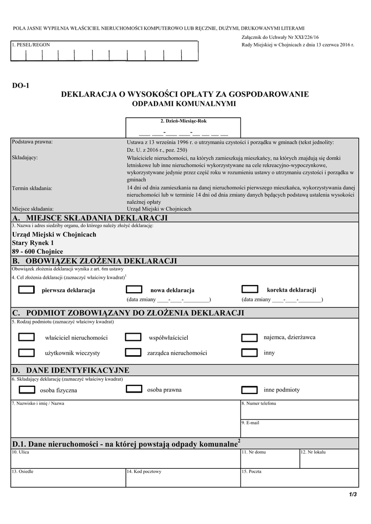 POLA JASNE WYPEŁNIA WŁAŚCICIEL NIERUCHOMOŚCI KOMPUTEROWO LUB RĘCZNIE, DUŻYMI, DRUKOWANYMI LITERAMI Załącznik do Uchwały Nr XXI/226/16 Rady Miejskiej w Chojnicach z dnia 13 czerwca 2016 r. 1. PESEL/REGON DO-1 DEKLARACJA O WYSOKOŚCI OPŁATY ZA GOSPODAROWANIE ODPADAMI KOMUNALNYMI 2. Dzień-Miesiąc-Rok ___ ___-___ ___-__ __ __ __ Podstawa prawna: Składający: Termin składania: Miejsce składania: Ustawa z 13 września 1996 r. o utrzymaniu czystości i porządku w gminach (tekst jednolity: Dz. U. z 2016 r., poz. 250) Właściciele nieruchomości, na których zamieszkują mieszkańcy, na których znajdują się domki letniskowe lub inne nieruchomości wykorzystywane na cele rekreacyjno-wypoczynkowe, wykorzystywane jedynie przez część roku w rozumieniu ustawy o utrzymaniu czystości i porządku w gminach 14 dni od dnia zamieszkania na danej nieruchomości pierwszego mieszkańca, wykorzystywania danej nieruchomości lub w terminie 14 dni od dnia zmiany danych będących podstawą ustalenia wysokości należnej opłaty Urząd Miejski w Chojnicach A. MIEJSCE SKŁADANIA DEKLARACJI 3. Nazwa i adres siedziby organu, do którego należy złożyć deklarację: Urząd Miejski w Chojnicach Stary Rynek 1 89 - 600 Chojnice B. OBOWIĄZEK ZŁOŻENIA DEKLARACJI Obowiązek złożenia deklaracji wynika z art. 6m ustawy 4. Cel złożenia deklaracji (zaznaczyć właściwy kwadrat)1 pierwsza deklaracja korekta deklaracji nowa deklaracja (data zmiany ____-____-_________) (data zmiany ____-____-________) C. PODMIOT ZOBOWIĄZANY DO ZŁOŻENIA DEKLARACJI 5. Rodzaj podmiotu (zaznaczyć właściwy kwadrat) właściciel nieruchomości współwłaściciel najemca, dzierżawca użytkownik wieczysty zarządca nieruchomości inny osoba prawna inne podmioty D. DANE IDENTYFIKACYJNE 6. Składający deklarację (zaznaczyć właściwy kwadrat) osoba fizyczna 7. Nazwisko i imię / Nazwa 8. Numer telefonu 9. E-mail D.1. Dane nieruchomości - na której powstają odpady komunalne2 10. Ulica 13. Osiedle 11. Nr domu 14. Kod pocztowy 12. Nr lokalu 15. Poczta 1/3 D.2. Adres do korespondencji - jeżeli jest inny, niż adres nieruchomości z D.1. 16. Kraj 17. Województwo 18. Powiat 19. Gmina 20. Ulica 21. Nr domu 23. Miejscowość 24. Kod pocztowy 25. Poczta 22. Nr lokalu E. OPŁATA ZA GOSPODAROWANIE ODPADAMI KOMUNALNYMI Oświadczam, iż odpady z nieruchomości będą zbierane zgodnie z regulaminem w sposób (zaznaczyć właściwy kwadrat)3: selektywny zmieszany 26. Czy nieruchomość wyposażona jest w kompostownik? tak nie Stawka opłaty określona jest w uchwale Rady Miejskiej w Chojnicach w sprawie wyboru metody ustalenia opłaty za gospodarowanie odpadami komunalnymi i stawki tej opłaty: E.1. Dotyczy nieruchomości zamieszkałych 4 Stawka opłaty od mieszkańca miesięcznie, zamieszkującego w gospodarstwie domowym liczącym do 4 osób 27a Stawka opłaty za piatą osobę zamieszkałą w gospodarstwie domowym 27b Stawka opłaty za szóstą i każdą kolejną osobę zamieszkałą w gospodarstwie domowym 27c zł/osobę zł/osobę zł/osobę Liczba osób zamieszkujących nieruchomość wskazaną w części D.1. Liczba osób zamieszkujących w gospodarstwie domowym liczącym do 4 osób 28a Piąta osoba zamieszkująca w gospodarstwie domowym5 28b Liczba osób zamieszkujących w gospodarstwie domowym liczącym sześć osób i więcej 28c Miesięczna kwota opłaty Miesięczna kwota opłaty (kwotę z poz. 27a należy pomnożyć przez liczbę osób wskazaną w poz. 28a) 29a Miesięczna kwota opłaty (kwotę z poz. 27b należy pomnożyć przez liczbę osób wskazaną w poz. 28b) 29b Miesięczna kwota opłaty (kwotę z poz. 27c należy pomnożyć przez liczbę osób wskazaną w poz. 28c) 29c RAZEM6 (suma pozycji 29a,29b,29c): zł/miesiąc zł/miesiąc zł/miesiąc 30. zł/miesiąc _______________________________________________________________ E.2. Dotyczy nieruchomości, na których znajdują się domki letniskowe lub innych nieruchomości wykorzystywanych na cele rekreacyjno-wypoczynkowe, wykorzystywanych jedynie przez część roku 7 Stawka opłaty 31 Ilość domków letniskowych lub innych nieruchomości wykorzystywanych na cele rekreacyjno-wypoczynkowe 32 Roczna kwota opłaty (stawkę z poz. 31 należy pomnożyć przez liczbę wskazaną w poz. 32) 33 zł szt zł POUCZENIE Zgodnie z przepisami ustawy z 17 czerwca 1966 r. o postępowaniu egzekucyjnym w administracji (tj. Dz.U. z 2016 r. poz. 599) niniejsza deklaracja stanowi podstawę do wystawienia tytułu wykonawczego. Niezłożenie deklaracji o wysokości opłaty za gospodarowanie odpadami komunalnymi albo w przypadku uzasadnionych wątpliwości co do danych zawartych w deklaracji właściwy organ określi, w drodze decyzji, wysokość opłaty za gospodarowanie odpadami komunalnymi, biorąc pod uwagę dostępne dane właściwe dla wybranej metody, a w przypadku ich braku- uzasadnione szacunki. (art. 6o ustawy z dnia 13 września 1996 r. o utrzymaniu czystości i porządku w gminach). Zgodnie z postanowieniami Regulaminu utrzymania czystości i porządku na terenie miasta Chojnice pojemniki powinny być usytuowane w obrębie nieruchomości, a w dniu odbioru powinny być wystawione przed nieruchomość w sposób umożliwiający ich odbiór z zastrzeżeniem, iż nie mogą one zagrażać i utrudniać ruchu zarówno pieszego jak i samochodowego. 2/3 F. OŚWIADCZENIE I PODPIS OSOBY SKŁADAJĄCEJ DEKLARACJĘ Oświadczam, że są mi znane przepisy Kodeksu karnego skarbowego o odpowiedzialności za podanie danych niezgodnych z rzeczywistością. 34. Data 35. Czytelny podpis (z podaniem imienia i nazwiska; pieczątki osoby upoważnionej) G. ADNOTACJE ORGANU H. OBJAŚNIENIA 1. Cel złożenia deklaracji: a) pierwsza deklaracja - właściciel nieruchomości jest obowiązany złożyć ją w terminie 14 dni od dnia zamieszkania na danej nieruchomości pierwszego mieszkańca lub jej wykorzystywania b) nowa deklaracja - właściciel nieruchomości jest obowiązany złożyć ją w przypadk