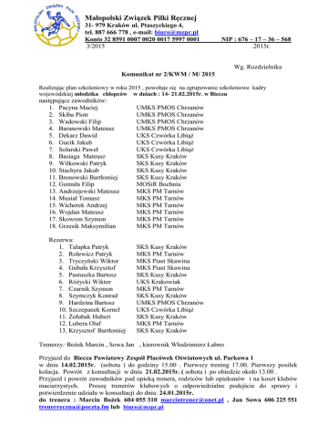 Małopolski Związek Piłki Ręcznej 31- 979 Kraków ul. Ptaszyckiego 4, tel. 887 666 778 , e-mail: [email protected] Konto 32 8591 0007 0020 0017 5997 0001 3/2015 NIP : 676 – 17 – 36 – 568 .2015r. Wg. Rozdzielnika Komunikat nr 2/KWM / M/ 2015 Realizując plan szkoleniowy w roku 2015 , powołuje się na zgrupowanie szkoleniowe kadry wojewódzkiej młodzika chłopców w dniach : 14- 21.02.2015r. w Bieczu następujące zawodników: 1. Pacyna Maciej 2. Skiba Piotr 3. Wadowski Filip 4. Baranowski Mateusz 5. Dekarz Dawid 6. Gucik Jakub 7. Solarski Paweł 8. Basiaga Mateusz 9. Wilkowski Patryk 10. Stachyra Jakub 11. Bronowski Bartłomiej 12. Gumuła Filip 13. Andrzejewski Mateusz 14. Musiał Tomasz 15. Wicherek Andrzej 16. Wojdan Mateusz 17. Skowron Szymon 18. Grzesik Maksymilian Rezerwa: 1. Talapka Patryk 2. Rolewicz Patryk 3. Tryczyński Wiktor 4. Gubała Krzysztof 5. Pastuszka Bartosz 6. Różycki Wiktor 7. Czarnik Szymon 8. Szymczyk Konrad 9. Hardzina Bartosz 10. Szczepanek Kornel 11. Żołubak Hubert 12. Lubera Olaf 13. Krzysztof Bartłomiej UMKS PMOS Chrzanów UMKS PMOS Chrzanów UMKS PMOS Chrzanów UMKS PMOS Chrzanów UKS Czwórka Libiąż UKS Czwórka Libiąż UKS Czwórka Libiąż SKS Kusy Kraków SKS Kusy Kraków SKS Kusy Kraków SKS Kusy Kraków MOSiR Bochnia MKS PM Tarnów MKS PM Tarnów MKS PM Tarnów MKS PM Tarnów MKS PM Tarnów MKS PM Tarnów SKS Kusy Kraków MKS PM Tarnów MKS Piast Skawina MKS Piast Skawina SKS Kusy Kraków UKS Krakowiak MKS PM Tarnów SKS Kusy Kraków UMKS PMOS Chrzanów UKS Czwórka Libiąż SKS Kusy Kraków MKS PM Tarnów SKS Kusy Kraków Trenerzy: Bożek Marcin , Sowa Jan , kierownik Włodzimierz Łabno Przyjazd do Biecza Powiatowy Zespół Placówek Oświatowych ul. Parkowa 1 w dniu 14.02.2015r. (sobota ) do godziny 15.00 . Pierwszy trening 17.00. Pierwszy posiłek kolacja. Powrót z konsultacji w dniu 21.02.2015r. ( sobota ) po obiedzie około 13.00 . Przyjazd i powrót zawodników pod opieką trenera, rodziców lub opiekunów i na koszt klubów macierzystych. Proszę trenerów klubowych o odpowiedzialne podejście do sprawy i potwierdzenie udziału w konsultacji do dnia: 24.01.2015r. do trenera : Marcin Bożek 604 055 310 [email protected] , Jan Sowa 606 225 551 [email protected] lub [email protected] Zawodnicy muszą posiadać: obuwie sportowe ,piłkę, ubiór stosowny do pory roku i kąpielówki . Wymóg podstawowy – każdy zawodnik bezwzględnie posiadać musi aktualną kartę zdrowia podbitą przez upoważnionego lekarza oraz kartę zawodniczą . Każdy zawodnik zgodnie z decyzja Zarządu MZPR po konsultacji z Radą Trenerów dokonuje dopłaty , która pokrywana jest przez klub lub rodziców . Dopłata do konsultacji 200,00zł od zawodnika .Wpłatę należy dokonać gotówką w dniu przyjazdu na konsultację lub na konto MZPR : 32 8591 0007 0020 0017 5997 0001 – w dopisku nazwisko zawodnika. Ze sportowym pozdrowieniem Zbigniew Gorączko – Prezes MZPR