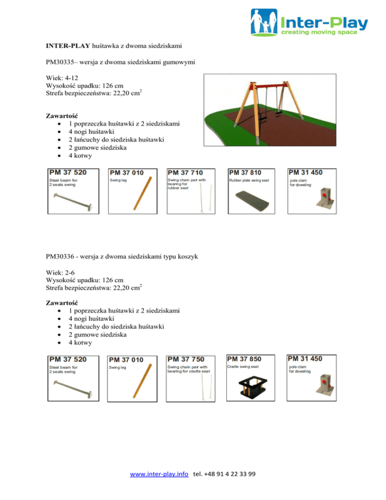 INTER-PLAY huśtawka z dwoma siedziskami PM30335– wersja z dwoma siedziskami gumowymi Wiek: 4-12 Wysokość upadku: 126 cm Strefa bezpieczeństwa: 22,20 cm2 Zawartość 1 poprzeczka huśtawki z 2 siedziskami 4 nogi huśtawki 2 łańcuchy do siedziska huśtawki 2 gumowe siedziska 4 kotwy PM30336 - wersja z dwoma siedziskami typu koszyk Wiek: 2-6 Wysokość upadku: 126 cm Strefa bezpieczeństwa: 22,20 cm2 Zawartość 1 poprzeczka huśtawki z 2 siedziskami 4 nogi huśtawki 2 łańcuchy do siedziska huśtawki 2 gumowe siedziska 4 kotwy www.inter-play.info tel. +48 91 4 22 33 99 PM30337 - wersja z jednym siedziskiem gumowym i jednym siedziskiem typu koszyk Wiek: 2-12 Wysokość upadku: 126 cm Strefa bezpieczeństwa: 22,20 cm2 Zawartość 1 poprzeczka huśtawki z 2 siedziskami 4 nogi huśtawki 2 łańcuchy do siedziska huśtawki 1 gumowe siedzisko, 1 siedzisko typu koszyk 4 kotwy Część rysunkowa www.inter-play.info tel. +48 91 4 22 33 99 CHARAKTERYSTYKA Elementy drewniane Najwyższej jakości sosna Północna Technologia drewna klejonego odpornego na pęknięcia Zabezpieczenie przeciw wilgotnościowe Połączenie z gruntem za pomocą metalowych kotew Elementy metalowe Elektrostatyczne malowanie proszkowe Stabilne na promienie UV, nieblaknące Galwanizowane na gorąco elementy łącznikowe oraz kotwy Galwanizowane uchwyty Panele Odporne na wilgoć oraz na działanie promieni UV plastikowe panele wykonane z HDPE Grubości 10, 15 oraz 19 mm Przyjazne środowisku, wykonane z recyklingu Platformy pokryte antypoślizgową “brązową” powłoką, lub drewniane Zjeżdżalnia Boki wykonane z tworzywa HPDE Ślizg wykonany ze stali nierdzewnej (INOX inlay) Lub z polipropylenu (PP) Liny i sieci Spełniające wymagania TŰV, odporne na przecinanie 6-rzyłowe, skręcone, stalowe rdzenie lin Liny: Ø 16 mm, 6x8x0,70, pokryte kolorowymi włóknami polipropylenowymi Wytłaczane stalowe końcówki lin, galwanizowane element łączące Plastikowe element łączące i akcesoria Akcesoria Galwanizowane śruby oraz inne element montażowe Plastikowe uchwyty i podnóżki są wewnątrz metalowe Siedziska huśtawek Bezpieczne gumowe siedziska z miękkimi krawędziami Siedziska koszyki dla małych dzieci Oba typy są zgodne z EN1176 www.inter-play.info tel. +48 91 4 22 33 99
