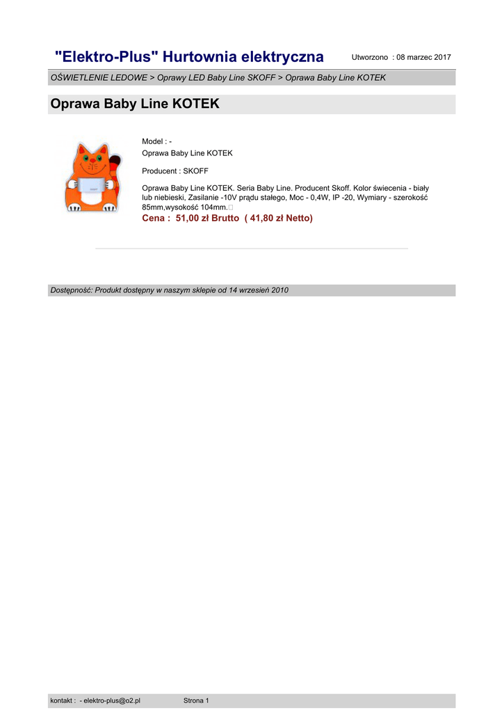"Elektro-Plus" Hurtownia elektryczna Utworzono : 08 marzec 2017 OŚWIETLENIE LEDOWE > Oprawy LED Baby Line SKOFF > Oprawa Baby Line KOTEK Oprawa Baby Line KOTEK Model : Oprawa Baby Line KOTEK Producent : SKOFF Oprawa Baby Line KOTEK. Seria Baby Line. Producent Skoff. Kolor świecenia - biały lub niebieski, Zasilanie -10V prądu stałego, Moc - 0,4W, IP -20, Wymiary - szerokość 85mm,wysokość 104mm.� Cena : 51,00 zł Brutto ( 41,80 zł Netto) Dostępność: Produkt dostępny w naszym sklepie od 14 wrzesień 2010 kontakt : - [email protected] Strona 1