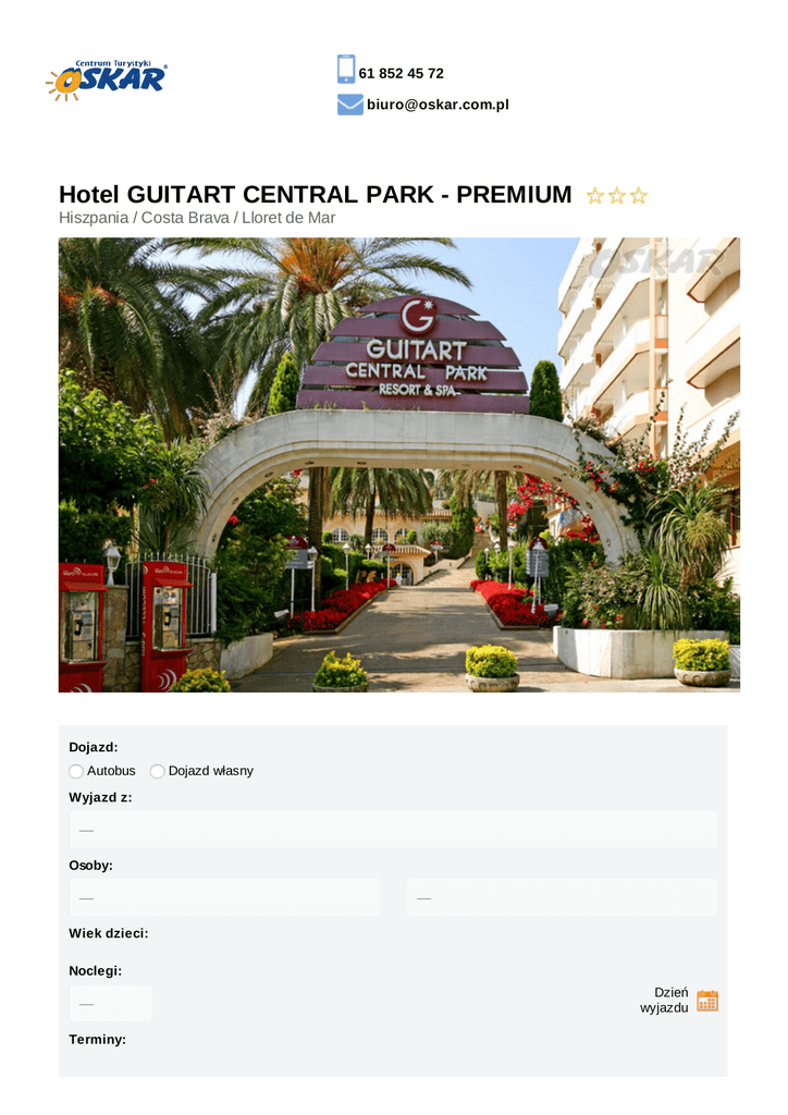61 852 45 72 [email protected] Hotel GUITART CENTRAL PARK - PREMIUM Hiszpania / Costa Brava / Lloret de Mar Dojazd: Autobus Dojazd własny Wyjazd z: Osoby: Wiek dzieci: Noclegi: Dzień wyjazdu Terminy: Pokój: Wyżywienie: Najtańsza oferta First Minute cena katalogowa do 11 marca 2017: 1058,70 zł do 11 marca 2017: 1058,70 zł do 4 maja 2017: 2470,30 zł do 4 maja 2017: 2470,30 zł Suma:3529,00 zł Suma: 3529,00 zł Opis oferty Miejscowość Przejazd autokarem PREMIUM Wycieczki autokar-premium-oskar-tablet-gniazdko-usb-wygodne-fotele fakultatywne Realizacja imprezy autokarami PREMIUM to gwarancja: transportu Opinie autokarami z roczników 2015 i 2016 produkcji Irizar i VDL indywidualnego, multimedialnego systemu rozrywki - tablet z dotykowym ekranem w każdym zagłówku (filmy, gry, muzyka itp.). Możliwość podłączenia własnego nośnika danych poprzez wejście AUX lub USB. najwyższej klasy skórzanych lub półskórzanych foteli z możliwością regulacji oparcia lub/i zagłówka największej w Polsce przestrzeni między siedzeniami małej półki przed każdym siedzeniem + siateczki na czasopisma, książki czy telefon bezpłatnego dostępu do sieci WiFi na terenie Polski* gniazdek elektrycznych 230V wydajnej klimatyzacji sterowanej indywidualnie bogato wyposażonego barku udostępnionego w czasie jazdy WC na pokładzie autokaru Idealna i komfortowa podróż… ZAWSZE! Na ternie Polski GWARANTUJEMY, że wszystkie przejazdy realizowane są autobusem, busem lub samochodem osobowym. Zapewnimy komfortowy transport na każdym etapie podróży. Ważne: Autokar Premium jest autokarem docelowym. *jakość usług internetowych może różnić się w zależności od jakości sygnału Atuty kompleks 5 basenów bezpłatne leżaki i parasole bezpłatne zaplecze sportowo-rekreacyjne wspaniały ogród ze sztucznymi wodospadami i tarasami słonecznymi blisko plaży i centrum Położenie Hotel o standardzie 3* należący do doskonale znanej i rozpoznawalnej na europejskim rynku sieci Hoteli Guitart. Guitart Central Park jest uznawany przez wielu Klientów za najatrakcyjniejszy obiekt hotelowy w Lloret de Mar. Położony zaledwie ok. 400 m od plaży "Fanals" i ok. 400 m. od ścisłego centrum Lloret de Mar gwarantuje łatwy dostęp do wszystkich atrakcji oferowanych przez miejscowość Lloret de Mar. Na terenie hotelu do dyspozycji gości jest aż 5 basenów, z czego 4 są otwarte, a poza sezonem 1 z nich jest podgrzewany i kryty. Otoczenie hotelu to pięknie zagospodarowany teren zielony opływający kwiatami, ozdobnymi krzewami i sztucznymi wodospadami pośród których znajdują się tarasy do kąpieli słonecznych. Bezpłatnie do dyspozycji gości są leżaki i parasole. Bogate zaplecze sportoworekreacyjne w ramach którego bezpłatnie korzystać można z kortów tenisowych, ściany wspinaczkowej, tenisa stołowego. Ponadto za opcjonalną opłatą na miejscu - siłownia, sauna, gabinet masażu, bilard. Ponadto hotel oferuje doskonałą, urozmaiconą kuchnię w formie bufetu oraz bogaty program animacyjny dla swoich gości. Guitart Central Park cieszy się bardzo dobrą opinią Klientów z racji na wykwalifikowaną obsługę, międzynarodową atmosferę, doskonałą lokalizację oraz znakomity stosunek ceny do jakości. Zakwaterowanie Pokoje dwuosobowe z łazienkami z możliwością dostawki. Wszystkie pokoje maja TV, sejf ( za opcjonalną dopłatą na miejscu), telefon, klimatyzację (bezpłatną) oraz balkony lub tarasy. Dostępne opcje zakwaterowania pokój 2 osobowy z możliwością dostawki dokwaterowanie (bez dopłat*) lub pokój 1 osobowy (dopłata) *dokwaterowanie: osoby wybierając się pojedynczo, które w momencie rezerwacji nie dokonują dopłaty do pokoju jednoosobowego, mogą zostać zakwaterowanie z jedną lub kilkoma osobami tej samej płci w tzw. opcji dokwaterowania; jednakże w przypadku braku innej rezerwacji w opcji dokwaterowania w terminie do 7 dni przed rozpoczęciem imprezy wymagana jest dopłata do pokoju 1 osobowego Dostępne opcje wyżywienia Dostępne opcje wyżywienia śniadania (w cenie) obiadokolacje (opcja) Pakiet KOMFORT gwarancja wyboru miejsca w autokarze napoje w autokarze w cenie (6 x do wyboru: kawa, herbata, zimny napój 0,2l) cena: 50 zł/os Pakiet PRESTIGE gwarancja wyboru miejsca w autokarze napoje w autokarze w cenie (6 x do wyboru: kawa, herbata, zimny napój 0,2l) pierwszeństwo wejścia na pokład autokaru nadbagaż 5 kg w cenie suchy prowiant na drogę powrotną cena: 100 zł/os Karta Dużej Rodziny www.oskar.com.pl/zalaczniki/karta_duzej_rodziny Warunki promocji FIRST MINUTE www.oskar.com.pl/zalaczniki/warunki_promocji Ubezpieczenie Warunki ubezpieczenia Bezpieczne Podróże Signal Iduna dokument do pobrania www.oskar.com.pl/zalaczniki/owu Warunki ubezpieczenia Kosztów Imprezy Turystycznej Signal Iduna dokument do pobrania www.oskar.com.pl/zalaczniki/owurg Turystyczny Fundusz Gwarancyjny W związku z powołaniem do życia w dniu 26.11.2016 Turystycznego Funduszu Gwarancyjnego każdy klient Biura Podróży Oskar zobowiązany jest do zapłaty kwoty w wysokości 10zł/os. przy każdorazowej rezerwacji imprezy turystycznej (obowiązuje od dnia 26.11.2016). Kwota przeznaczona na Turystyczny Fundusz Gwarancyjny zostanie automatycznie doliczona do wartości rezerwacji (w momencie jej dokonania). Wyjątkiem są imprezy turystyczne odbywające się w krajach posiadających granicę z Rzeczpospolitą Polską. Składka nie jest przychodem biura. Udogodnienia Klimatyzacja Animacje dla dzieci Regulowane fotele Tacki Multimedia Nowoczesna flota Zawodowy kierowca Pasy bezpieczeństwa Toaleta w autokarze Podnóżki Fitness Dla rodzin z dziećmi Wi-Fi Basen kryty Winda Blisko centrum Życie nocne Bez paszportu Basen odkryty Parking Premium Elite Restauracja hotelowa Region nadmorski Tenis Program ramowy Dzień 1 Wyjazd w Polski zgodnie z rozkładem jazdy autokarów. Przejazd przez Niemcy, Francję. Dzień 2 Przyjazd do Lloret de Mar w godzinach okołopołudniowy