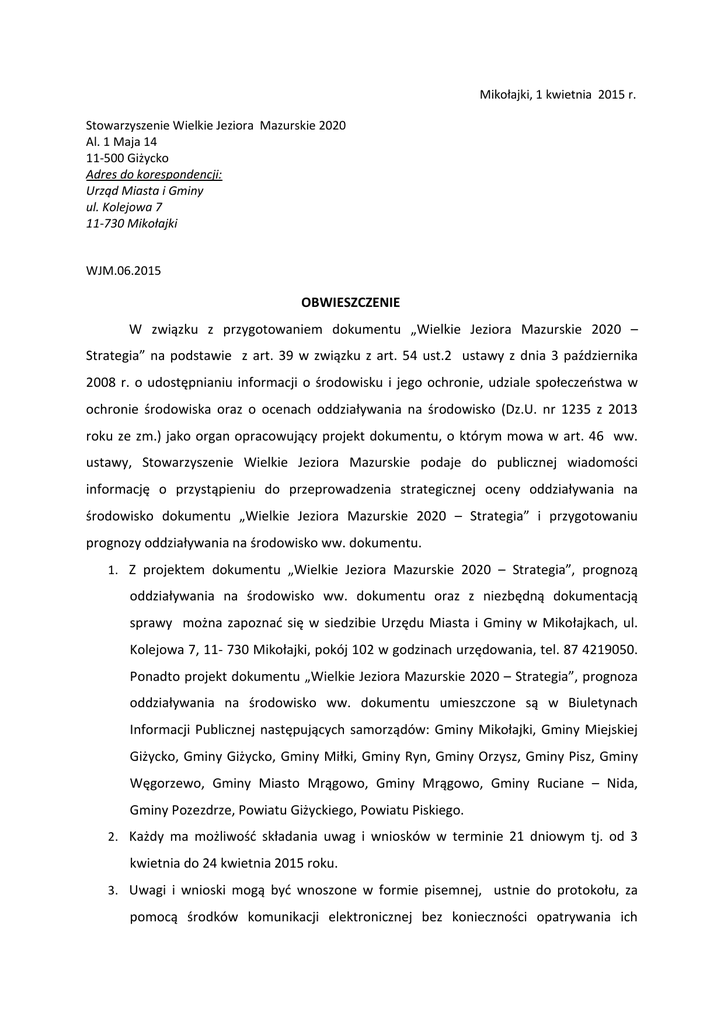 Mikołajki, 1 kwietnia 2015 r. Stowarzyszenie Wielkie Jeziora Mazurskie 2020 Al. 1 Maja 14 11-500 Giżycko Adres do korespondencji: Urząd Miasta i Gminy ul. Kolejowa 7 11-730 Mikołajki WJM.06.2015 OBWIESZCZENIE W związku z przygotowaniem dokumentu „Wielkie Jeziora Mazurskie 2020 – Strategia” na podstawie z art. 39 w związku z art. 54 ust.2 ustawy z dnia 3 października 2008 r. o udostępnianiu informacji o środowisku i jego ochronie, udziale społeczeństwa w ochronie środowiska oraz o ocenach oddziaływania na środowisko (Dz.U. nr 1235 z 2013 roku ze zm.) jako organ opracowujący projekt dokumentu, o którym mowa w art. 46 ww. ustawy, Stowarzyszenie Wielkie Jeziora Mazurskie podaje do publicznej wiadomości informację o przystąpieniu do przeprowadzenia strategicznej oceny oddziaływania na środowisko dokumentu „Wielkie Jeziora Mazurskie 2020 – Strategia” i przygotowaniu prognozy oddziaływania na środowisko ww. dokumentu. 1. Z projektem dokumentu „Wielkie Jeziora Mazurskie 2020 – Strategia”, prognozą oddziaływania na środowisko ww. dokumentu oraz z niezbędną dokumentacją sprawy można zapoznać się w siedzibie Urzędu Miasta i Gminy w Mikołajkach, ul. Kolejowa 7, 11- 730 Mikołajki, pokój 102 w godzinach urzędowania, tel. 87 4219050. Ponadto projekt dokumentu „Wielkie Jeziora Mazurskie 2020 – Strategia”, prognoza oddziaływania na środowisko ww. dokumentu umieszczone są w Biuletynach Informacji Publicznej następujących samorządów: Gminy Mikołajki, Gminy Miejskiej Giżycko, Gminy Giżycko, Gminy Miłki, Gminy Ryn, Gminy Orzysz, Gminy Pisz, Gminy Węgorzewo, Gminy Miasto Mrągowo, Gminy Mrągowo, Gminy Ruciane – Nida, Gminy Pozezdrze, Powiatu Giżyckiego, Powiatu Piskiego. 2. Każdy ma możliwość składania uwag i wniosków w terminie 21 dniowym tj. od 3 kwietnia do 24 kwietnia 2015 roku. 3. Uwagi i wnioski mogą być wnoszone w formie pisemnej, ustnie do protokołu, za pomocą środków komunikacji elektronicznej bez konieczności opatrywania ich bezpiecznym podpisem elektronicznym, o którym mowa w ustawie z dnia 18 września 2001 r. o podpisie elektronicznym. Uwagi i wnioski wnoszone pisemnie lub ustnie do protokołu należy składać w siedzibie Urzędu Miasta i Gminy w Mikołajkach, ul. Kolejowa 7, 11- 730 Mikołajki, pokój 102 w godzinach urzędowania, tel. 87 4219050. Uwagi drogą elektroniczną należy kierować na adres: [email protected] 4. Uwagi lub wnioski złożone po upływie terminu wskazanego w punkcie 2 pozostawione zostaną bez rozpatrzenia. 5. Organem właściwym do rozpatrzenia uwag i wniosków jest Przewodniczący Stowarzyszenie Wielkie Jeziora Mazurskie 2020. Przewodniczący Zarządu Stowarzyszenia Wielkie Jeziora Mazurskie 2020 Piotr Jakubowski Obwieszczenie podaje się do publicznej wiadomości poprzez : - udostępnienie na stronach internetowych/BIP/ samorządów wymienionych w punkcie 1 obwieszczenia; - umieszczenie na tablicach ogłoszeń siedzib samorządów wymienionych w punkcie 1 obwieszczenia;