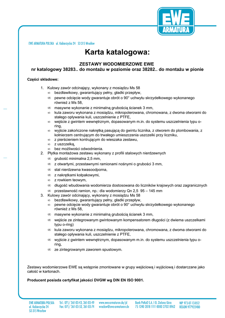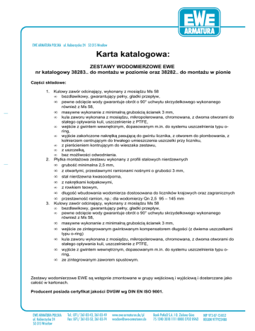 Karta katalogowa: ZESTAWY WODOMIERZOWE EWE nr katalogowy 38283.. do montażu w poziomie oraz 38282.. do montażu w pionie Części składowe: 1. Kulowy zawór odcinający, wykonany z mosiądzu Ms 58 • bezdławikowy, gwarantujący pełny, gładki przepływ, • pewne odcięcie wody gwarantuje obrót o 90° uchwytu skrzydełkowego wykonanego również z Ms 58, • masywne wykonanie z minimalną grubością ścianek 3 mm, • kula zaworu wykonana z mosiądzu, mikropolerowana, chromowana, z dwoma otworami do stałego opływania kuli, uszczelnienie z PTFE, • wejście z gwintem wewnętrznym, dopasowanym m.in. do systemu uszczelnienia typu oring, • wyjście zakończone nakrętką pasującą do gwintu licznika, z otworem do plombowania, z kołnierzem centrującym do trwałego umieszczenia uszczelki przy liczniku, • z pierścieniem kontrującym do wieszaka zestawu, • z uszczelką, • bez możliwości odwodnienia. 2. Płytka montażowa zestawu wykonany z profili stalowych nierdzewnych • grubość minimalna 2,5 mm, • z otwartymi, przestawnymi ramionami nośnymi o grubości 3 mm, • stal nierdzewna kwasoodporna, • z nakrętkami kołpakowymi, • z rowkiem teowym, • długość wbudowania wodomierza dostosowana do liczników krajowych oraz zagranicznych • przestawność ramion, np.: dla wodomierzy Qn 2,5 95 – 145 mm 3. Kulowy zawór odcinający, wykonany z mosiądzu Ms 58 • bezdławikowy, gwarantujący pełny, gładki przepływ, • pewne odcięcie wody gwarantuje obrót o 90° uchwytu skrzydełkowego wykonanego również z Ms 58, • masywne wykonanie z minimalną grubością ścianek 3 mm, • wejście ze zintegrowanym gwintowanym kompensatorem długości (z dwiema uszczelkami typu o-ring) • kula zaworu wykonana z mosiądzu, mikropolerowana, chromowana, z dwoma otworami do stałego opływania kuli, uszczelnienie z PTFE, • wyjście z gwintem wewnętrznym, dopasowanym m.in. do systemu uszczelnienia typu oring, • ze zintegrowanym zaworem spustowym. Zestawy wodomierzowe EWE są wstępnie zmontowane w grupy wejściową i wyjściową i dostarczane jako całość w kartonach. Producent posiada certyfikat jakości DVGW wg DIN EN ISO 9001.