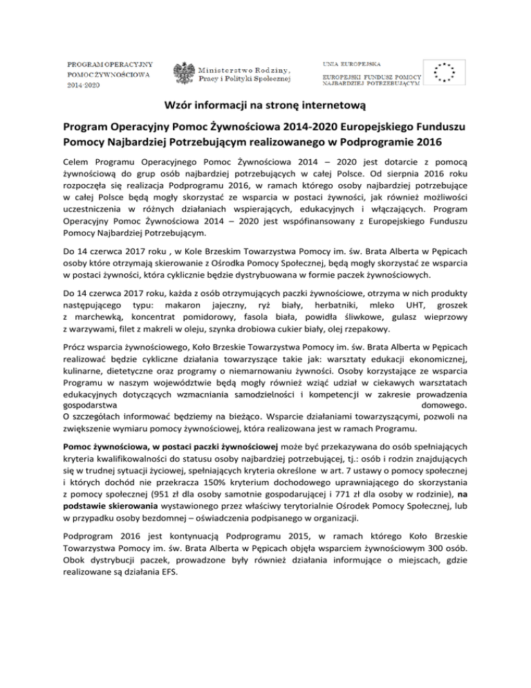 Wzór informacji na stronę internetową Program Operacyjny Pomoc Żywnościowa 2014-2020 Europejskiego Funduszu Pomocy Najbardziej Potrzebującym realizowanego w Podprogramie 2016 Celem Programu Operacyjnego Pomoc Żywnościowa 2014 – 2020 jest dotarcie z pomocą żywnościową do grup osób najbardziej potrzebujących w całej Polsce. Od sierpnia 2016 roku rozpoczęła się realizacja Podprogramu 2016, w ramach którego osoby najbardziej potrzebujące w całej Polsce będą mogły skorzystać ze wsparcia w postaci żywności, jak również możliwości uczestniczenia w różnych działaniach wspierających, edukacyjnych i włączających. Program Operacyjny Pomoc Żywnościowa 2014 – 2020 jest wspófinansowany z Europejskiego Funduszu Pomocy Najbardziej Potrzebującym. Do 14 czerwca 2017 roku , w Kole Brzeskim Towarzystwa Pomocy im. św. Brata Alberta w Pępicach osoby które otrzymają skierowanie z Ośrodka Pomocy Społecznej, będą mogły skorzystać ze wsparcia w postaci żywności, która cyklicznie będzie dystrybuowana w formie paczek żywnościowych. Do 14 czerwca 2017 roku, każda z osób otrzymujących paczki żywnościowe, otrzyma w nich produkty następującego typu: makaron jajeczny, ryż biały, herbatniki, mleko UHT, groszek z marchewką, koncentrat pomidorowy, fasola biała, powidła śliwkowe, gulasz wieprzowy z warzywami, filet z makreli w oleju, szynka drobiowa cukier biały, olej rzepakowy. Prócz wsparcia żywnościowego, Koło Brzeskie Towarzystwa Pomocy im. św. Brata Alberta w Pępicach realizować będzie cykliczne działania towarzyszące takie jak: warsztaty edukacji ekonomicznej, kulinarne, dietetyczne oraz programy o niemarnowaniu żywności. Osoby korzystające ze wsparcia Programu w naszym województwie będą mogły również wziąć udział w ciekawych warsztatach edukacyjnych dotyczących wzmacniania samodzielności i kompetencji w zakresie prowadzenia gospodarstwa domowego. O szczegółach informować będziemy na bieżąco. Wsparcie działaniami towarzyszącymi, pozwoli na zwiększenie wymiaru pomocy żywnościowej, która realizowana jest w ramach Programu. Pomoc żywnościowa, w postaci paczki żywnościowej może być przekazywana do osób spełniających kryteria kwalifikowalności do statusu osoby najbardziej potrzebującej, tj.: osób i rodzin znajdujących się w trudnej sytuacji życiowej, spełniających kryteria określone w art. 7 ustawy o pomocy społecznej i których dochód nie przekracza 150% kryterium dochodowego uprawniającego do skorzystania z pomocy społecznej (951 zł dla osoby samotnie gospodarującej i 771 zł dla osoby w rodzinie), na podstawie skierowania wystawionego przez właściwy terytorialnie Ośrodek Pomocy Społecznej, lub w przypadku osoby bezdomnej – oświadczenia podpisanego w organizacji. Podprogram 2016 jest kontynuacją Podprogramu 2015, w ramach którego Koło Brzeskie Towarzystwa Pomocy im. św. Brata Alberta w Pępicach objęła wsparciem żywnościowym 300 osób. Obok dystrybucji paczek, prowadzone były również działania informujące o miejscach, gdzie realizowane są działania EFS.