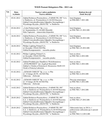 WIOŚ Poznań Delegatura Piła - 2012 rok Lp. Data wydania Nazwa i adres podmiotu Nazwa obiektu Rodzaj decyzji Znak decyzji 1. 05.01.2012 Zakład Rolniczo-Przemysłowy „FARMUTIL HS” S.A. w Śmiłowie, ul. Przemysłowa 4; 64-810 Kaczory Zakład Unieszkodliwiania Odpadów Szczególnego i Wysokiego Ryzyka „EKOUTIL” w Śmiłowie kara biegnąca nr PDI.4401.7.2011.BS 2. 05.04.2012 „Cotta Polsterwerke” Sp. z o.o. ul. Szamotulska 23; 64-600 Oborniki Hala Tapicerni – stanowiska klejarskie kara biegnąca nr PDI.7061.21.2012.BS 3. 26.04.2012 Zakład Rolniczo-Przemysłowy „FARMUTIL HS” S.A. w Śmiłowie, ul. Przemysłowa 4; 64-810 Kaczory Zakład Unieszkodliwiania Odpadów Szczególnego i Wysokiego Ryzyka „EKOUTIL” w Śmiłowie kara biegnąca nr PDI.7061.24.2012.BS 4. 26.04.2012 Philips Lighting Poland S.A. ul. Kossaka 150;64-920 Piła Zakład Komponentów – suszarka piasku kara biegnąca nr PDI.7061.25.2012.BS 5. 01.02.2012 Philips Lighting Poland S.A. ul. Kossaka 150;64-920 Piła Zakład Komponentów – suszarka piasku kara za okres nr PDI.7061.2.2012.BS 6. 01.02.2012 Zakład Produkcyjno Handlowo Wielobranżowy „STOLPRODEX” inż. Zygfryd Skuciński Zakład w Osieku n/Notecią ul. Dworcowa 30;89-333 Osiek n/Notecią Lakiernia kara za okres nr PDI.7061.3.2012.BS 7. 01.02.2012. „GEMAR-UMECH” Sp. z o.o. w Pile ul. 14 lutego 26/30 ; 64-920 Piła Odlewnia – Żeliwiak kara za okres nr PDI.7061.4.2012.BS 8. 01.02.2012 „GEMAR-UMECH” Sp. z o.o. w Pile ul. 14 lutego 26/30; 64-920 Piła Odlewnia – Żeliwiak Decyzja umarzająca nr PDI.7061.5.2012.BS 9. 14.02.2012 Zakład Rolniczo-Przemysłowy „FARMUTIL HS” S.A. w Śmiłowie ul. Przemysłowa 4; 64-810 Kaczory Zakład Unieszkodliwiania Odpadów Szczególnego i Wysokiego Ryzyka „EKOUTIL” w Śmiłowie kara za okres nr PDI.7061.7.2012.BS 10. 28.05.2012 Zakład Rolniczo-Przemysłowy „FARMUTIL HS” S.A. w Śmiłowie ul. Przemysłowa 4; 64-810 Kaczory Zakład Unieszkodliwiania Odpadów Szczególnego i Wysokiego Ryzyka „EKOUTIL” w Śmiłowie kara za okres nr PDI.7061.27.2012.BS 11. 28.05.2012 Zakład Rolniczo-Przemysłowy „FARMUTIL HS” S.A. w Śmiłowie, ul. Przemysłowa 4; 64-810 Kaczory Zakład Unieszkodliwiania Odpadów Szczególnego i Wysokiego Ryzyka „EKOUTIL” w Śmiłowie Odroczenie kary za 2011r. i jednoczesne zaliczenie jej w poczet kosztów nr PDI.7062.3.2.2012.BS 12. 10.01.2012 Artur Lewandowski, zam. 77-400 Złotów, ul. Kopernika 1/7. Decyzja o umorzeniu części kary administracyjnej za dokonanie poza stacją demontażu pojazdów wymontowania z pojazdów wycofanych z eksploatacji przedmiotów wyposażenia i części nadających się do ponownego użycia. PDI.7062.1.7.2011.JK 13. 09.01.2012 Przemysław Grzegorz Szynkiewicz, zam. w m. Prosna 70, 64-840 Prosna, gm. Budzyń Kara administracyjna za dokonanie poza stacją demontażu pojazdów wymontowania z pojazdów wycofanych z eksploatacji przedmiotów wyposażenia i części nadających się do ponownego użycia. PDI.7062.1.17.2011.JK 14. 30.03.2012 Przedsiębiorstwo Produkcyjno-Handlowo- Usługowego „ALMAR”, ul. Mickiewicza 62, 64-761 Krzyż Wlkp., dotyczy: Dyskoteki "PARADISE", ul. Mickiewicza 62, 64–761 Krzyż Wlkp. Odmowa rozłożenia kary na raty PDI.7062.3.4.2012.AB 15. 05.04.2011 Zakład Przemysłu Drzewnego „MATUSIAK”, Ługi Ujskie 106, 64 – 850 Ujście Wymiar kary pieniężnej za okres PDI.7061.17.2012.AB 16. 02.04.2012 BGW Wielobranżowe Przedsiębiorstwo Handlowe Spółka z o.o., ul. Syrenia 9, 60 – 960 Poznań; dotyczy: Zakładu Produkcji Etanolu i Pasz, Rąbczyn 55, 62–100 Wągrowiec Wymiar kary pieniężnej za okres PDI.7061.11.2012.AB 17. 13.03.2012 Ardagh Glass, Spółka Akcyjna, Zakład w Ujściu ul. Huty Szkła 2, 64 – 850 Ujście Wymiar kary pieniężnej za okres PDI.7061.13.2012.AB 18. 12.06.2012 Zakład Przemysłu Drzewnego „MATUSIAK”, Ługi Ujskie 106, 64 – 850 Ujście Zaliczenie kary za lata 2009-2011 w poczet kosztów PDI.7062.4.3.2012.AB 19. 20.03.2012 Firma Handlowa Rosa Mieczysława Rosa ul. Tysiąclecia 6; 89-340 Białośliwie Umorzenie kary pieniężnej za okres PDI.7061.6.2012.AB 20. 24.02.2012 „Henkel Polska” Spółka z o.o. Zakład Produkcyjny Wrząca Wrząca, 64-905 Stobno kara za okres PDI.7061.1.4.2012.BF 21. 16.04.2012 Zespół Szkół Żelice Żelice 14a, 62-100 Wągrowiec kara za okres PDI.7061.8.3.2012.KC 22. 14.03.2012 Gmina Damasławek ul. Rynek 8, 62-110 Damasławek. Oczyszczalnia Damasławek kara za okres PDI.7061.10.4.2012.KC 23. 23.02.2012 Przedsiębiorstwo Wielobranżowe LERS Sp. jawna L. Czerwiński R. Stolarz Rudki 24, 62-240 Trzemeszno kara za okres PDI.7061.12.2012.KC 24. 09.03.2012 Gminy Zakład Gospodarki Komunalnej i Mieszkaniowej w Wągrowcu ul. Janowiecka 98, 62-100 Wągrowiec Oczyszczalnia Potulice kara za okres PDI.7061.15.2012.BF 25. 23.03.2012 Gminy Zakład Gospodarki Komunalnej i Mieszkaniowej w Wągrowcu, ul. Janowiecka 98, 62-100 Wągrowiec Oczyszczalnia Wiatrowo kara za okres PDI.7061.16.2012.BF 26. 26.03.2012 AQUABELLIS Spółka z o.o. ul. Lipowa 55, 64-610 Rogoźno Oczyszczalnia Rogoźno kara za okres PDI.7061.18.4.2012.KC 27. 26.03.2012 AQUABELLIS Spółka z o.o. ul. Lipowa 55, 64-610 Rogoźno Oczyszczalnia Parkowo kara za okres PDI.7061.20.4.2012.KC 28. 24.05.2012 PPHU „Zaborowicz” 62-285 Popowo Kościelne 37 kara za okres PDI.7061.22.4.2012.KC 29. 30.03.2012 „Henkel Polska” Spółka z o.o. Zakład Produkcyjny Wrząca Wrząca, 64-905 Stobno Odroczenie terminu płatności kary pieniężnej i zmniejszenie odroczonej kary pieniężnej PDI.7062.3.2.2012.BF 30. 28.05.2012 AQUABELLIS Spółka z o.o. ul. Lipowa 55, 64-610 Rogoźno Oczyszczalnia Rogoźno Odroczenie terminu płatności kary pieniężnej PDI.7062.3.5.3.2012.BF 31. 28.05.2012 AQUABELLIS Spółka z o.o. ul. Lipowa 55, 64-610 Rogoźno Oczyszczalnia Parkowo Odroczenie terminu płatności kary pieniężnej PDI.7062.3.6.3.2012.BF 32. 16.02.2012 OSM Czarnków 64-700 Czarnków, ul. Kościuszki 1