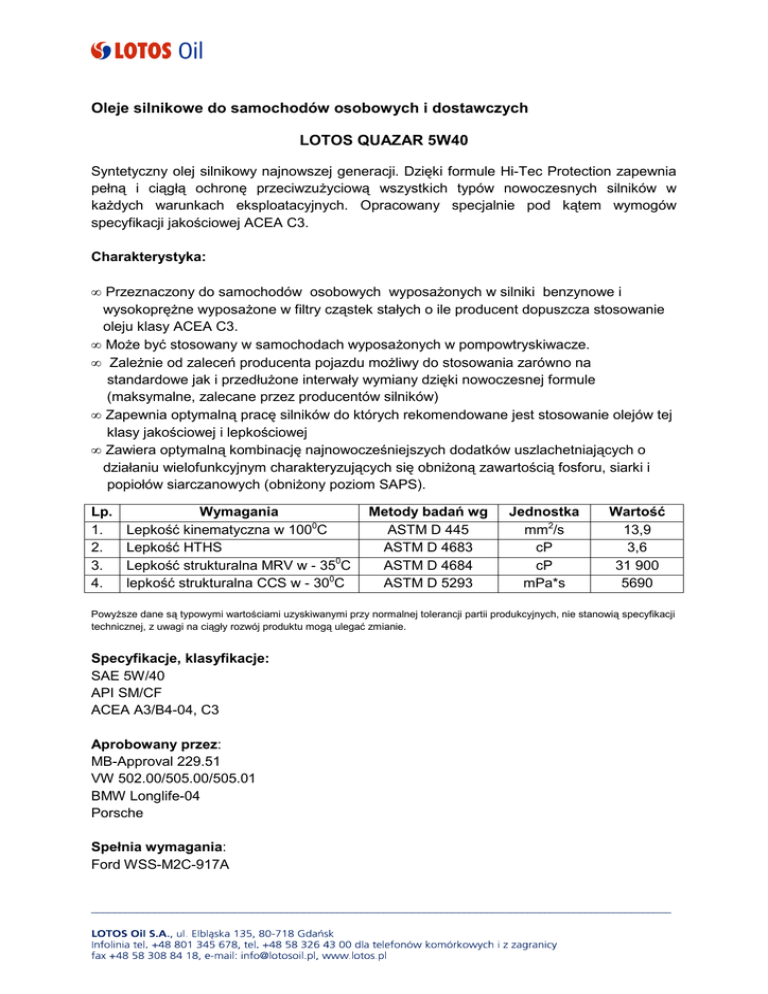 Oleje silnikowe do samochodów osobowych i dostawczych LOTOS QUAZAR 5W40 Syntetyczny olej silnikowy najnowszej generacji. Dzięki formule Hi-Tec Protection zapewnia pełną i ciągłą ochronę przeciwzuŜyciową wszystkich typów nowoczesnych silników w kaŜdych warunkach eksploatacyjnych. Opracowany specjalnie pod kątem wymogów specyfikacji jakościowej ACEA C3. Charakterystyka: • Przeznaczony do samochodów osobowych wyposaŜonych w silniki benzynowe i wysokopręŜne wyposaŜone w filtry cząstek stałych o ile producent dopuszcza stosowanie oleju klasy ACEA C3. • MoŜe być stosowany w samochodach wyposaŜonych w pompowtryskiwacze. • ZaleŜnie od zaleceń producenta pojazdu moŜliwy do stosowania zarówno na standardowe jak i przedłuŜone interwały wymiany dzięki nowoczesnej formule (maksymalne, zalecane przez producentów silników) • Zapewnia optymalną pracę silników do których rekomendowane jest stosowanie olejów tej klasy jakościowej i lepkościowej • Zawiera optymalną kombinację najnowocześniejszych dodatków uszlachetniających o działaniu wielofunkcyjnym charakteryzujących się obniŜoną zawartością fosforu, siarki i popiołów siarczanowych (obniŜony poziom SAPS). Lp. 1. 2. 3. 4. Wymagania Lepkość kinematyczna w 1000C Lepkość HTHS Lepkość strukturalna MRV w - 350C lepkość strukturalna CCS w - 300C Metody badań wg ASTM D 445 ASTM D 4683 ASTM D 4684 ASTM D 5293 Jednostka mm2/s cP cP mPa*s Wartość 13,9 3,6 31 900 5690 PowyŜsze dane są typowymi wartościami uzyskiwanymi przy normalnej tolerancji partii produkcyjnych, nie stanowią specyfikacji technicznej, z uwagi na ciągły rozwój produktu mogą ulegać zmianie. Specyfikacje, klasyfikacje: SAE 5W/40 API SM/CF ACEA A3/B4-04, C3 Aprobowany przez: MB-Approval 229.51 VW 502.00/505.00/505.01 BMW Longlife-04 Porsche Spełnia wymagania: Ford WSS-M2C-917A _____________________________________________________________________________________________________ Opakowanie: 1l, 4l, 50kg, 180kg Składowanie: Wszelkie opakowania powinny być przechowywane w zadaszonych pomieszczeniach. JeŜeli beczki przechowuje się na otwartej przestrzeni, gdzie mogą być naraŜone na czynniki atmosferyczne - opady, naleŜy je ustawić w pozycji poziomej, tak aby uniemoŜliwić dostęp wody oraz zapobiec zniszczeniu oznakowania, najwłaściwiej przykryć brezentem. Produkt nie moŜe być przechowywany w temperaturze wyŜszej niŜ 60 ºC, ani tez naraŜony na działanie promieni słonecznych lub niskich temperatur poniŜej 0 ºC. Gwarantowany okres przydatności produktu do uŜycia przy zachowaniu warunków magazynowania wynosi nie mniej niŜ 3 lata. Zdrowie, bhp, środowisko: Informacje na temat bezpieczeństwa zawarte są w zbiorze danych dotyczących bezpieczeństwa materiałów (karta bezpieczeństwa MSDS). Zawarte tam są szczegółowe informacje odnośne potencjalnych zagroŜeń, środków ostroŜności oraz zasad udzielania pierwszej pomocy wraz z informacjami na temat wpływu na środowisko naturalne i usuwania wykorzystanych produktów. Lotos Oil SA i firmy współpracujące nie ponoszą odpowiedzialności za skutki niezgodnego z przeznaczenie wykorzystania produktu lub niestosowania opisanych środków ostroŜności. Przed zastosowaniem produktu do innych niŜ wymienione celów, naleŜy zasięgnąć porady lokalnego biura Lotos Oil SA. Dane zawarte w niniejszej karcie nie stanowią oferty w rozumieniu przepisów ustawy z dnia 23 kwietnia 1964 roku - kodeks cywilny. LOTOS Oil S.A. nie ponosi Ŝadnej odpowiedzialności za jakiekolwiek skutki wykorzystywania danych zawartych w karcie, w szczególności przy podejmowaniu decyzji handlowych i inwestycyjnych. Wszelkie dane zawarte w karcie są typowymi wartościami uzyskiwanymi przy normalnej tolerancji partii produkcyjnych, mogą się nieznacznie róŜnić z uwagi na charakterystykę procesu produkcji, a takŜe z uwagi na ciągły rozwój produktu. Dane zawarte w karcie mogą podlegać zmianom. LOTOS Oil S.A. nie ponosi odpowiedzialności za dostępność produktu. Opracowano:25.05.2009 Wydanie nr 2 Aktualizacja: 05.12.2010 _____________________________________________________________________________________________________
