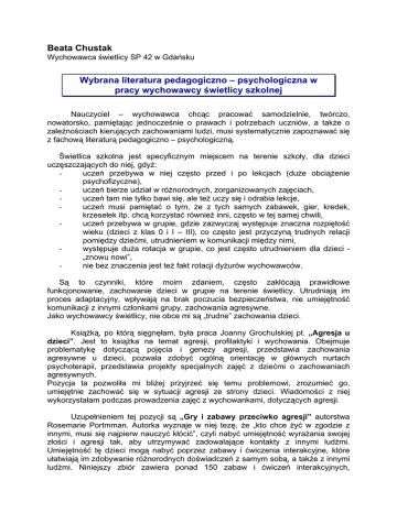 Beata Chustak Wychowawca świetlicy SP 42 w Gdańsku Wybrana literatura pedagogiczno – psychologiczna w pracy wychowawcy świetlicy szkolnej Nauczyciel – wychowawca chcąc pracować samodzielnie, twórczo, nowatorsko, pamiętając jednocześnie o prawach i potrzebach uczniów, a także o zależnościach kierujących zachowaniami ludzi, musi systematycznie zapoznawać się z fachową literaturą pedagogiczno – psychologiczną. Świetlica szkolna jest specyficznym miejscem na terenie szkoły, dla dzieci uczęszczających do niej, gdyż: uczeń przebywa w niej często przed i po lekcjach (duże obciążenie psychofizyczne), uczeń bierze udział w różnorodnych, zorganizowanych zajęciach, uczeń tam nie tylko bawi się, ale też uczy się i odrabia lekcje, uczeń musi pamiętać o tym, że z tych samych zabawek, gier, kredek, krzesełek itp. chcą korzystać również inni, często w tej samej chwili, uczeń przebywa w grupie, gdzie zazwyczaj występuje znaczna rozpiętość wieku (dzieci z klas 0 i I – III), co często jest przyczyną trudnych relacji pomiędzy dziećmi, utrudnieniem w komunikacji między nimi, występuje duża rotacja w grupie, co jest często utrudnieniem dla dzieci „znowu nowi”, nie bez znaczenia jest też fakt rotacji dyżurów wychowawców. Są to czynniki, które moim zdaniem, często zakłócają prawidłowe funkcjonowanie, zachowanie dzieci w grupie na terenie świetlicy. Utrudniają im proces adaptacyjny, wpływają na brak poczucia bezpieczeństwa, nie umiejętność komunikacji z innymi członkami grupy, zachowania agresywne. Jako wychowawcy świetlicy, nie obce mi są „trudne” zachowania dzieci. Książką, po którą sięgnęłam, była praca Joanny Grochulskiej pt. „Agresja u dzieci”. Jest to książka na temat agresji, profilaktyki i wychowania. Obejmuje problematykę dotyczącą pojęcia i genezy agresji, przedstawia zachowania agresywne u dzieci, pozwala zdobyć ogólną orientację w głównych nurtach psychoterapii, przedstawia projekty specjalnych zajęć z dziećmi o zachowaniach agresywnych. Pozycja ta pozwoliła mi bliżej przyjrzeć się temu problemowi, zrozumieć go, umiejętnie zachować się w sytuacji agresji ze strony dzieci. Wiadomości z niej wykorzystałam podczas prowadzenia zajęć z wychowankami, dotyczących agresji. Uzupełnieniem tej pozycji są „Gry i zabawy przeciwko agresji” autorstwa Rosemarie Portmman. Autorka wyznaje w niej tezę, że „kto chce żyć w zgodzie z innymi, musi się najpierw nauczyć kłócić”, czyli nabyć umiejętność wyrażania swojej złości i agresji tak, aby utrzymywać zadowalające kontakty z innymi ludźmi. Umiejętność tę dzieci mogą nabyć poprzez zabawy i ćwiczenia interakcyjne, które ułatwiają im zdobywanie różnorodnych doświadczeń z samym sobą, a także z innymi ludźmi. Niniejszy zbiór zawiera ponad 150 zabaw i ćwiczeń interakcyjnych, wypróbowanych przez autorkę w praktyce. Treść ich można dopasować do grup z różnych przedziałów wiekowych. Dzięki tym zabawom dzieci mogą nauczyć się akceptować i wyrażać swoje uczucia oraz aktywnie działać i stanowić o sobie samych. W codziennej trudnej sztuce komunikowania się z dziećmi bardzo pomocne są książki Adele Faber i Elaine Mazlish pt.: „Jak mówić, żeby dzieci nas słuchały, jak słuchać, żeby dzieci do nas mówiły” oraz „Jak mówić, żeby dzieci się uczyły”. Waga tych książek tkwi w tym, że pomagają one zrozumieć, iż często sposób w jaki nauczyciele i wychowawcy mówią do ucznia informuje go, co do niego czują w danej chwili. Stwierdzenia nauczycieli mają wpływ na szacunek dziecka do samego siebie i poczucie własnej godności i wartości. Nieocenione są także praktyczne ćwiczenia i wskazówki, które ułatwiają trudną sztukę komunikowania się z dziećmi. Ważną pozycją jest książka Thomasa Gordona pt. „Wychowanie bez porażek w szkole”. Dzięki zawartym w niej prostym metodom postępowania można lepiej wykorzystać czas z wychowankami, by nie marnować go na rozwiązywanie nieuniknionych konfliktów, wprowadzanie przymusowej dyscypliny, bezsensowne rozmowy. Autor proponuje metody, które uczynią stosunki w szkole bardziej partnerskimi. W codziennej pracy nieocenioną pozycją jest książka pt. „Szkolne gry uczniów, Jak sobie z nimi radzić” Ernsta Kena, w której autor wyróżnia kilka typów zachowań uczniów i daje wskazówki jak reagować na nietypowe zachowania uczniów, zwane „grami”. Wskazówki te bardzo często wykorzystuję będąc adresatem „gier uczniów”. Istotne jest też, że opisuje typowe „gry” uprawiane przez nauczycieli oraz ich antytezy. Radzi, jak się powinien zachować nauczyciel, żeby uniknąć takich „gier”. Dla lepszego zgłębienia zagadnień merytorycznych i metodycznych dotyczących pracy w świetlicy, przeczytałam „Poradnik dla wychowawców świetlic szkolnych” Anny i Zdzisława Wiechów oraz pozycje pod redakcją Marii Pietkiewicz pt. „Świetlica szkolna szansą do wykorzystania”. Pomimo, iż są to pozycje wydane w latach osiemdziesiątych, zawarte w nich metody i formy pracy z dziećmi są do dzisiaj aktualne. Treści w nich zawarte wykorzystałam przy planowaniu i organizowaniu zajęć świetlicowych. Podczas odrabiania lekcji z uczniami spotkałam się z problemem dysleksji. Chcąc uaktualnić moją wiedzę na ten temat, a przede wszystkim w większym stopniu pomóc dzieciom, przeczytałam pozycję pt. „Dysleksja” Marka Selikowitza i książkę Marty Bogdanowicz pt. „O dysleksji czyli specyficznych trudnościach w czytaniu i pisaniu – odpowiedzi na pytania rodziców i nauczycieli”. Bez względu na to, ile nauczyciel – wychowawca przeczytałby książek metodycznych, pedagogicznych i psychologicznych, najważniejsza jest jego osobowość i autorytet. O potrzebie autorytetu nauczyciela wśród uczniów, jego rodzajach, innym odczuwaniu w zależności od wieku dzi