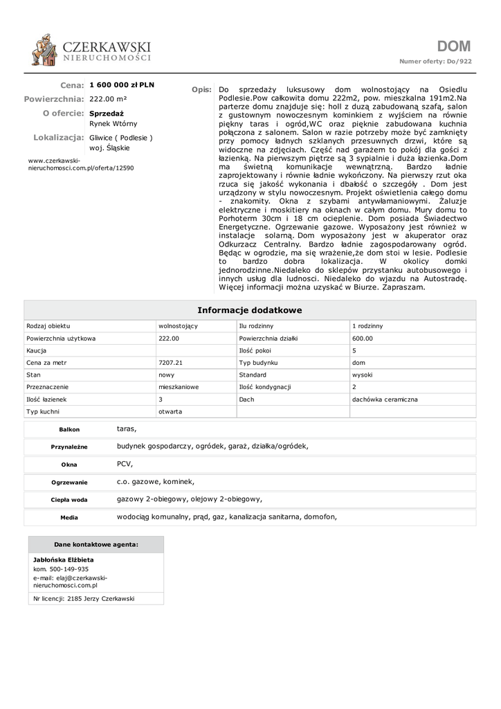 DOM Numer oferty: Do/922 Cena: 1 600 000 zł PLN Opis: Do sprzedaży luksusowy dom wolnostojący na Osiedlu Podlesie.Pow całkowita domu 222m2, pow. mieszkalna 191m2.Na parterze domu znajduje się: holl z duzą zabudowaną szafą, salon z gustownym nowoczesnym kominkiem z wyjściem na równie piękny taras i ogród,WC oraz pięknie zabudowana kuchnia połączona z salonem. Salon w razie potrzeby może być zamknięty przy pomocy ładnych szklanych przesuwnych drzwi, które są widoczne na zdjęciach. Część nad garażem to pokój dla gości z łazienką. Na pierwszym piętrze są 3 sypialnie i duża łazienka.Dom ma świetną komunikacje wewnątrzną. Bardzo ładnie zaprojektowany i równie ładnie wykończony. Na pierwszy rzut oka rzuca się jakość wykonania i dbałość o szczegóły . Dom jest urządzony w stylu nowoczesnym. Projekt oświetlenia całego domu - znakomity. Okna z szybami antywłamaniowymi. Żaluzje elektryczne i moskitiery na oknach w całym domu. Mury domu to Porhoterm 30cm i 18 cm ocieplenie. Dom posiada Świadectwo Energetyczne. Ogrzewanie gazowe. Wyposażony jest również w instalacje solarną. Dom wyposażony jest w akuperator oraz Odkurzacz Centralny. Bardzo ładnie zagospodarowany ogród. Będąc w ogrodzie, ma się wrażenie,że dom stoi w lesie. Podlesie to bardzo dobra lokalizacja. W okolicy domki jednorodzinne.Niedaleko do sklepów przystanku autobusowego i innych usług dla ludnosci. Niedaleko do wjazdu na Autostradę. Więcej informacji można uzyskać w Biurze. Zapraszam. Powierzchnia: 222.00 m² O ofercie: Sprzedaż Rynek Wtórny Lokalizacja: Gliwice ( Podlesie ) woj. Śląskie www.czerkawskinieruchomosci.com.pl/oferta/12590 Informacje dodatkowe Rodzaj obiektu wolnostojący Ilu rodzinny 1 rodzinny Powierzchnia użytkowa 222.00 Powierzchnia działki 600.00 Ilość pokoi 5 Kaucja Cena za metr 7207.21 Typ budynku dom Stan nowy Standard wysoki Przeznaczenie mieszkaniowe Ilość kondygnacji 2 Ilość łazienek 3 Dach dachówka ceramiczna Typ kuchni otwarta Balkon Przynależne Okna taras, budynek gospodarczy, ogródek, garaż, działka/ogródek, PCV, Ogrzewanie c.o. gazowe, kominek, Ciepła woda gazowy 2-obiegowy, olejowy 2-obiegowy, Media wodociąg komunalny, prąd, gaz, kanalizacja sanitarna, domofon, Dane kontaktowe agenta: Jabłońska Elżbieta kom. 500-149-935 e-mail: [email protected] Nr licencji: 2185 Jerzy Czerkawski www.czerkawski-nieruchomosci.com.pl
