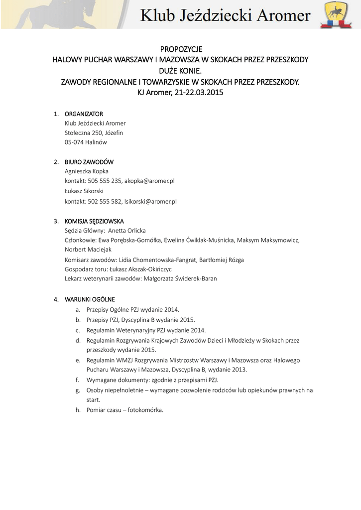 PROPOZYCJE HALOWY PUCHAR WARSZAWY I MAZOWSZA W SKOKACH PRZEZ PRZESZKODY DUŻE KONIE. ZAWODY REGIONALNE I TOWARZYSKIE W SKOKACH PRZEZ PRZESZKODY. KJ Aromer, 21-22.03.2015 1. ORGANIZATOR Klub Jeździecki Aromer Stołeczna 250, Józefin 05-074 Halinów 2. BIURO ZAWODÓW Agnieszka Kopka kontakt: 505 555 235, [email protected] Łukasz Sikorski kontakt: 502 555 582, [email protected] 3. KOMISJA SĘDZIOWSKA Sędzia Główny: Anetta Orlicka Członkowie: Ewa Porębska-Gomółka, Ewelina Ćwiklak-Muśnicka, Maksym Maksymowicz, Norbert Maciejak Komisarz zawodów: Lidia Chomentowska-Fangrat, Bartłomiej Rózga Gospodarz toru: Łukasz Akszak-Okińczyc Lekarz weterynarii zawodów: Małgorzata Świderek-Baran 4. WARUNKI OGÓLNE a. Przepisy Ogólne PZJ wydanie 2014. b. Przepisy PZJ, Dyscyplina B wydanie 2015. c. Regulamin Weterynaryjny PZJ wydanie 2014. d. Regulamin Rozgrywania Krajowych Zawodów Dzieci i Młodzieży w Skokach przez przeszkody wydanie 2015. e. Regulamin WMZJ Rozgrywania Mistrzostw Warszawy i Mazowsza oraz Halowego Pucharu Warszawy i Mazowsza, Dyscyplina B, wydanie 2013. f. Wymagane dokumenty: zgodnie z przepisami PZJ. g. Osoby niepełnoletnie – wymagane pozwolenie rodziców lub opiekunów prawnych na start. h. Pomiar czasu – fotokomórka. 5. KATEGORIE I WARUNKI UCZESTNICTWA HPWiM a. Dzieci II, wiek zawodników 11-14 lat, minimum licencja B (wstępna). b. Juniorzy Młodsi na DK, wiek zawodników 12-15 lat, minimum licencja B3. c. Zawodnicy z III licencją, wiek zawodników od 9 lat, wyłącznie licencja B3. d. Juniorzy, wiek zawodników 14-18 lat, minimum licencja B3. e. Młodzi Jeźdźcy, wiek zawodników 16-21 lat, minimum licencja B3. f. Seniorzy – wiek zawodników od 18 lat, minimum licencja B2. g. Zawodnik może startować jednocześnie w różnych kategoriach (na innych koniach) spełniając warunki uczestnictwa w poszczególnych kategoriach oraz odnośny dla wieku limit startów. h. Zawodnik może startować w jednej kategorii na dwóch koniach, z tym że po finałach musi wskazać konia na którym będzie startować w konkursie finałowym. Na drugim koniu może startować w pierwszym nawrocie finału w specjalnej serii B, poza klasyfikacją Mistrzostw. 6. ZGŁOSZENIA a. Zgłoszenia należy przesyłać przez formularz zgłoszeniowy, dostępny na oficjalnej stronie internetowej KJ Aromer: www.aromer.pl b. W przypadku jakichkolwiek problemów z wyświetleniem lub wypełnieniem formularza, zgłoszenie należy przesłać drogą mailową na adres [email protected], na oficjalnym druku zgłoszenia do zawodów PZJ. c. Zmiany w zgłoszeniach wykonujemy zgodnie z informacjami, które otrzymają Państwo w e-mailu potwierdzającym zgłoszenie. Prosimy wysyłać je mailowo. d. Termin przyjmowania zgłoszeń: od 10.03. do 17.03.2015r do godziny 24:00. Zgłoszenia po terminie: 50 zł e. Listy startowe pierwszych półfinałów i I nawrotu finału będą zawierały godziny rozpoczęcia konkursów i czas startu zawodników z dokładnością minutową. Obie te informacje mają charakter orientacyjny i ze względu na zdarzenia losowe nie są wiążące. W przypadku II półfinałów oraz II nawrotu finału podane zostaną orientacyjne godziny ich rozpoczęcia. 7. KOLEJNOŚĆ STARTÓW I KLASYFIKACJA MISTRZOSTW a. Starty: I półfinał zgodnie z losowaniem, w kolejności od pierwszej litery nazwiska: Dzieci II – od litery „J”; Juniorzy Młodsi - od „C”; Zawodnicy z III licencją – od „N”; Juniorzy – od „R”; Młodzi Jeźdźcy – od „G”; Seniorzy - „od K”. II półfinał w odwrotnej kolejności do zajmowanych miejsc po I półfinale. I nawrót finału w odwrotnej kolejności do zajmowanych miejsc po dwóch półfinałach. II nawrót finału w odwrotnej kolejności od zajmowanych miejsc po I nawrocie finału, przy czym prawo startu w II nawrocie mają zawodnicy, którzy ukończyli minimum jeden półfinał oraz I nawrót finału. b. Klasyfikacja: W przypadku równej liczby punktów po dwóch półfinałach i finale na pozycjach medalowych o zajętych miejscach w Pucharze zadecyduje rozgrywka zwykła. W pozostałych przypadkach o zajętym miejscu decyduje łączna liczba punktów, a w następnej kolejności wynik przejazdu w II nawrocie finału, dalej w I nawrocie. W przypadku eliminacji / rezygnacji w półfinale zawodnik otrzymuje liczbę punktów karnych równą najgorszemu wynikowi punktowemu w danym półfinale + 10 punktów. 8. PROGRAM ZAWODÓW SOBOTA Konkurs nr 1 70 cm „Open” zwykły (art. 238.2.1) Konkurs nr 2 I półfinał, Dzieci II, dokładności (art. 238.1.1), wys. 90 cm Konkurs nr 3 LL „open” zwykły (art. 238.2.1) Konkurs nr 4 I półfinał, Juniorzy Młodsi, dokładności (art. 238.1.1), wys. 100 cm Konkurs nr 5 L „open” zwykły (art. 238.2.1) Konkurs nr 6 II półfinał, Dzieci II, zwykły (art. 238.2.1), wys. 95 cm Konkurs nr 7 II półfinał, Juniorzy Młodsi, zwykły (art. 238.2.1), wys. 105 cm Konkurs nr 8 I półfinał, Zawodnicy z III licencją, dokładności (art. 238.1.1), wys. 100 cm Konkurs nr 9 I półfinał, Juniorzy, dokładności (art. 238.2.1), wys. 110 cm Konkurs nr 10 P, ZR, zwykły (art. 238.2.1) Konkurs nr 11 II półfinał, Zawodnicy z III licencją, zwykły (art.238.2.1), wys. 105 cm Konkurs nr 12 II półfinał, Juniorzy, zwykły (art.238.2.1), wys. 115 cm Konkurs nr 13 I półfinał, Młodzi Jeźdźcy, dokładności (art. 238.1.1), wys. 115 cm Konkurs nr 14 I półfinał, Seniorzy, dokładności (art. 238.1.1), wys. 120 cm Konkurs nr 15 N, ZR, zwykły (art. 238.2.1) Konkurs nr 16 II półfinał, Młodzi Jeźdźcy, zwykły (art. 238.2.1), wys. 120 cm Konkurs nr 17 II półfinał, Seniorzy, zwykły (art. 238.2.1), wys. 125 cm NIEDZIELA Konkurs nr 18 LL „open” zwykły (art. 238.2.1) Konkurs nr 19 finał Dzieci II, dwunawrotowy (zwykły, zwykły), wys. 95/100 cm Konkurs nr 20 L „open” zwykły (art. 238.2.1) Konkurs nr 21 finał Juniorzy Młodsi, dwunawrotowy (zwykły, zwykły), wys. 105/110 cm Konkurs nr 22 P, Z