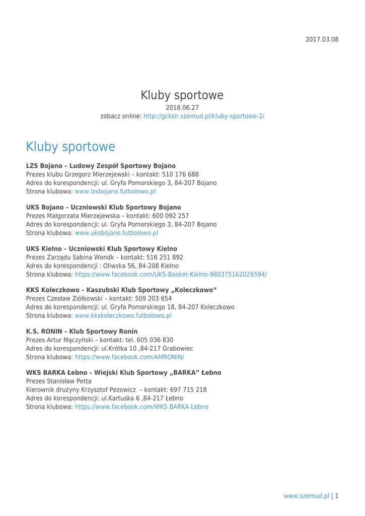 2017.03.08 Kluby sportowe 2016.06.27 zobacz online: http://gcksir.szemud.pl/kluby-sportowe-2/ Kluby sportowe LZS Bojano – Ludowy Zespół Sportowy Bojano Prezes klubu Grzegorz Mierzejewski – kontakt: 510 176 688 Adres do korespondencji: ul. Gryfa Pomorskiego 3, 84-207 Bojano Strona klubowa: www.lzsbojano.futbolowo.pl UKS Bojano – Uczniowski Klub Sportowy Bojano Prezes Małgorzata Mierzejewska – kontakt: 600 092 257 Adres do korespondencji: ul. Gryfa Pomorskiego 3, 84-207 Bojano Strona klubowa: www.uksbojano.futbolowo.pl UKS Kielno – Uczniowski Klub Sportowy Kielno Prezes Zarządu Sabina Wendk – kontakt: 516 251 892 Adres do korespondencji : Oliwska 56, 84-208 Kielno Strona klubowa: https://www.facebook.com/UKS-Basket-Kielno-980375162026594/ KKS Koleczkowo – Kaszubski Klub Sportowy „Koleczkowo” Prezes Czesław Ziółkowski – kontakt: 509 203 654 Adres do korespondencji: ul. Gryfa Pomorskiego 18, 84-207 Koleczkowo Strona klubowa: www.kkskoleczkowo.futbolowo.pl K.S. RONIN – Klub Sportowy Ronin Prezes Artur Mączyński – kontakt: tel. 605 036 830 Adres do korespondencji: ul.Krótka 10 ,84-217 Grabowiec Strona klubowa: https://www.facebook.com/AMRONIN/ WKS BARKA Łebno – Wiejski Klub Sportowy „BARKA” Łebno Prezes Stanisław Petta Kierownik drużyny Krzysztof Pezowicz – kontakt: 697 715 218 Adres do korespondencji: ul.Kartuska 6 ,84-217 Łebno Strona klubowa: https://www.facebook.com/WKS BARKA Łebno www.szemud.pl | 1