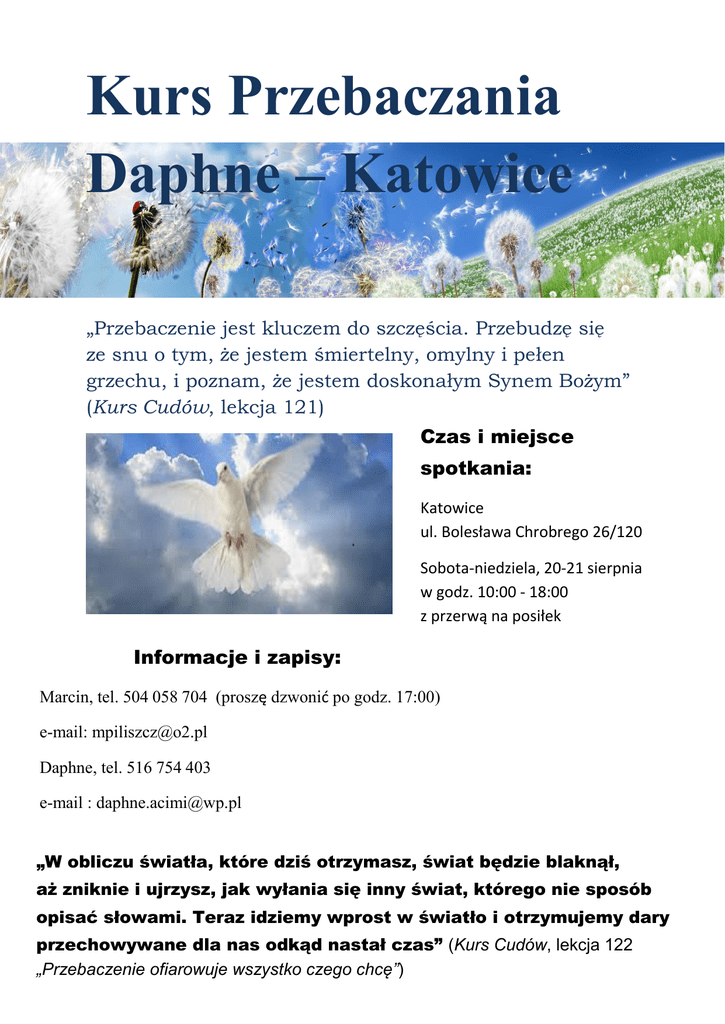 Kurs Przebaczania Daphne – Katowice „Przebaczenie jest kluczem do szczęścia. Przebudzę się ze snu o tym, że jestem śmiertelny, omylny i pełen grzechu, i poznam, że jestem doskonałym Synem Bożym” (Kurs Cudów, lekcja 121) Czas i miejsce spotkania: Katowice ul. Bolesława Chrobrego 26/120 Sobota-niedziela, 20-21 sierpnia w godz. 10:00 - 18:00 z przerwą na posiłek Informacje i zapisy: Marcin, tel. 504 058 704 (proszę dzwonić po godz. 17:00) e-mail: [email protected] Daphne, tel. 516 754 403 e-mail : [email protected] „W obliczu światła, które dziś otrzymasz, świat będzie blaknął, aż zniknie i ujrzysz, jak wyłania się inny świat, którego nie sposób opisać słowami. Teraz idziemy wprost w światło i otrzymujemy dary przechowywane dla nas odkąd nastał czas” (Kurs Cudów, lekcja 122 „Przebaczenie ofiarowuje wszystko czego chcę”)