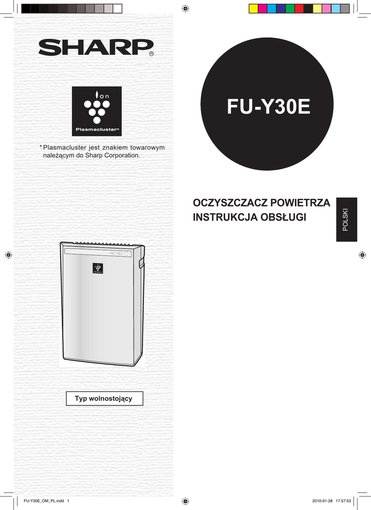 R FU-Y30E OCZYSZCZACZ POWIETRZA INSTRUKCJA OBSŁUGI POLSKI * Plasmacluster jest znakiem towarowym należącym do Sharp Corporation. Typ wolnostojący FU-Y30E_OM_PL.indd 1 2010-01-28 17:57:53 Prosimy o przeczytanie poniższej informacji przed włączeniem nowego oczyszczacza powietrza Niektóre składniki zapachu mogą być zatrzymane i oddzielane przez filtr, co może powodować, że w wydmuchiwanym powietrzu pojawi się dodatkowy zapach. W zależności od miejsca eksploatacji oczyszczacza, zwłaszcza w warunkach o wiele trudniejszych niż domowe, zapach ten może być o wiele silniejszy niż należałoby się tego spodziewać. Jeśli zapach ten się utrzymuje, oznacza to, że filtr jest już zużyty i należy zakupić nowy. UWAGA • Opisywany oczyszczacz powietrza jest przeznaczony do usuwania z atmosfery w pomieszczeniu unoszących się drobin kurzu i cząstek będących źródłem zapachu, ale nie trujących gazów (np. tlenku węgla zawartego w dymie papierosowym). Jeśli w tym samym pomieszczeniu istnieją równocześnie źródła zapachu, oczyszczacz nie jest w stanie całkowicie usunąć zapachu z powietrza. (Dotyczy to np. materiałów konstrukcyjnych i zapachów pochodzących od zwierząt.) • Podczas palenia tytoniu wskazane jest uchylenie okna, żeby ułatwić wentylację pomieszczenia. Zanieczyszczenia eliminowane za pomocą filtra Filtr zatrzymujący kurz i pochłaniający zapachy Kurz pyłki, kurz, cząsteczki dymu papierosowego, sierść zwierząt Zapachy zapach dymu papierosowego, zapachy domowe (z toalety, odpadków żywności, od zwierząt itp.) FU-Y30E_OM_PL.indd 2 2010-01-28 17:58:00 POLSKI Technologia „Plasmacluster” Technologia Plasmacluster wykorzystuje proces jonizacji gazu do wytwarzania i uwalniania do otoczenia takich samych dodatnich i ujemnych jonów, jakie spotykamy w warunkach naturalnych („jony Plasmacluster”). Jest to opracowana przez firmę Sharp unikalna technologia oczyszczania powietrza, która usuwa i zobojętnienia potencjalne alergeny zawarte w powietrzu, jak odchody i martwe szczątki roztoczy*1, wirusy*2, pleśń oraz bakterie*3. Jej skuteczność została potwierdzona przez niezależne organizacje japońskie i zagraniczne. Jeśli w powietrzu pomieszczenia jest wysokie stężenie jonów Plasmacluster, zapach dymu papierosowego utrzymujący się w zasłonach lub kanapach zostanie usunięty w ciągu około 80 minut*4. Zapach potu w odzieży, która znajduje się bezpośredniego w strumieniu powietrza nawiewanego z urządzenia generującego jony Plasmacluster, zostanie zmniejszony do niewyczuwalnego poziomu w ciągu jednej nocy (około 6 godzin). *1 Graduate School of Advanced Sciences of Matter, Hiroshima University, Japonia Pomiar oddziaływania na potencjalne alergeny znajdujące się w cząsteczkach powietrza (w pomieszczeniu o powierzchni 13 m²). *2 Retroscreen Virology, Ltd., Londyn, Wielka Brytania Pomiar liczby usuniętych wirusów z powietrza w pojemniku o objętości 1 m³. *3 Ishikawa Health Service Association, Japonia Pomiar pleśni i bakterii zawartych w próbce powietrza (z pomieszczenia o powierzchni 13 m²). *4 Japan Spinners Inspecting Foundation, Japonia Ocena efektu pochłaniania zapachów z fragmentów tkaniny przepojonej nieprzyjemnym zapachem. SPIS TREŚCI ŚRODKI OSTROŻNOŚCI ........................... PL-2 • OSTRZEŻENIA .......................................... PL-2 • OSTRZEŻENIA DOTYCZĄCE OBSŁUGI ... PL-3 • WSKAZÓWKI DOTYCZĄCE INSTALACJI ... PL-3 • FILTR ......................................................... PL-3 NAZWY CZĘŚCI ........................................ PL-4 • WYŚWIETLACZ NA URZĄDZENIU GŁÓWNYM ................................................ PL-4 • WIDOK OD PRZODU ................................. PL-4 • ELEMENTY ZESTAWU ............................. PL-5 • WIDOK OD TYŁU ....................................... PL-5 PRZYGOTOWANIE DO PRACY ............. PL-6 • INSTALACJA FILTRA ................................ PL-6 OBSŁUGA ................................................... PL-8 • OBSŁUGA URZĄDZENIA GŁÓWNEGO ... PL-8 POLSKI FUNKCJE CZYSZCZENIE I KONSERWACJA ........ PL-9 • PANEL TYLNY ........................................... PL-9 • URZĄDZENIE GŁÓWNE ........................... PL-9 • WSKAZÓWKI DOTYCZĄCE WYMIANY FILTRA .....................................................PL-10 ROZWIĄZYWANIE PROBLEMÓW.......PL-11 DANE TECHNICZNE ...............................PL-12 Dziękujemy za zakup oczyszczacza firmy SHARP. Prosimy o uważne zapoznanie się z niniejszą instrukcją obsługi. Przed przystąpieniem do korzystania z urządzenia należy koniecznie zapoznać się z ostrzeżeniami i wskazówkami zawartymi w części „Środki ostrożności” Po przeczytaniu instrukcji zachowaj ją w dogodnym miejscu w celu ponownego wykorzystania. PL-1 FU-Y30E_OM_PL.indd 3 2010-01-28 17:58:00 ŚRODKI OSTROŻNOŚCI Podczas korzystania z urządzeń elektrycznych należy przestrzegać podstawowych zasad bezpieczeństwa, do których należą, między innymi, następujące zalecenia: OSTRZEŻENIA – Żeby zmniejszyć ryzyko porażenia prądem, pożaru i obrażeń osób znajdujących się w pobliżu: • Przed przystąpieniem do korzystania z urządzenia należy uważnie przeczytać niniejszą instrukcję. • Urządzenie należy podłączać wyłącznie do sieci o napięciu 220-240 V. • Nie korzystaj z urządzenia, jeżeli jest uszkodzony kabel zasilający lub wtyczka, albo gniazdko w ścianie jest obluzowane. • Regularnie usuwaj kurz z wtyczki sieciowej. • Do otworów wlotowych ani wylotowych nie wolno wsuwać palców ani żadnych innych obcych przedmiotów. • Odłączając wtyczkę należy zawsze za nią trzymać. Nie wolno ciągnąć za kabel. Mogłoby to spowodować porażenie prądem i/lub pożar w wyniku zawarcia. • Nie wolno odłączać wtyczki mokrymi rękoma. • Opisywanego urządzenia nie wolno używać w pobliżu urządzeń gazowych lub źróde