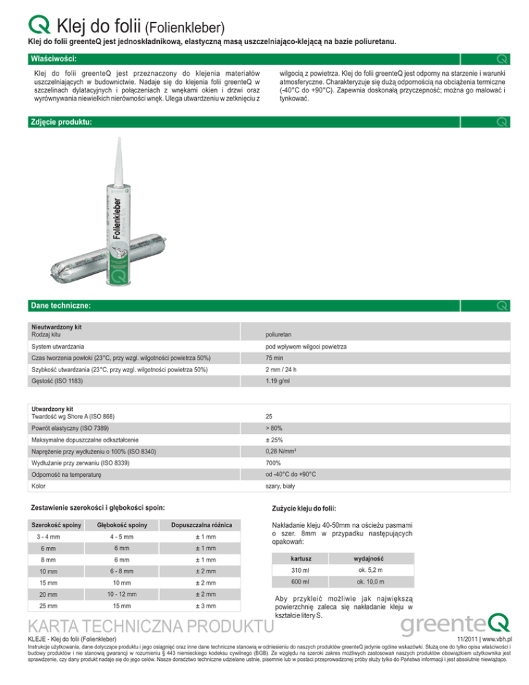 Klej do folii (Folienkleber) Klej do folii greenteQ jest jednosk³adnikow¹, elastyczn¹ mas¹ uszczelniaj¹co-klej¹c¹ na bazie poliuretanu. W³aœciwoœci: Klej do folii greenteQ jest przeznaczony do klejenia materia³ów uszczelniaj¹cych w budownictwie. Nadaje siê do klejenia folii greenteQ w szczelinach dylatacyjnych i po³¹czeniach z wnêkami okien i drzwi oraz wyrównywania niewielkich nierównoœci wnêk. Ulega utwardzeniu w zetkniêciu z wilgoci¹ z powietrza. Klej do folii greenteQ jest odporny na starzenie i warunki atmosferyczne. Charakteryzuje siê du¿¹ odpornoœci¹ na obci¹¿enia termiczne (-40°C do +90°C). Zapewnia doskona³¹ przyczepnoœæ; mo¿na go malowaæ i tynkowaæ. Zdjêcie produktu: Dane techniczne: Nieutwardzony kit Rodzaj kitu poliuretan System utwardzania pod wp³ywem wilgoci powietrza Czas tworzenia pow³oki (23°C, przy wzgl. wilgotnoœci powietrza 50%) 75 min Szybkoœæ utwardzania (23°C, przy wzgl. wilgotnoœci powietrza 50%) 2 mm / 24 h Gêstoœæ (ISO 1183) 1.19 g/ml Utwardzony kit Twardoœæ wg Shore A (ISO 868) 25 Powrót elastyczny (ISO 7389) > 80% Maksymalne dopuszczalne odkszta³cenie ± 25% Naprê¿enie przy wyd³u¿eniu o 100% (ISO 8340) 0,28 N/mm² Wyd³u¿anie przy zerwaniu (ISO 8339) 700% Odpornoœæ na temperaturê od -40°C do +90°C Kolor szary, bia³y Zestawienie szerokoœci i g³êbokoœci spoin: Szerokoœæ spoiny G³êbokoœæ spoiny Zu¿ycie kleju do folii: Dopuszczalna ró¿nica Nak³adanie kleju 40-50mm na oœcie¿u pasmami o szer. 8mm w przypadku nastêpuj¹cych opakowañ: 3 - 4 mm 4 - 5 mm ± 1 mm 6 mm 6 mm ± 1 mm 8 mm 6 mm ± 1 mm kartusz wydajnoœæ ok. 5,2 m ok. 10,0 m 10 mm 6 - 8 mm ± 2 mm 310 ml 15 mm 10 mm ± 2 mm 600 ml 20 mm 10 - 12 mm ± 2 mm 25 mm 15 mm ± 3 mm Aby przykleiæ mo¿liwie jak najwiêksz¹ powierzchniê zaleca siê nak³adanie kleju w kszta³cie litery S. KARTA TECHNICZNA PRODUKTU KLEJE - Klej do folii (Folienkleber) 11/2011 | www.vbh.pl Instrukcje u¿ytkowania, dane dotycz¹ce produktu i jego osi¹gniêæ oraz inne dane techniczne stanowi¹ w odniesieniu do naszych produktów greenteQ jedynie ogólne wskazówki. S³u¿¹ one do tylko opisu w³aœciwoœci i budowy produktów i nie stanowi¹ gwarancji w rozumieniu § 443 niemieckiego kodeksu cywilnego (BGB). Ze wzglêdu na szeroki zakres mo¿liwych zastosowañ naszych produktów obowi¹zkiem u¿ytkownika jest sprawdzenie, czy dany produkt nadaje siê do jego celów. Nasze doradztwo techniczne udzielane ustnie, pisemnie lub w postaci przeprowadzonej próby s³u¿y tylko do Pañstwa informacji i jest absolutnie niewi¹¿¹ce. Klej do folii (Folienkleber) Klej do folii greenteQ jest jednosk³adnikow¹, elastyczn¹ mas¹ uszczelniaj¹co-klej¹c¹ na bazie poliuretanu. Przygotowanie do pracy: Pod³o¿e musi byæ sta³e, czyste, pozbawione kurzu i t³uszczu, wolne od luŸnych cz¹steczek. Jeúli to konieczne, powierzchniæ naleýy odtùuúciã za pomocà zmywacza greenteQ, spirytusu lub etanolu. Na podùoýach porowatych naleýy uýyã primera (podkùadu). Stosowanie: • Klejenie materia³ów uszczelniaj¹cych: Aby prawid³owo po³¹czyæ warstwê tynku z foli¹ nale¿y przykleiæ foliê do pod³o¿a mo¿liwie ca³¹ powierzchni¹. • Uszczelnienie: Zaleca siê oklejanie krawêdzi szczelin odpowiedni¹ taœm¹ klej¹c¹. Klej do folii greenteQ nanieœæ w taki sposób, aby nie powstawa³y pêcherzyki powietrza. Dok³adnie wype³niæ szczeliny. Wyg³adziæ za pomoc¹ œrodka wyg³adzaj¹cego (180.008/000), zanim wytworzy siê ko¿uch. Natychmiast po tym usun¹æ taœmê klej¹c¹. Nadmiar œrodka wyg³adzaj¹cego dok³adnie zmyæ z powierzchni ramy i szyby. Uwaga: • Po otwarciu kartusza lub worka foliowego z klejem nale¿y go zu¿yæ w ci¹gu 24 godzin. Nak³adanie kleju: za pomoc¹ pistoletu rêcznego lub pneumatycznego. Forma uszczelnienia jest bardzo wa¿na. Nale¿y unikaæ cienkich warstw. Tolerancja pow³ok malarskich: Powierzchniê kleju do folii mo¿na malowaæ. W przypadku szczelin o niewielkiej mo¿liwoœci ruchu (maks. 5%) mo¿liwe jest pokrycie pow³ok¹ malarsk¹ ca³ej powierzchni szczeliny. Ze wzglêdu na ró¿norodn¹ elastycznoœæ kleju i farby nie nale¿y malowaæ szczelin o wiêkszej mo¿liwoœci ruchu (>5%), nie wê¿szych ni¿ 1 mm. Ograniczenia: • Nie stosowaæ termicznych, mechanicznych ani chemicznych obci¹¿eñ, zanim wulkanizacja ca³kowicie siê nie zakoñczy. • Nie nale¿y stosowaæ kleju do folii w zamkniêtych pomieszczeniach, poniewa¿ klej do utwardzania potrzebuje wilgoci z powietrza. W³aœciwa wentylacja jest bardzo wa¿na podczas stosowania i wulkanizacji kleju. • Nie nale¿y stosowaæ kleju do folii greenteQ do klejenia luster, powierzchni wykonanych z poliakrylanu i poliwêglanu oraz jako kit szklarski. • Do zastosowañ sanitarnych zaleca siê u¿ywanie silikonu greenteQ A Oxy-F lub silikonu greenteQ G Acetat. Temperatura nak³adania: od +5°C do +35°C Mo¿liwoœæ naprawy: Zalecany ten sam produkt. Czyszczenie: Œwie¿y, jeszcze nieutwardzony klej do folii greenteQ mo¿na usun¹æ za pomoc¹ acetonu lub œrodka zmywaj¹cego. Utwardzony klej moýna usunàã tylko mechanicznie. Sk³adowanie i forma dostawy: Produkt przechowywaæ w zamkniêtym opakowaniu, w suchym, ch³odnym, nie nara¿onym na mróz miejscu - do 12 miesiêcy. 25 kartuszy 310 ml / karton – 48 kartonów / paleta 20 worków foliowych 600 ml / karton – 45 kartonów / paleta Wskazówki dotycz¹ce bezpieczeñstwa: Nale¿y zapoznaæ siê z treœci¹ karty charakterystyki produktu. Nie wdychaæ oparów/gazów, zawiera izocyjaniany. Nale¿y stosowaæ siê do wskazówek producenta. Karta charakterystyki dostêpna na ¿¹danie u¿ytkownika. Ogólne wskazówki: Wszystkie wczeœniejsze wersje niniejszej karty technicznej trac¹ wa¿noœæ. KARTA TECHNICZNA PRODUKTU KLEJE - Klej do folii (Folienkleber) | 11/2011 | www.vbh.pl Instrukcje u¿ytkowania, dane dotycz¹ce produktu i jego osi¹gniêæ oraz inne dane techniczne stanowi¹ w odniesieniu do nasz