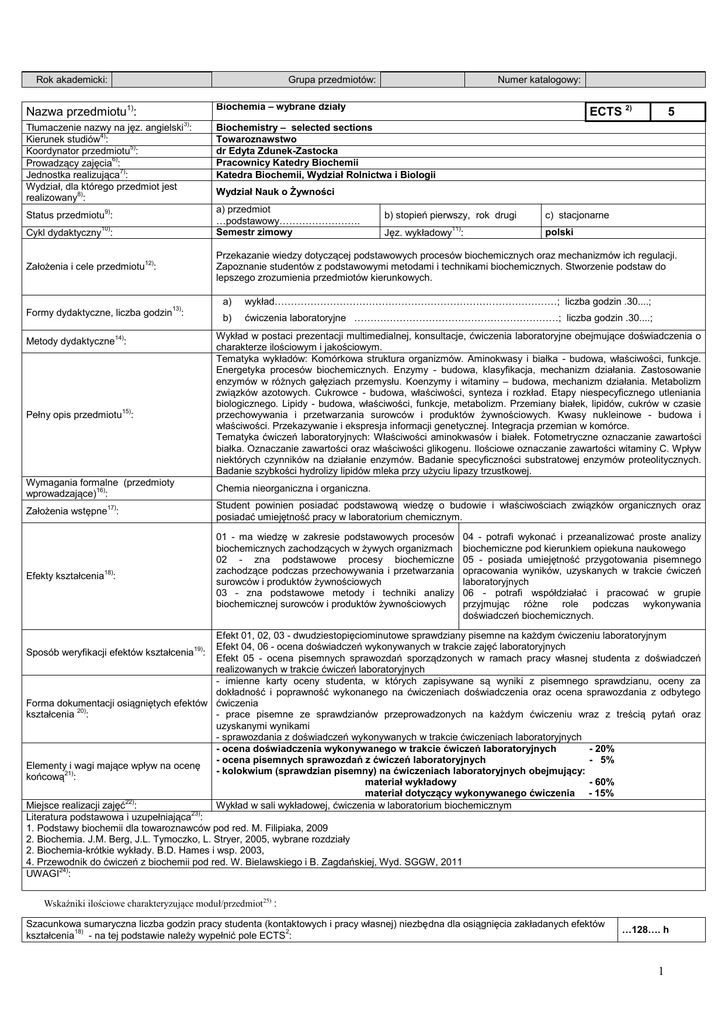 Grupa przedmiotów: Rok akademicki: Numer katalogowy: Biochemia – wybrane działy Nazwa przedmiotu1): 3) Tłumaczenie nazwy na jęz. angielski : Kierunek studiów4): Koordynator przedmiotu5): Prowadzący zajęcia6): Jednostka realizująca7): Wydział, dla którego przedmiot jest realizowany8): Status przedmiotu : 10) Cykl dydaktyczny : Założenia i cele przedmiotu12): Formy dydaktyczne, liczba godzin13): 14) Metody dydaktyczne : Pełny opis przedmiotu15): Wymagania formalne (przedmioty wprowadzające)16): 17) Założenia wstępne : Efekty kształcenia18): 5 Biochemistry – selected sections Towaroznawstwo dr Edyta Zdunek-Zastocka Pracownicy Katedry Biochemii Katedra Biochemii, Wydział Rolnictwa i Biologii Wydział Nauk o Żywności a) przedmiot …podstawowy……………………. Semestr zimowy 9) ECTS 2) b) stopień pierwszy, rok drugi 11) Jęz. wykładowy : c) stacjonarne polski Przekazanie wiedzy dotyczącej podstawowych procesów biochemicznych oraz mechanizmów ich regulacji. Zapoznanie studentów z podstawowymi metodami i technikami biochemicznych. Stworzenie podstaw do lepszego zrozumienia przedmiotów kierunkowych. a) wykład……………………………………………………………………………; liczba godzin .30....; b) ćwiczenia laboratoryjne ………………………………………………………; liczba godzin .30....; Wykład w postaci prezentacji multimedialnej, konsultacje, ćwiczenia laboratoryjne obejmujące doświadczenia o charakterze ilościowym i jakościowym. Tematyka wykładów: Komórkowa struktura organizmów. Aminokwasy i białka - budowa, właściwości, funkcje. Energetyka procesów biochemicznych. Enzymy - budowa, klasyfikacja, mechanizm działania. Zastosowanie enzymów w różnych gałęziach przemysłu. Koenzymy i witaminy – budowa, mechanizm działania. Metabolizm związków azotowych. Cukrowce - budowa, właściwości, synteza i rozkład. Etapy niespecyficznego utleniania biologicznego. Lipidy - budowa, właściwości, funkcje, metabolizm. Przemiany białek, lipidów, cukrów w czasie przechowywania i przetwarzania surowców i produktów żywnościowych. Kwasy nukleinowe - budowa i właściwości. Przekazywanie i ekspresja informacji genetycznej. Integracja przemian w komórce. Tematyka ćwiczeń laboratoryjnych: Właściwości aminokwasów i białek. Fotometryczne oznaczanie zawartości białka. Oznaczanie zawartości oraz właściwości glikogenu. Ilościowe oznaczanie zawartości witaminy C. Wpływ niektórych czynników na działanie enzymów. Badanie specyficzności substratowej enzymów proteolitycznych. Badanie szybkości hydrolizy lipidów mleka przy użyciu lipazy trzustkowej. Chemia nieorganiczna i organiczna. Student powinien posiadać podstawową wiedzę o budowie i właściwościach związków organicznych oraz posiadać umiejętność pracy w laboratorium chemicznym. 01 - ma wiedzę w zakresie podstawowych procesów biochemicznych zachodzących w żywych organizmach 02 - zna podstawowe procesy biochemiczne zachodzące podczas przechowywania i przetwarzania surowców i produktów żywnościowych 03 - zna podstawowe metody i techniki analizy biochemicznej surowców i produktów żywnościowych 04 - potrafi wykonać i przeanalizować proste analizy biochemiczne pod kierunkiem opiekuna naukowego 05 - posiada umiejętność przygotowania pisemnego opracowania wyników, uzyskanych w trakcie ćwiczeń laboratoryjnych 06 - potrafi współdziałać i pracować w grupie przyjmując różne role podczas wykonywania doświadczeń biochemicznych. Efekt 01, 02, 03 - dwudziestopięciominutowe sprawdziany pisemne na każdym ćwiczeniu laboratoryjnym Efekt 04, 06 - ocena doświadczeń wykonywanych w trakcie zajęć laboratoryjnych Efekt 05 - ocena pisemnych sprawozdań sporządzonych w ramach pracy własnej studenta z doświadczeń realizowanych w trakcie ćwiczeń laboratoryjnych - imienne karty oceny studenta, w których zapisywane są wyniki z pisemnego sprawdzianu, oceny za dokładność i poprawność wykonanego na ćwiczeniach doświadczenia oraz ocena sprawozdania z odbytego Forma dokumentacji osiągniętych efektów ćwiczenia kształcenia 20): - prace pisemne ze sprawdzianów przeprowadzonych na każdym ćwiczeniu wraz z treścią pytań oraz uzyskanymi wynikami - sprawozdania z doświadczeń wykonywanych w trakcie ćwiczeniach laboratoryjnych - ocena doświadczenia wykonywanego w trakcie ćwiczeń laboratoryjnych - 20% - ocena pisemnych sprawozdań z ćwiczeń laboratoryjnych - 5% Elementy i wagi mające wpływ na ocenę - kolokwium (sprawdzian pisemny) na ćwiczeniach laboratoryjnych obejmujący: 21) końcową : materiał wykładowy - 60% materiał dotyczący wykonywanego ćwiczenia - 15% Miejsce realizacji zajęć22): Wykład w sali wykładowej, ćwiczenia w laboratorium biochemicznym Literatura podstawowa i uzupełniająca23): 1. Podstawy biochemii dla towaroznawców pod red. M. Filipiaka, 2009 2. Biochemia. J.M. Berg, J.L. Tymoczko, L. Stryer, 2005, wybrane rozdziały 2. Biochemia-krótkie wykłady. B.D. Hames i wsp. 2003, 4. Przewodnik do ćwiczeń z biochemii pod red. W. Bielawskiego i B. Zagdańskiej, Wyd. SGGW, 2011 UWAGI24): Sposób weryfikacji efektów kształcenia19): Wskaźniki ilościowe charakteryzujące moduł/przedmiot 25) : Szacunkowa sumaryczna liczba godzin pracy studenta (kontaktowych i pracy własnej) niezbędna dla osiągnięcia zakładanych efektów kształcenia18) - na tej podstawie należy wypełnić pole ECTS2: …128…. h 1 Łączna liczba punktów ECTS, którą student uzyskuje na zajęciach wymagających bezpośredniego udziału nauczycieli akademickich: …2,5…. ECTS Łączna liczba punktów ECTS, którą student uzyskuje w ramach zajęć o charakterze praktycznym, takich jak zajęcia laboratoryjne, projektowe, itp.: …2,0…. ECTS Tabela zgodności kierunkowych efektów kształcenia efektami przedmiotu Nr /symbol efektu 01 02 03 04 05 06 26) Wymienione w wierszu efekty kształc