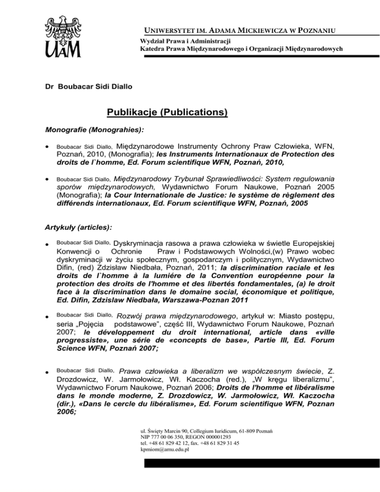 Wydział Prawa i Administracji Katedra Prawa Międzynarodowego i Organizacji Międzynarodowych Dr Boubacar Sidi Diallo Publikacje (Publications) Monografie (Monograhies): Boubacar Sidi Diallo, Boubacar Sidi Diallo, Międzynarodowe Instrumenty Ochrony Praw Człowieka, WFN, Poznań, 2010, (Monografia); les Instruments Internationaux de Protection des droits de l`homme, Ed. Forum scientifique WFN, Poznań, 2010, Międzynarodowy Trybunał Sprawiedliwości: System regulowania sporów międzynarodowych, Wydawnictwo Forum Naukowe, Poznań 2005 (Monografia); la Cour Internationale de Justice: le système de règlement des différends internationaux, Ed. Forum scientifique WFN, Poznań, 2005 Artykuły (articles): Boubacar Sidi Diallo, Dyskryminacja rasowa a prawa człowieka w świetle Europejskiej Konwencji o Ochronie Praw i Podstawowych Wolności,(w) Prawo wobec dyskryminacji w życiu społecznym, gospodarczym i politycznym, Wydawnictwo Difin, (red) Zdzisław Niedbała, Poznań, 2011; la discrimination raciale et les droits de l`homme à la lumiére de la Convention européenne pour la protection des droits de l'homme et des libertés fondamentales, (a) le droit face à la discrimination dans le domaine social, économique et politique, Ed. Difin, Zdzislaw Niedbała, Warszawa-Poznan 2011 Boubacar Sidi Diallo, Boubacar Sidi Diallo, Rozwój prawa międzynarodowego, artykuł w: Miasto postępu, seria „Pojęcia podstawowe”, część III, Wydawnictwo Forum Naukowe, Poznań 2007; le développement du droit international, article dans «ville progressiste», une série de «concepts de base», Partie III, Ed. Forum Science WFN, Poznań 2007; Prawa człowieka a liberalizm we współczesnym świecie, Z. Drozdowicz, W. Jarmołowicz, Wł. Kaczocha (red.), „W kręgu liberalizmu”, Wydawnictwo Forum Naukowe, Poznań 2006; Droits de l'homme et libéralisme dans le monde moderne, Z. Drozdowicz, W. Jarmołowicz, Wł. Kaczocha (dir.), «Dans le cercle du libéralisme», Ed. Forum scientifique WFN, Poznan 2006; ul. Święty Marcin 90, Collegium Iuridicum, 61-809 Poznań NIP 777 00 06 350, REGON 000001293 tel. +48 61 829 42 12, fax. +48 61 829 31 45 [email protected] www.prawo.amu.edu.pl Wydział Prawa i Administracji Katedra Prawa Międzynarodowego i Organizacji Międzynarodowych Boubacar Sidi Diallo, Boubacar Sidi Diallo, Boubacar Sidi Diallo, Boubacar Sidi Diallo, Język prawa i jego znaczenie dla współczesnego człowieka, „Miasto języka”, seria „Pojęcia podstawowe”, część I, Wydawnictwo Forum Naukowe, Poznań 2005; le language juridique et sa pertinence pour l'homme moderne, «la ville de la langue», une série de «concepts de base», Partie I, Forum des sciences WFN, Poznań 2005; Rola organizacji Jedności Afrykańskiej w procesie pokojowego regulowania sporów między państwami afrykańskimi, „Ruch prawniczy i ekonomiczny”, Poznań 1999; le rôle de l'organisation de l'unité africaine dans le processus de règlement pacifique des différends entre les Etats africains, "Ruchu Prawniczy, Ekonomiczny i Socjologiczny", Poznan 1999 Unia Afrykańska w procesie utrzymania pokoju i bezpieczeństwa międzynarodowego, (w) Bezpieczeństwo Współczesnego Świata. Wyzwania i zagrożenia. Wyd. MAIUSCULA. Poznań 2013, l'Union Africaine Dans Le Processus du maintien de la paix et de la sécurité internationale dans le monde contemporain. Défis et menaces. Ed. MAIUSCULA. Poznan 2013, p. 369-380 Bezpieczeństwo Zbiorowe a Suwerenność Państw, Ruchu Prawniczy, Ekonomiczny i Socjologiczny, nr. 4, Poznań, 2013 la sécurité collective et de la souveraineté de l'État, “Ruchu Prawniczy, Ekonomiczny i Socjologiczny” nr. 4, Poznan, 2013, p.35-48 ul. Święty Marcin 90, Collegium Iuridicum, 61-809 Poznań NIP 777 00 06 350, REGON 000001293 tel. +48 61 829 42 12, fax. +48 61 829 31 45 [email protected] www.prawo.amu.edu.pl Wydział Prawa i Administracji Katedra Prawa Międzynarodowego i Organizacji Międzynarodowych Udział w konferencjach naukowych (Participation à des conférences scientifiques) Międzynarodowe Prawo Humanitarne Konfliktów Zbrojnych – organizowane przez Koło Naukowe Praw Człowieka Humanitas, Poznań 2010; referat „Międzynarodowe Instrumenty Ochrony Praw Człowieka Międzynarodowe Prawo Humanitarne Konfliktów Zbrojnych – organizowane przez Koło Naukowe Praw Człowieka Humanitas, Poznań; 2011 referat „ Wpływ orzecznictwa sądów międzynarodowych na krajowy porządek prawny ” Bezpieczeństwo współczesnego świata, III międzynarodowa konferencja, WSHiU, Poznań 21 marca 2013; referat: Unia Afrykańska w procesie utrzymania pokoju i bezpieczeństwa międzynarodowego. Udział w konferencji nt.. Wydarzenia w Afryce Północnej a Przestrzeń Wolności, Bezpieczeństwa i Sprawiedliwości Unii Europejskiej, Warszawa, Kwiecień 2011 Prawo wobec wyzwań współczesności – Sesja Młodych Pracowników Naukowych Wydziału Prawa i Administracji UAM, 6 grudnia 2011 Międzynarodowe Prawo Humanitarne Konfliktów Zbrojnych – organizowane przez Koło Naukowe Praw Człowieka Humanitas, Poznań 12 styczeń 2012; referat „Międzynarodowe prawo karne” Udział w konferencji nt. „Problematyka podmiotowości w prawie międzynarodowym” która odbyła się w Stroniu Śląskim 25-27 kwietnia 2012, organizowanej przez Katedrę Prawa Międzynarodowego I Europejskiego Uniwersytetu Wrocławskiego, Departament Prawno-Traktatowy Ministerstwa Spraw Zagranicznych RP oraz Stowarzyszenie Prawa Międzynarodowego (ILA) Grupa Polska. Udział w ogólnopolskiej konferencji naukowej nt. ,, Konkurencja na rynku gazu, uwarunkowania prawne,,, Poznań, 2013r. Międzynarodowa Konferencja w Akademii Obrony Narodowej, Warszawa 2010; ul. Święty Marcin 90, Collegium Iuridicum, 61-809 Poznań NIP 777 00 06 350, REGON 000001293 tel. +48 61 829 42 12, fax. +48 61 829 31 45 [email protected] www.prawo.amu.edu.pl Wydział Prawa i Administracji Katedra Prawa Międzynarodowego i Organizacji Międz