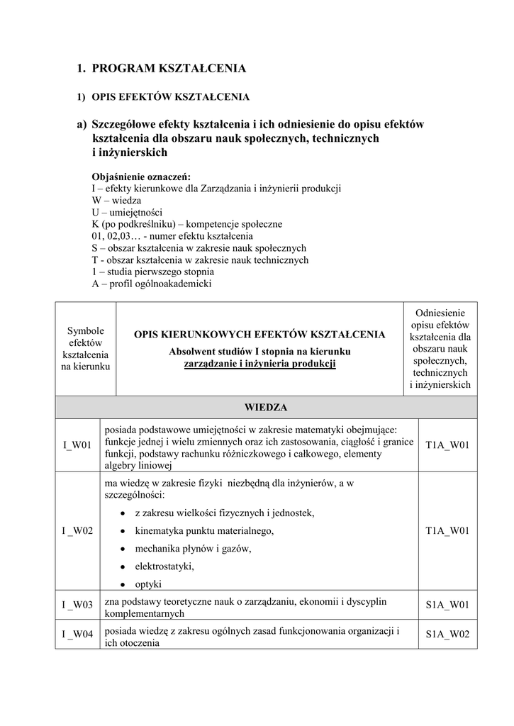 1. PROGRAM KSZTAŁCENIA 1) OPIS EFEKTÓW KSZTAŁCENIA a) Szczegółowe efekty kształcenia i ich odniesienie do opisu efektów kształcenia dla obszaru nauk społecznych, technicznych i inżynierskich Objaśnienie oznaczeń: I – efekty kierunkowe dla Zarządzania i inżynierii produkcji W – wiedza U – umiejętności K (po podkreślniku) – kompetencje społeczne 01, 02,03… - numer efektu kształcenia S – obszar kształcenia w zakresie nauk społecznych T - obszar kształcenia w zakresie nauk technicznych 1 – studia pierwszego stopnia A – profil ogólnoakademicki Symbole efektów kształcenia na kierunku OPIS KIERUNKOWYCH EFEKTÓW KSZTAŁCENIA Absolwent studiów I stopnia na kierunku zarządzanie i inżynieria produkcji Odniesienie opisu efektów kształcenia dla obszaru nauk społecznych, technicznych i inżynierskich WIEDZA I_W01 posiada podstawowe umiejętności w zakresie matematyki obejmujące: funkcje jednej i wielu zmiennych oraz ich zastosowania, ciągłość i granice funkcji, podstawy rachunku różniczkowego i całkowego, elementy algebry liniowej T1A_W01 ma wiedzę w zakresie fizyki niezbędną dla inżynierów, a w szczególności: z zakresu wielkości fizycznych i jednostek, I _W02 kinematyka punktu materialnego, T1A_W01 mechanika płynów i gazów, elektrostatyki, optyki I _W03 zna podstawy teoretyczne nauk o zarządzaniu, ekonomii i dyscyplin komplementarnych S1A_W01 I _W04 posiada wiedzę z zakresu ogólnych zasad funkcjonowania organizacji i ich otoczenia S1A_W02 I _W05 ma wiedzę pozwalającą mu diagnozować i rozwiązywać problemy związane z podstawowymi aspektami funkcjonowania organizacji w złożonym otoczeniu, w tym technicznym S1A_W04 I _W06 zna ogólne zasady tworzenia i rozwoju form indywidualnej przedsiębiorczości InzA_K02 I _W07 rozumie podstawowe mechanizmy funkcjonowania systemu finansowego, prawnego i politycznego państwa oraz struktur międzynarodowych, jak również ich wpływu na zarządzanie organizacją S1A_W03 I _W08 ma wiedzę o współczesnych technikach, technologiach i metodach informacyjno-komunikacyjnych wykorzystywanych w zarządzaniu organizacjami S1A_W06 I _W09 dostrzega istotę społecznych, ekologicznych i etycznych aspektów prowadzenia działalności gospodarczej, w tym bezpieczeństwa pracy S1A_W07 I _W10 zna podstawowe metody ilościowe i ich wykorzystanie w zarządzaniu organizacją S1A_W06 I _W11 ma wiedzę o podstawowych pojęciach i zasadach z zakresu ochrony własności przemysłowej oraz prawa autorskiego S1A_W10 I _W12 zna podstawowe pojęcia z zakresu systemów technicznych, procesów i technik produkcyjnych InzA_W02 I _W13 ma uporządkowaną i podbudowaną teoretycznie wiedzę ogólną obejmującą kluczowe zagadnienia z zakresu studiowanego kierunku studiów, w tym obejmującą zagadnienia rysunku technicznego i grafiki inżynierskiej T1A_W03 I _W14 ma wiedzę dotyczącą źródeł energii rozproszonej, w tym także źródeł odnawialnych T1A_W05 I _W15 zna podstawowe technologie inżynierskie (procesy technologiczne) w zakresie inżynierii produkcji InzA_W05 I _W16 orientuje się w obecnym stanie oraz najnowszych trendach rozwojowych w dziedzinie inżynierii materiałowej T1A_W05 I _W17 ma podstawową wiedzę o cyklu życia urządzeń i wyrobów przemysłowych InzA_W01 I _W18 ma podstawowa wiedzę z zakresu elektroniki i elektrotechniki i pomiarów wielkości elektrycznych i nieelektrycznych InzA_W01 I _W19 zna podstawowe metody, techniki, narzędzia i materiały stosowane przy rozwiązywaniu prostych zadań inżynierskich z zakresu inżynierii produkcji w wybranych gałęziach przemysłu InzA_W02 I _W20 ma podstawową wiedzę niezbędną do rozumienia społecznych, ekonomicznych, prawnych i środowiskowych uwarunkowań działalności inżynierskiej InzA_W03 I _W21 ma podstawową wiedzę w zakresie zarządzania, w tym zarządzania jakością i prowadzenia działalności gospodarczej InzA_W04 UMIEJĘTNOŚCI I _U01 potrafi prowadzić pomiary wielkości fizycznych i opracowywać ich wyniki, określać rodzaje niepewności pomiarowych i sposoby ich wyznaczania, umie wykorzystać prawa fizyki w technice i życiu codziennym T1A_U01 I _U02 potrafi dokonywać obserwacji i interpretacji zjawisk zachodzących w organizacji i jej otoczeniu; analizuje ich powiązania z różnymi obszarami działalności gospodarczej S1A_U01 I _U03 umie docierać do źródeł wiedzy i korzystać z nich w procesie analizowania konkretnych procesów i zjawisk S1A_U02 I _U04 potrafi wykorzystać standardowe narzędzia i metody w celu prognozowania procesów i zjawisk zachodzących w organizacji i jej otoczeniu S1A_U04 I _U05 potrafi wykorzystać zdobytą wiedzę w podejmowaniu decyzji i rozwiązywaniu problemów w pracy zawodowej S1A_U06 I _U06 potrafi wykorzystać zdobytą wiedzę z zakresu technik, technologii i metod informacyjno-komunikacyjnych wykorzystywanych w zarządzaniu organizacjami S1A_U04 I _U07 potrafi wykorzystać w pracy zawodowej podstawowe metody ilościowe stosowane w zarządzaniu organizacją S1A_U02 I _U08 potrafi interpretować i stosować normy prawne oraz reguły zawodowe i moralne S1A_U05 I _U09 posługuje się językiem obcym w zakresie zarządzania na poziomie odpowiadającym wymaganiom określonym dla poziomu B2 Europejskiego Systemu Opisu Kształcenia Językowego T1A_U06 I _U10 potrafi planować i przeprowadzać eksperymenty, w tym pomiary i symulacje komputerowe, interpretować uzyskane wyniki i wyciągać wnioski I _U11 potrafi wykorzystać metody analityczne, symulacyjne oraz eksperymentalne do formułowania i rozwiązywania zadań inżynierskich I _U12 potrafi przy formułowaniu i rozwiązywaniu zadań inżynierskich dostrzegać ich aspekty systemowe i pozatechniczne, w tym także ich InzA_U01 InzA_U02 InzA_U03 negatywne oddziaływanie na środowisko I _U13 potrafi dokonać wstępnej analizy ekonomicznej podejmowanych działań inżynierskich InzA_U04 I _U14 ma przygotowanie niezbędne do pracy w środowi
