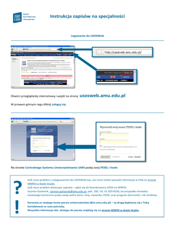 Instrukcja zapisów na specjalności Logowanie do USOSWeb Otwórz przeglądarkę internetową i wejdź na stronę usosweb.amu.edu.pl W prawym górnym rogu kliknij zaloguj się Na stronie Centralnego Systemu Uwierzytelniania UAM podaj swój PESEL i hasło ? ! Jeśli masz problem z zalogowaniem do USOSWeb (np. nie znasz hasła) sprawdź informacje w FAQ na stronie WNPiD w dziale Studia. Jeśli masz problem dotyczący zapisów – zgłoś się do Koordynatora USOS na WNPiD: Szymon Garbarek, [email protected], pok. 160, Tel. 61 829 6550, (w przypadku kontaktu mailowego koniecznie podaj swoje pełne dane: imię, nazwisko, PESEL oraz program (kierunek) i rok studiów). Korzystaj ze swojego konta poczty uniwersyteckiej (@st.amu.edu.pl) – tą drogą będziemy się z Tobą kontaktowad w razie potrzeby. Wszystkie informacje dot. dostępu do poczty znajdują się na stronie WNPiD w dziale Studia. Zapisy na specjalności Na czarnym pasku menu USOSWeb kliknij DLA STUDENTÓW Wybierz opcję Rejestracja W kalendarzu rejestracji zobaczysz wszystkie rejestracje, do których masz dostęp. Przy rejestracji „Zapisy na specjalności” kliknij Przejdź do rejestracji Ekran rejestracji Zapisy na specjalności korzystają z mechanizmu zapisów na przedmioty, dlatego dla każdej specjalności został utworzony tymczasowy „przedmiot” z jedną grupą wykładową. Zapisanie na specjalnośd polega na zapisaniu się na taki przedmiot – podobnie jak przy zapisach do grup zajęciowych. Na ekranie rejestracji widoczna jest lista specjalności do wyboru: Aby zapisad się na specjalnośd kliknij ikonę koszyka z zieloną strzałką Zapisanie na specjalnośd zostanie potwierdzone komunikatem Aby wypisad się ze specjalności kliknij ikonę koszyka z żółtą strzałką Wypisanie ze specjalności zostanie potwierdzone komunikatem Po kliknięciu na nazwę specjalności w kolumnie przedmiot pojawi się strona z opisem specjalności. Kooczenie pracy z USOSWeb Aby zakooczyd pracę z systemem USOSWeb należy kliknąd odnośnik WYLOGUJ SIĘ znajdujący się u góry strony.