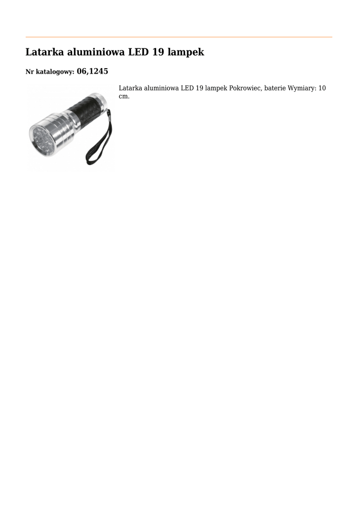 Latarka aluminiowa LED 19 lampek Nr katalogowy: 06,1245 Latarka aluminiowa LED 19 lampek Pokrowiec, baterie Wymiary: 10 cm.