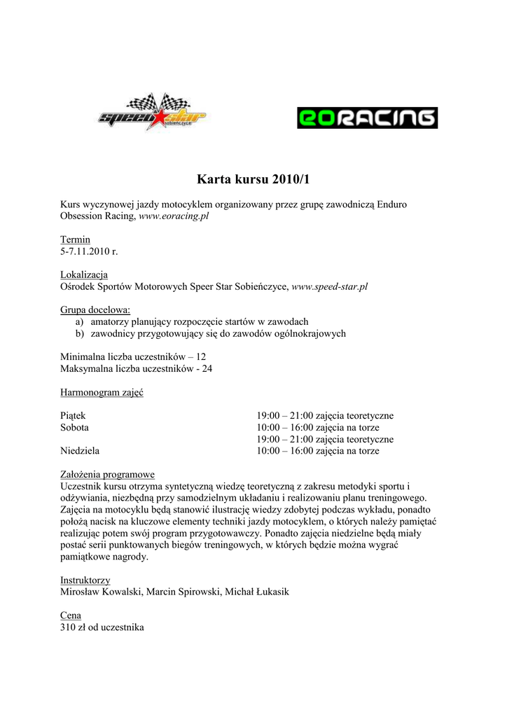 Karta kursu 2010/1 Kurs wyczynowej jazdy motocyklem organizowany przez grupę zawodniczą Enduro Obsession Racing, www.eoracing.pl Termin 5-7.11.2010 r. Lokalizacja Ośrodek Sportów Motorowych Speer Star Sobieńczyce, www.speed-star.pl Grupa docelowa: a) amatorzy planujący rozpoczęcie startów w zawodach b) zawodnicy przygotowujący się do zawodów ogólnokrajowych Minimalna liczba uczestników – 12 Maksymalna liczba uczestników - 24 Harmonogram zajęć Piątek Sobota Niedziela 19:00 – 21:00 zajęcia teoretyczne 10:00 – 16:00 zajęcia na torze 19:00 – 21:00 zajęcia teoretyczne 10:00 – 16:00 zajęcia na torze Założenia programowe Uczestnik kursu otrzyma syntetyczną wiedzę teoretyczną z zakresu metodyki sportu i odżywiania, niezbędną przy samodzielnym układaniu i realizowaniu planu treningowego. Zajęcia na motocyklu będą stanowić ilustrację wiedzy zdobytej podczas wykładu, ponadto położą nacisk na kluczowe elementy techniki jazdy motocyklem, o których należy pamiętać realizując potem swój program przygotowawczy. Ponadto zajęcia niedzielne będą miały postać serii punktowanych biegów treningowych, w których będzie można wygrać pamiątkowe nagrody. Instruktorzy Mirosław Kowalski, Marcin Spirowski, Michał Łukasik Cena 310 zł od uczestnika Cena zawiera: - udział w zajęciach kursu - materiały dydaktyczne Cena nie zawiera: - noclegu - wyżywienia - opłaty za podłączenie samochodu do prądu na terenie obiektu - opłaty za korzystanie z pryszniców na terenie obiektu Baza noclegowa 1. Pokoje Gościnne Konik Morski, 889-898-384; od 35zł/os 2. Pensjonat Karwia, 663-330-960; od 18zł/os 3. Pokoje Gościnne U Jacka, 660-245-660; od 25zł/os 4. Pokoje Pod Aniołami, 604-937-032; od 50zł/os Na terenie ośrodka Speer Star dostępna jest nowoczesna infrastruktura kempingowa z następującymi opłatami: - podłączenie do prądu 15zł / dobę od samochodu - korzystanie z pryszniców 7zł / dobę od osoby Kontakt Michał Łukasik +48 606 961 574 [email protected] Mirosław Kowalski +48 604 788 379 [email protected]