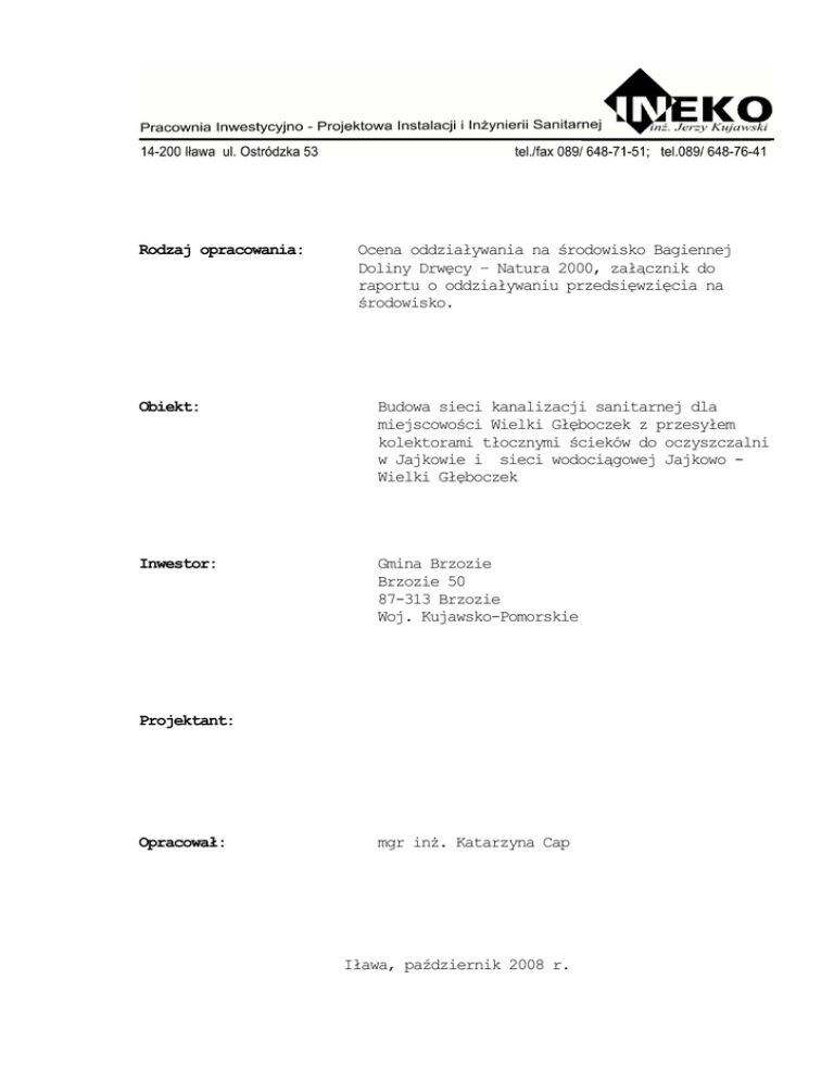 Rodzaj opracowania: Ocena oddziaływania na środowisko Bagiennej Doliny Drwęcy – Natura 2000, załącznik do raportu o oddziaływaniu przedsięwzięcia na środowisko. Obiekt: Budowa sieci kanalizacji sanitarnej dla miejscowości Wielki Głęboczek z przesyłem kolektorami tłocznymi ścieków do oczyszczalni w Jajkowie i sieci wodociągowej Jajkowo Wielki Głęboczek Inwestor: Gmina Brzozie Brzozie 50 87-313 Brzozie Woj. Kujawsko-Pomorskie Projektant: Opracował: mgr inŜ. Katarzyna Cap Iława, październik 2008 r. 1. WSTĘP Obszar Natura 2000, zgodnie z art.6 obowiązującej ustawy o ochronie przyrody z 16.04.2004r. wyróŜnia dwa typy obszarów: - obszary specjalne ochrony ptaków, - specjalne obszary ochrony siedlisk. Obszary Natura 2000 w swoich załoŜeniach tworzą spójną sieć, co oznacza, Ŝe kaŜdy element europejskiej sieci powinien przyczyniać się do zachowania siedlisk i gatunków wymienionych w załącznikach do Dyrektyw. Siedlisko przyrodnicze Przedmiotem ochrony w Natura 2000 są tzw. siedliska przyrodnicze. Zgodnie z ustawą termin ten oznacza obszar lądowy lub wodny, naturalny, półnaturalny lub antropogeniczny, wyodrębnione cechy geograficzne, abiotyczne i biotyczne. 2. OKREŚLENIE WYSTĘPOWANIA GATUNKÓW ORAZ SIEDLISK, DLA KTÓRYCH WYZNACZONO OBSZAR SPECJALNEJ OCHRONY Ze względu, Ŝe dolina jest ostoją ptaków o randze europejskiej została objęta Obszarem Natura 2000, nazwanym Bagienna Dolina Drwęcy (kod obszaru: PLB 040002). 2.1 Ochrona przyrody Na obszarze Bagiennej Doliny Drwęcy występują następujące formy ochrony: • • • Rezerwaty przyrody: Rzeka Drwęca (w woj. kujawsko-pomorskim 543,4ha) Park Krajobrazowy: Górznieńsko-Lidzbarski Obszar Chronionego Krajobrazu: Doliny Drwęcy 2.2 PołoŜenie Obszar Bagiennej Doliny Drwęcy (specjalnej ochrony ptaków) o pow. 3134,7 ha jest częścią Doliny Drwęcy na odcinku pomiędzy Toruniem a Olsztynem, którego granica biegnie wzdłuŜ krajowej drogi nr 15. 2.3 Historia geologiczna i ukształtowanie Kilkanaście tysięcy lat temu spływały, w miejscu obecnej Doliny Rzeki Drwęcy, z północy wody topniejącego lodowca Ŝłobiąc dolinę, później płynęła duŜa rzeka, teraz niewielka Drwęca nadal aktywnie kształtuje swą dolinę, zmieniając kształt swego koryta. Dolina ma od 0,6 do 3,0 km szerokości, zajęta jest przez bagna i łąki, pocięte systemem rowów. Pozostały tu takŜe liczne starorzecza. Koryto rzeki ma charakter naturalny, rzeka silnie meandruje, wczesną wiosną na ogół wylewa, tworząc rozległe rozlewiska. Tutejszy związany z rzeką ekosystem ma postać mozaiki siedlisk złoŜonej z lasów łęgowych, zarośli wierzbowych, trzcinowisk, turzycowisk i róŜnego rodzaju zespołów roślinności bagiennej oraz ekstensywnie uŜytkowanych łąk i pastwisk. 2 2.4 Flora Roślinność jest silnie zróŜnicowana. Występują dobrze zachowane gatunki charakterystyczne dla naturalnych dolin rzecznych. Występują tu szuwary o bogatym składzie gatunkowym, trzcinowiska, turzycowiska, łąki, zarośla wierzbowe, lasy iglaste i liściaste oraz roślinność wodna. Na obszarze Bagiennej Doliny Drwęcy moŜna wyróŜnić następujące klasy siedlisk: • bagna 6,00 % • grunty orne 7,00 % • lasy iglaste 30,00 % • lasy liściaste 4,00 % • lasy mieszane 6,00 % • łąki i pastwiska 42,00 % • miejsca eksploatacji odkrywkowej 1,00 % • tereny rolnicze z duŜym udziałem elementów naturalnych 4,00 % PrzewaŜającymi w Bagiennej Dolinie Drwęcy siedliskami są lasy zajmujące w sumie 46 % powierzchni ostoi, oraz tereny podmokłe – w tym łąki i pastwiska stanowiące 42 % obszaru. Siedliska występujące na obszarze Bagiennej Doliny Drwęcy: • Starorzecza i naturalne eutroficzne zbiorniki wodne ze zbiorowiskami z Nympheion, Potamion • Nizinne i podgórskie rzeki ze zbiorowiskami włosieniczników Ranunculion fluitantis • Ziołorośla górskie (Adenostylion alliariae) i ziołorośla nadrzeczne (Convolvuletalia sepium) • NiŜowe i górskie świeŜe łąki uŜytkowane ekstensywnie (Arrhenatherion elatioris) • Zmiennowilgotne łąki trzęślicowe (Molinion) • Torfowiska wysokie z roślinnością torfotwórczą (Ŝywe) • Torfowiska przejściowe i trzęsawiska (przewaŜnie z roślinnością z ScheuchzerioCaricetea) • Bory i lasy bagienne i brzozowo-sosnowe bagienne lasy borealne • Łęgi wierzbowe, topolowe, olszowe i jesionowe • Łęgowe lasy dębowo-wiązowo-jesionowe 2.5 Fauna DuŜe przestrzenie łąk, zalane tereny, kępy drzew i krzewów, a przede wszystkim słaba ingerencja rolnictwa w ekosystem stwarzają dogodne warunki do występowania bogatej awifauny. Siedliska tutejsze waŜne są dla gatunków roślin, owadów, ryb, płazów, ptaków, nietoperzy i innych zwierząt związanych z nieuregulowaną rzeką nizinną i stosunkowo mało zmienionymi podmokłymi terenami wokół niej. Bagienna Dolina Drwęcy jest ostoją ptaków o randze europejskiej, przede wszystkim ze względu na zatrzymujące się tu podczas wędrówek liczne stada gęsi białoczelnych. Łąki i mokradła nad Drwęcą są waŜnym miejscem Ŝerowania i odpoczynku takŜe wielu innych gatunków ptaków wodnych i błotnych, zatrzymujących się tu podczas wędrówek. W okresie lęgowym obszar zasiedla co najmniej 1% populacji krajowej podróŜniczka, gęgawy i gągoła. W licznym zagęszczeniu występuje rybitwa czarna. W okresie wędrówek stosunkowo duŜe koncentracje osiąga gęś białoczelna, świstun, roŜeniec i płaskonos; występuje pierzowisko gęgawy (do 300 osobników). Ptaki wodno-błotne występują w koncentracjach powyŜej 20000 osobników. 3 Ptaki • • • • • • • • • • • • • • • • • Zimorodek (Alcedo atthis) Gęś białoczelna (Anser albifrons) Orlik krzykliwy (Aquila pomarina) Bąk (Botaurus stellaris) Rybitwa czarna (Chlidonias niger) Bocian biały (Ciconia ciconia) Bocian czarny (Ciconia nigra) Błotnik stawowy (Circus aeruginosus) Derkacz (Crex 
