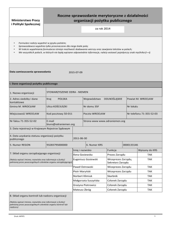 ZŽĐnjŶĞƐƉƌĂǁŽnjĚĂŶŝĞŵĞƌLJƚŽƌLJĐnjŶĞnjĚnjŝĂųĂůŶŽƑĐŝ ŽƌŐĂŶŝnjĂĐũŝƉŽǏLJƚŬƵƉƵďůŝĐnjŶĞŐŽ Ministerstwo Pracy ŝWŽůŝƚLJŬŝ^ƉŽųĞĐnjŶĞũ za rok 2014 • • • • &ŽƌŵƵůĂƌnjŶĂůĞǏLJǁLJƉĞųŶŝđǁũħnjLJŬƵƉŽůƐŬŝŵ͖ ^ƉƌĂǁŽnjĚĂǁĐĂǁLJƉĞųŶŝĂƚLJůŬŽƉƌnjĞnjŶĂĐnjŽŶĞĚůĂŶŝĞŐŽďŝĂųĞƉŽůĂ͖ tƚƌĂŬĐŝĞǁLJƉĞųŶŝĂŶŝĂĨŽƌŵƵůĂƌnjĂŝƐƚŶŝĞũĞŵŽǏůŝǁŽƑđĚŽĚĂǁĂŶŝĂǁŝĞƌƐnjLJŽƌĂnjnjĂǁŝũĂŶŝĂƚĞŬƐƚſǁǁƉŽůĂĐŚ͖ tĞǁƐnjLJƐƚŬŝĐŚƉŽůĂĐŚ͕ǁŬƚſƌLJĐŚŶŝĞďħĚČǁƉŝƐĂŶĞŽĚƉŽǁŝĞĚŶŝĞŝŶĨŽƌŵĂĐũĞ͕ŶĂůĞǏLJǁƐƚĂǁŝđƉŽũĞĚLJŶĐnjLJnjŶĂŬŵLJƑůŶŝŬĂ (--–). Data zamieszczenia sprawozdania 2015-07-09 /͘ĂŶĞŽƌŐĂŶŝnjĂĐũŝƉŽǏLJƚŬƵƉƵďůŝĐnjŶĞŐŽ 1. Nazwa organizacji STOWARZYSZENIE ODRA - NIEMEN 2. Adres siedziby i dane kontaktowe Kraj 'ŵŝŶĂD͘tZKBt POLSKA tŽũĞǁſĚnjƚǁŽK>EK_>^</ WŽǁŝĂƚD͘tZKBt hůŝĐĂ<K_/h^</ Nr domu 35F Nr lokalu DŝĞũƐĐŽǁŽƑđtZKBt Kod pocztowy 50-011 WŽĐnjƚĂtZKBt Nr telefonu 71-355-52-03 Nr faksu 71-355-52-02 E-mail [email protected] Strona www www.odraniemen.org ϯ͘ĂƚĂƌĞũĞƐƚƌĂĐũŝǁ<ƌĂũŽǁLJŵZĞũĞƐƚƌnjĞ^ČĚŽǁLJŵ ϰ͘ĂƚĂƵnjLJƐŬĂŶŝĂƐƚĂƚƵƐƵŽƌŐĂŶŝnjĂĐũŝƉŽǏLJƚŬƵ publicznego 5. Numer REGON 93283795000000 ϳ͘^ŬųĂĚŽƌŐĂŶƵnjĂƌnjČĚnjĂũČĐĞŐŽŽƌŐĂŶŝnjĂĐũŝ ;EĂůĞǏLJǁƉŝƐĂđŝŵŝŽŶĂ͕ŶĂnjǁŝƐŬĂŽƌĂnjŝŶĨŽƌŵĂĐũĞŽĨƵŶŬĐũŝ ƉĞųŶŝŽŶĞũƉƌnjĞnjƉŽƐnjĐnjĞŐſůŶLJĐŚĐnjųŽŶŬſǁŽƌŐĂŶƵnjĂƌnjČĚnjĂũČĐĞŐŽͿ 2011-06-30 6. Numer KRS 0000133146 /ŵŝħŝŶĂnjǁŝƐŬŽ Funkcja Wpisany do KRS Ilona Gosiewska WƌĞnjĞƐĂƌnjČĚƵ TAK Eugeniusz Gosiewski tŝĐĞƉƌĞnjĞƐĂƌnjČĚƵ͕ ^ĞŬƌĞƚĂƌnjĂƌnjČĚƵ TAK WĂǁĞųKƐƚƌŽǁƐŬŝ tŝĐĞƉƌĞnjĞƐĂƌnjČĚƵ TAK WŝŽƚƌDĂƌLJŷƐŬŝ tŝĐĞƉƌĞnjĞƐĂƌnjČĚƵ TAK Norbert Klimiuk Skarbnik TAK DĂųŐŽƌnjĂƚĂ^ƵƐnjLJŷƐŬĂ njųŽŶĞŬĂƌnjČĚƵ TAK 'ƌĂǏLJŶĂWŝŽƚƌŽǁŝĐnj njųŽŶĞŬĂƌnjČĚƵ TAK Mateusz Zbróg njųŽŶĞŬĂƌnjČĚƵ TAK ϴ͘^ŬųĂĚŽƌŐĂŶƵŬŽŶƚƌŽůŝůƵďŶĂĚnjŽƌƵŽƌŐĂŶŝnjĂĐũŝ ;EĂůĞǏLJǁƉŝƐĂđŝŵŝŽŶĂ͕ŶĂnjǁŝƐŬĂŽƌĂnjŝŶĨŽƌŵĂĐũĞŽĨƵŶŬĐũŝ ƉĞųŶŝŽŶĞũƉƌnjĞnjƉŽƐnjĐnjĞŐſůŶLJĐŚĐnjųŽŶŬſǁŽƌŐĂŶƵŬŽŶƚƌŽůŝůƵď nadzoru) Druk: MPiPS 1 9. Cele statutowe organizacji ;EĂůĞǏLJŽƉŝƐĂđĐĞůĞŶĂƉŽĚƐƚĂǁŝĞƐƚĂƚƵƚƵŽƌŐĂŶŝnjĂĐũŝͿ Druk: MPiPS /ŵŝħŝŶĂnjǁŝƐŬŽ Funkcja Wpisany do KRS Waldemar Kowalczyk njųŽŶĞŬ<ŽŵŝƐũŝ Rewizyjnej TAK Andrzej Michna njųŽŶĞŬ<ŽŵŝƐũŝ Rewizyjnej TAK Adam Fronczek njųŽŶĞŬ<ŽŵŝƐũŝ Rewizyjnej TAK ĞůĞŵ^ƚŽǁĂƌnjLJƐnjĞŶŝĂũĞƐƚƉŽďƵĚnjĂŶŝĞŝŶŝĐũĂƚLJǁŝŬŽŶƚĂŬƚſǁŵŝħĚnjLJ ŽďLJǁĂƚĞůĂŵŝƉĂŷƐƚǁĞƵƌŽƉĞũƐŬŝĐŚŝƉŽnjĂͲĞƵƌŽƉĞũƐŬŝĐŚ͕ĂƐnjĐnjĞŐſůŶŝĞ ůĞǏČĐLJĐŚǁĚŽƌnjĞĐnjĂĐŚƌnjĞŬKĚƌLJŝEŝĞŵŶĂƉŽƉƌnjĞnj͗ ĂͿŝŶƐƉŝƌŽǁĂŶŝĞ͕ǁƐƉŽŵĂŐĂŶŝĞŝƉƌŽǁĂĚnjĞŶŝĞǁƐnjĞĐŚƐƚƌŽŶŶĞũǁƐƉſųƉƌĂĐLJ WŽůŽŶŝŝŽƌĂnjWŽůĂŬſǁnjnjĂŐƌĂŶŝĐLJnjKũĐnjLJnjŶČǁĚnjŝĞĚnjŝŶĂĐŚ͗ŽƑǁŝĂƚLJ͕ŶĂƵŬŝ͕ kultury, religii, gospodarki, turystyki i sportu; ďͿĚnjŝĂųĂŶŝĞŶĂƌnjĞĐnjƉŽůƐŬŝĞŐŽĚnjŝĞĚnjŝĐƚǁĂŬƵůƚƵƌŽǁĞŐŽƉŽnjĂŐƌĂŶŝĐĂŵŝ kraju; ĐͿƉƌŽŵŽĐũĂŝǁƐƉŝĞƌĂŶŝĞĞĚƵŬĂĐũŝ͕ǁƚLJŵŐųſǁŶŝĞĞĚƵŬĂĐũŝŚŝƐƚŽƌLJĐnjŶĞũ͖ ĚͿǁƐƉŝĞƌĂŶŝĞǁƐƉſųƉƌĂĐLJŝŵŝħĚnjLJŶĂƌŽĚŽǁLJĐŚǁLJŵŝĂŶŵųŽĚnjŝĞǏLJ͕ǁ ƐnjĐnjĞŐſůŶŽƑĐŝŽĐŚĂƌĂŬƚĞƌnjĞŬƵůƚƵƌĂůŶLJŵ͕ĞĚƵŬĂĐLJũŶLJĐŚ͕ƐƉŽƌƚŽǁLJŵůƵď turystycznym; ĞͿŝŶƚĞŐƌŽǁĂŶŝĞĚnjŝĞĐŝŝŵųŽĚnjŝĞǏLJŶŝĞƉĞųŶŽƐƉƌĂǁŶĞũnjƉĞųŶŽƐƉƌĂǁŶČŽƌĂnj ǁƐƉŽŵĂŐĂŶŝĞnjĚƌŽǁĞŐŽƌŽnjǁŽũƵƉƐLJĐŚŝĐnjŶĞŐŽĚnjŝĞĐŝŝŵųŽĚnjŝĞǏLJ͖ ĨͿƵŵĂĐŶŝĂŶŝĞƚŽǏƐĂŵŽƑĐŝŝŬƵůƚƵƌLJŶĂƌŽĚŽǁĞũ͖ ŐͿǁƐƉŝĞƌĂŶŝĞƉŽǁƐƚĂǁĂŶŝĂŝƌŽnjǁŽũƵŽƌŐĂŶŝnjĂĐũŝƉŽnjĂƌnjČĚŽǁLJĐŚŽƌĂnj ƉƌŽŵŽǁĂŶŝĞƵĚnjŝĂųƵŽƌŐĂŶŝnjĂĐũŝƉŽnjĂƌnjČĚŽǁLJĐŚǁďƵĚŽǁŝĞ ƐƉŽųĞĐnjĞŷƐƚǁĂŽďLJǁĂƚĞůƐŬŝĞŐŽ͖ ŚͿƉƌŽŵŽǁĂŶŝĞǁƐƉſųĚnjŝĂųĂŶŝĂŽƌŐĂŶŝnjĂĐũŝƉŽnjĂƌnjČĚŽǁLJĐŚnjƐĂŵŽƌnjČĚĞŵ ƚĞƌLJƚŽƌŝĂůŶLJŵ͕ƐĞŬƚŽƌĞŵƉĂŷƐƚǁŽǁLJŵŝŐŽƐƉŽĚĂƌĐnjLJŵ͖ ŝͿĚnjŝĂųĂŶŝĂŶĂƌnjĞĐnjŽĐŚƌŽŶLJƉƌĂǁŝƐǁŽďſĚŽďLJǁĂƚĞůƐŬŝĐŚ͕ƌſǁŶLJĐŚƉƌĂǁ͕ ĚŽƐƚħƉƵŽďLJǁĂƚĞůŝĚŽŝŶĨŽƌŵĂĐũŝŽƌĂnjƉƌŽƉĂŐŽǁĂŶŝĂƉŽƐƚĂǁŽďLJǁĂƚĞůƐŬŝĞũ ĂŬƚLJǁŶŽƑĐŝŝŽĚƉŽǁŝĞĚnjŝĂůŶŽƑĐŝ͖ ũͿƵŵĂĐŶŝĂŶŝĞǁĂƌƚŽƑĐŝĚĞŵŽŬƌĂƚLJĐnjŶLJĐŚ͕ƉŽƐnjĂŶŽǁĂŶŝĂƉƌĂǁĂŝ ƉŽŬŽũŽǁĞŐŽǁƐƉſųǏLJĐŝĂŵŝħĚnjLJŶĂƌŽĚĂŵŝ͕ĂƚĂŬǏĞĚnjŝĂųĂůŶŽƑĐŝŶĂƵŬŽǁĞũ͕ eksperckiej, edukacyjnej i popularyzatorskiej dla realizacji szkolenia kadr ĂĚŵŝŶŝƐƚƌĂĐũŝƉƵďůŝĐnjŶĞũ͕ŐŽƐƉŽĚĂƌĐnjĞũůƵďůŽŬĂůŶLJĐŚůŝĚĞƌſǁƐƉŽųĞĐnjŶŽƑĐŝ͖ ŬͿĚnjŝĂųĂŶŝĞŶĂƌnjĞĐnjƌŽnjǁŽũƵĚŝĂůŽŐƵŵŝħĚnjLJWŽůĂŬĂŵŝŽƌĂnj ŵŶŝĞũƐnjŽƑĐŝĂŵŝŶĂƌŽĚŽǁLJŵŝŝĞƚŶŝĐnjŶLJŵŝ͖ ůͿĚnjŝĂųĂŶŝĂƐųƵǏČĐĞǁLJƌſǁŶLJǁĂŶŝƵƐnjĂŶƐŐƌƵƉƐųĂďƐnjLJĐŚůƵďnjĂŐƌŽǏŽŶLJĐŚ ƐƉŽųĞĐnjŶLJŵǁ