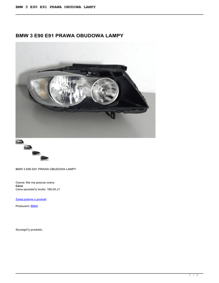 BMW 3 E90 E91 PRAWA OBUDOWA LAMPY BMW 3 E90 E91 PRAWA OBUDOWA LAMPY BMW 3 E90 E91 PRAWA OBUDOWA LAMPY Ocena: Nie ma jeszcze oceny Cena Cena sprzeda?y brutto: 180,00 z? Zadaj pytanie o produkt Producent: BMW Szczegó?y produktu O NAS Od wielu lat zajmujemy si? skupem i sprzeda?? lamp samochodowych. Posiadamy bogaty asortyment zarówno lamp u?ywanych pochodz?cych z demonta?u, jak i nowych cz??ci. Kupuj?c u nas masz pewno?? i gwarancj? rozruchow? towaru (14 dni od momentu odbioru). Istnieje mo?liwo?? zamówienia cz??ci, gdy? 2 razy w tygodniu realizowana jest nowa dostawa towaru. 1 / 3 BMW 3 E90 E91 PRAWA OBUDOWA LAMPY WYSY?KA Towar wysy?amy w tym samym dniu je?eli zamówienie zostanie z?o?one do godz.13:00 kurierem In Post lub Poczt? Polsk?. Po godz. 13:00 przesy?ka zostanie wys?ana w nast?pnym dniu roboczym. Istnieje mo?liwo?? wysy?ki paczek (forma p?atno?ci): - za pobraniem - przedp?ata na konto Przesy?ka z regu?y dociera na nast?pny dzie? roboczy. Paczki nadawane s? tylko w dni powszednie. Istnieje mo?liwo?? osobistego odbioru reflektorów po wcze?niejszej konsultacji. Maj? Pa?stwo prawo zwrotu zakupionego towaru w ci?gu 14 dni (ustawowo) wraz z dowodem zakupu i formularzem odst?pienia od umowy zawartym na naszej stronie : http://lampy-samochodowe.pl/media/files/Formularz_Odstapienia_OU.pdf bez podania przyczyny. Nie odbieramy przesy?ek za pobraniem. ZAKUP PRZEDMIOTU BMW 3 E90 E91 PRAWA OBUDOWA LAMPY 1. Wybierz produkt i dodaj go do koszyka. 2. Wybierz sposób zap?aty/ odbioru, uzupe?nij dane do wysy?ki 3. Ewentualne sugestie prosz? wpisa? w polu wiadomo??. 4. Oczekuj na kuriera- sprawd? zawarto?? przesy?ki przy odbiorze (wszystkie paczki s? ubezpieczone) . MODEL STRON OPIS STAN CENA /MARK A CZ??CI MAGA A ZYNO WY BMW 3 PRAWA PRZÓD , 21b-10 180,00 E90 OBUDO 0 PLN E91 WA LAMPY, BEZ KLOSZA, NA CZ??CI LUB DO NAPRA WY, UCH WYTY CA?E + DEKIELE K + SILNI CZEK PARAGON/FAKTURA Do ka?dej zakupionej cz??ci do??czamy paragon . Je?li ?ycz? Pa?stwo sobie faktur?, prosimy o informacj? wraz z danymi niezb?dnymi do jej wystawienia. KONTAKT: Wszelkie zapytania prosimy kierowa? na e-mail: [email protected] Wszystkie przedmioty s? dok?adnie opisane i skatalogowane. Je?li masz dodatkowe pytania prosimy o kontakt pod nr tel.: 2 / 3 BMW 3 E90 E91 PRAWA OBUDOWA LAMPY 798-986-497 GODZINY OTWARCIA: Pracujemy od poniedzia?ku do pi?tku w godz. 8:00- 16:00. STRONA WWW: www.lampy-samochodowe.pl ZAMIENNIKI: Nie kupuj zamienników na innych aukcjach. S? to cz??ci o krótkiej ?ywotno?ci i s?abej jako?ci wykonania. Pos?u?? na zdecydowanie krótszy czas ni? cz??ci oryginalne, mimo, ?e s? nowe. Zakup na naszych aukcjach jest jednoznaczny z akceptacj? regulaminu dost?pnego na naszej stronie. DZI?KUJEMY ZA ZAINTERESOWANIE 3 / 3 Powered by TCPDF (www.tcpdf.org)