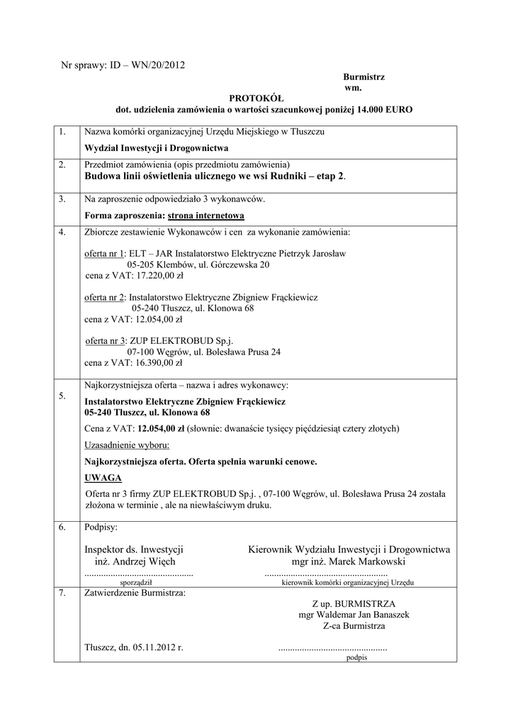 Nr sprawy: ID – WN/20/2012 Burmistrz wm. PROTOKÓŁ dot. udzielenia zamówienia o wartości szacunkowej poniżej 14.000 EURO 1. Nazwa komórki organizacyjnej Urzędu Miejskiego w Tłuszczu Wydział Inwestycji i Drogownictwa 2. Przedmiot zamówienia (opis przedmiotu zamówienia) Budowa linii oświetlenia ulicznego we wsi Rudniki – etap 2. 3. Na zaproszenie odpowiedziało 3 wykonawców. Forma zaproszenia: strona internetowa 4. Zbiorcze zestawienie Wykonawców i cen za wykonanie zamówienia: oferta nr 1: ELT – JAR Instalatorstwo Elektryczne Pietrzyk Jarosław 05-205 Klembów, ul. Górczewska 20 cena z VAT: 17.220,00 zł oferta nr 2: Instalatorstwo Elektryczne Zbigniew Frąckiewicz 05-240 Tłuszcz, ul. Klonowa 68 cena z VAT: 12.054,00 zł oferta nr 3: ZUP ELEKTROBUD Sp.j. 07-100 Węgrów, ul. Bolesława Prusa 24 cena z VAT: 16.390,00 zł Najkorzystniejsza oferta – nazwa i adres wykonawcy: 5. Instalatorstwo Elektryczne Zbigniew Frąckiewicz 05-240 Tłuszcz, ul. Klonowa 68 Cena z VAT: 12.054,00 zł (słownie: dwanaście tysięcy pięćdziesiąt cztery złotych) Uzasadnienie wyboru: Najkorzystniejsza oferta. Oferta spełnia warunki cenowe. UWAGA Oferta nr 3 firmy ZUP ELEKTROBUD Sp.j. , 07-100 Węgrów, ul. Bolesława Prusa 24 została złożona w terminie , ale na niewłaściwym druku. 6. Podpisy: Inspektor ds. Inwestycji inż. Andrzej Więch .............................................. sporządził 7. Kierownik Wydziału Inwestycji i Drogownictwa mgr inż. Marek Markowski .................................................... kierownik komórki organizacyjnej Urzędu Zatwierdzenie Burmistrza: Z up. BURMISTRZA mgr Waldemar Jan Banaszek Z-ca Burmistrza Tłuszcz, dn. 05.11.2012 r. .............................................. podpis