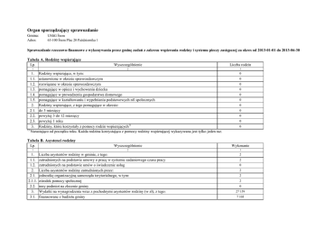 Organ sporządzający sprawozdanie Gmina: Adres: UMiG Śrem 63-100 Śrem Plac 20 Października 1 Sprawozdanie rzeczowo-finansowe z wykonywania przez gminę zadań z zakresu wspierania rodziny i systemu pieczy zastępczej za okres od 2013-01-01 do 2013-06-30 Tabela A. Rodziny wspierające Lp. Wyszczególnienie 1 2 1. Rodziny wspierające, w tym: 1.1. ustanowione w okresie sprawozdawczym 1.2. rozwiązane w okresie sprawozdawczym 1.3. pomagające w opiece i wychowaniu dziecka 1.4. pomagające w prowadzeniu gospodarstwa domowego 1.5. pomagające w kształtowaniu i wypełnianiu podstawowych ról społecznych 2. Rodziny wspierające, z tego pomagające w okresie: 2.1. do 3 miesięcy 2.2. powyżej 3 do 12 miesięcy 2.3. powyżej 1 roku 3. Rodziny, które korzystały z pomocy rodzin wspierających1) 1) Narastająco od początku roku. Każda rodzina korzystająca z pomocy rodziny wspierającej wykazywana jest tylko jeden raz. Liczba rodzin 3 0 0 0 0 0 0 0 0 0 0 0 Tabela B. Asystenci rodziny Lp. Wyszczególnienie 1 2 1. 1.1. 1.2. 2. 2.1. 2.1.1. 2.2. 3. 3.1. Liczba asystentów rodziny w gminie, z tego: zatrudnionych na podstawie umowy o pracę w systemie zadaniowego czasu pracy zatrudnionych na podstawie umów o świadczenie usług Liczba asystentów rodziny zatrudnionych przez: jednostkę organizacyjną samorządu terytorialnego, w tym: ośrodek pomocy społecznej inny podmiot na zlecenie gminy Wydatki na wynagrodzenia wraz z pochodnymi asystentów rodziny (w zł), z tego: finansowane z budżetu gminy Wykonanie 3 2 2 0 2 2 2 0 27 159 7 103 Lp. Wyszczególnienie 1 2 Wykonanie 3 3.2. finansowane z innych źródeł 0 4. Liczba rodzin zobowiązanych przez sąd do pracy z asystentem rodziny 36 5. Liczba rodzin korzystających z usług asystentów rodziny, z tego: 10 5.1. do 3 miesięcy 9 5.2. powyżej 3 do 12 miesięcy 17 5.3. powyżej 1 roku 9 6. Przeciętny czas pracy asystenta z rodziną1) 2 7. Liczba rodzin, z którymi asystent rodziny zakończył pracę, w tym: 0 7.1. ze względu na osiągnięcie celów 1 7.2. ze względu na zaprzestanie współpracy przez rodzinę 0 7.3. ze względu na brak efektów 1 7.4. ze względu na zmianę metody pracy 2) 36 8. Liczba rodzin, które korzystały z usług asystentów rodziny 1) Przeciętny czas pracy asystenta z rodziną podaje się w miesiącach z dokładnością do jednego miesiąca, wykazując miesiąc rozpoczęty jako miesiąc pełny. 2) Narastająco od początku roku. Każda rodzina korzystająca z pomocy asystenta wykazywana jest tylko jeden raz. 20 056 Tabela C. Placówki wsparcia dziennego Lp. Wyszczególnienie Ogółem w tym placówek/w placówkach prowadzonych przez inne podmioty niż gmina 1 2 3 4 0 0 1. Liczba placówek wsparcia dziennego, w tym prowadzone w formie: 0 0 1.1. opiekuńczej 0 0 1.2. specjalistycznej 0 0 1.3. pracy podwórkowej realizowanej przez wychowawcę 0 0 2. Liczba miejsc 1) 0 0 3. Przeciętna liczba umieszczonych dzieci 0 0 4. Wydatki (w zł)2) 1) Przeciętną liczbę umieszczonych dzieci oblicza się, dzieląc sumę liczby dzieci umieszczonych w poszczególnych dniach okresu sprawozdawczego przez liczbę dni funkcjonowania placówki w okresie sprawozdawczym, podając z dokładnością do jednej osoby. 2) W ramach wydatków wykazuje się wydatki bieżące. Osoba sporządzająca sprawozdanie imię i nazwisko: Alicja Jankowiak telefon: 612836107 e-mail: [email protected] data: 2013-06-29