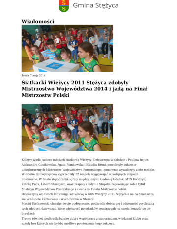 Wiadomości Środa, 7 maja 2014 Siatkarki Wieżycy 2011 Stężyca zdobyły Mistrzostwo Województwa 2014 i jadą na Finał Mistrzostw Polski Kolejny wielki sukces młodych siatkarek Wieżycy. Dziewczęta w składzie : Paulina Rejter, Aleksandra Gostkowska, Agata Piankowska i Klaudia Bronk powtórzyły sukces z ubiegłorocznych Mistrzostw Województwa Pomorskiego i ponownie wywalczyły złote medale. W drodze do zwycięstwa wyprzedziły 32 zespoły wygrywając w kolejnych etapach mistrzostw. W finale stężyczanki ograły między innymi Gedanię Gdańsk, MTS Kwidzyn, Zatokę Puck, Libero Starogard, oraz zespoły z Gdyni i Słupska zapewniając sobie tytuł Mistrzyń Województwa Pomorskiego i awans do Finału Mistrzostw Polski. Dziewczyny od dwóch lat trenują siatkówkę w GKS Wieżycy 2011 Stężyca a na co dzień uczą się w Zespole Kształcenia i Wychowania w Stężycy. Maciej Stefanowski chwaląc swoje podopieczne, podkreśla dobrą grę i odporność psychiczną tych młodych dziewcząt, które większość pojedynków rozstrzygały na swoją korzyść po tiebreakach. Trener również podkreśla bardzo dobrą współpracę z samorządem, władzami klubu oraz szkołą bez których nie byłoby możliwe powtórzenie tego sukcesu.
