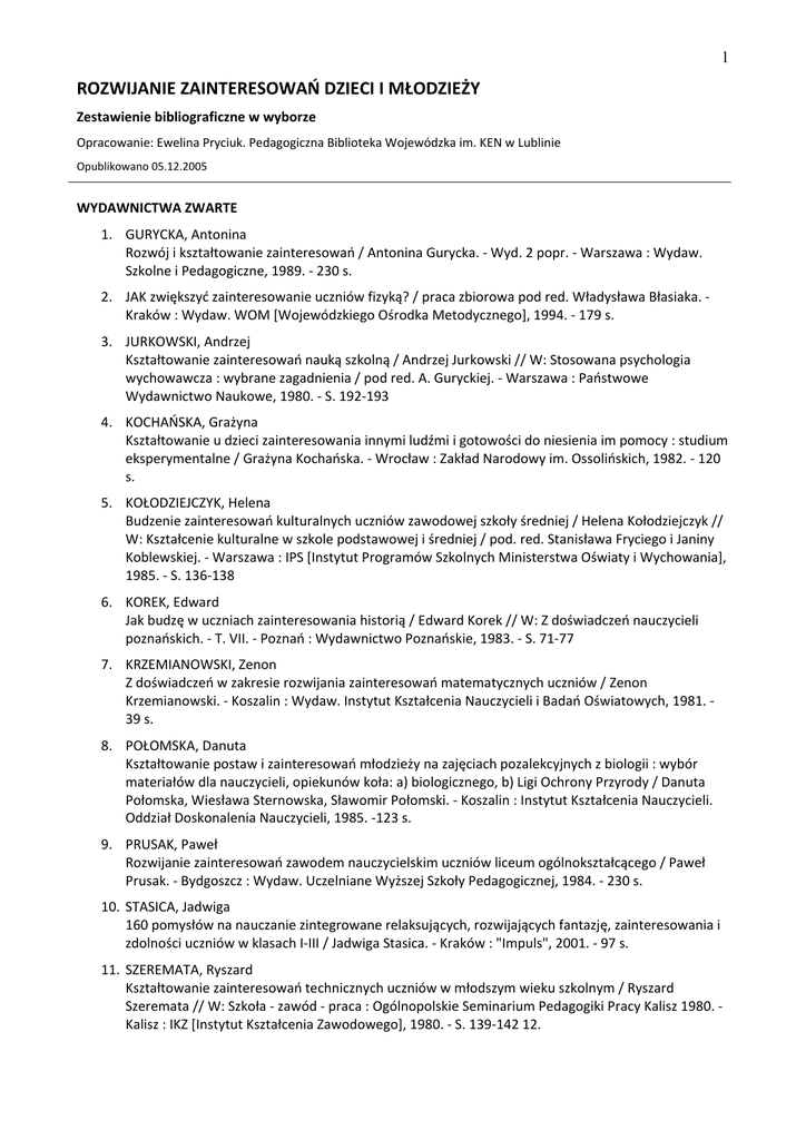 1 ROZWIJANIE ZAINTERESOWAŃ DZIECI I MŁODZIEŻY Zestawienie bibliograficzne w wyborze Opracowanie: Ewelina Pryciuk. Pedagogiczna Biblioteka Wojewódzka im. KEN w Lublinie Opublikowano 05.12.2005 WYDAWNICTWA ZWARTE 1. GURYCKA, Antonina Rozwój i kształtowanie zainteresowań / Antonina Gurycka. - Wyd. 2 popr. - Warszawa : Wydaw. Szkolne i Pedagogiczne, 1989. - 230 s. 2. JAK zwiększyć zainteresowanie uczniów fizyką? / praca zbiorowa pod red. Władysława Błasiaka. Kraków : Wydaw. WOM [Wojewódzkiego Ośrodka Metodycznego], 1994. - 179 s. 3. JURKOWSKI, Andrzej Kształtowanie zainteresowań nauką szkolną / Andrzej Jurkowski // W: Stosowana psychologia wychowawcza : wybrane zagadnienia / pod red. A. Guryckiej. - Warszawa : Państwowe Wydawnictwo Naukowe, 1980. - S. 192-193 4. KOCHAŃSKA, Graryna Kształtowanie u dzieci zainteresowania innymi ludźmi i gotowości do niesienia im pomocy : studium eksperymentalne / Graryna Kochańska. - Wrocław : Zakład Narodowy im. Ossolińskich, 1982. - 120 s. 5. KOŁODZIEJCZYK, Helena Budzenie zainteresowań kulturalnych uczniów zawodowej szkoły średniej / Helena Kołodziejczyk // W: Kształcenie kulturalne w szkole podstawowej i średniej / pod. red. Stanisława Fryciego i Janiny Koblewskiej. - Warszawa : IPS [Instytut Programów Szkolnych Ministerstwa Oświaty i Wychowania], 1985. - S. 136-138 6. KOREK, Edward Jak budzę w uczniach zainteresowania historią / Edward Korek // W: Z doświadczeń nauczycieli poznańskich. - T. VII. - Poznań : Wydawnictwo Poznańskie, 1983. - S. 71-77 7. KRZEMIANOWSKI, Zenon Z doświadczeń w zakresie rozwijania zainteresowań matematycznych uczniów / Zenon Krzemianowski. - Koszalin : Wydaw. Instytut Kształcenia Nauczycieli i Badań Oświatowych, 1981. 39 s. 8. POŁOMSKA, Danuta Kształtowanie postaw i zainteresowań młodziery na zajęciach pozalekcyjnych z biologii : wybór materiałów dla nauczycieli, opiekunów koła: a) biologicznego, b) Ligi Ochrony Przyrody / Danuta Połomska, Wiesława Sternowska, Sławomir Połomski. - Koszalin : Instytut Kształcenia Nauczycieli. Oddział Doskonalenia Nauczycieli, 1985. -123 s. 9. PRUSAK, Paweł Rozwijanie zainteresowań zawodem nauczycielskim uczniów liceum ogólnokształcącego / Paweł Prusak. - Bydgoszcz : Wydaw. Uczelniane Wyrszej Szkoły Pedagogicznej, 1984. - 230 s. 10. STASICA, Jadwiga 160 pomysłów na nauczanie zintegrowane relaksujących, rozwijających fantazję, zainteresowania i zdolności uczniów w klasach I-III / Jadwiga Stasica. - Kraków : "Impuls", 2001. - 97 s. 11. SZEREMATA, Ryszard Kształtowanie zainteresowań technicznych uczniów w młodszym wieku szkolnym / Ryszard Szeremata // W: Szkoła - zawód - praca : Ogólnopolskie Seminarium Pedagogiki Pracy Kalisz 1980. Kalisz : IKZ [Instytut Kształcenia Zawodowego], 1980. - S. 139-142 12. 2 12. Kształtowanie zainteresowań uczniów zawodami rolniczymi / Jan Szurek. - Warszawa : Wydaw. Szkolne i Pedagogiczne, 1980. - 154 s. 13. WOJNAR, Józefa Zyta Budzenie zainteresowań kulturalnych uczniów technikum / Józefa Zyta Wojnar // W: Kształcenie kulturalne w szkole podstawowej i średniej / pod. red. Stanisława Fryciego i Janiny Koblewskiej. Warszawa : IPS [Instytut Programów Szkolnych Ministerstwa Oświaty i Wychowania], 1985. - S. 134-135 14. WOJTCZAK, Jadwiga Budzenie zainteresowań czytelniczych uczniów szkoły zawodowej / Jadwiga Wojtczak // W: Kształcenie kulturalne w szkole podstawowej i średniej / pod. red. Stanisława Fryciego i Janiny Koblewskiej. - Warszawa : IPS [Instytut Programów Szkolnych Ministerstwa Oświaty i Wychowania], 1985. - S. 134-135 15. Rozwój i kształtowanie zainteresowań sportowych dzieci i młodziery / Janusz Zdebski // W: Studia z psychologii i psycholingwistyki : tom poświęcony pamięci Marii Przetacznik-Gierowskiej / pod. red. Magdaleny Smoczyńskiej. - Kraków : Towarzystwo Autorów i Wydawców Prac Naukowych, cop. 1998. - S. 129-135 ARTYKUŁY Z CZASOPISM 16. ARMATYS, Danuta Jak rozwijać zainteresowania czytelnicze uczniów / Danuta Armatys, Małgorzata Żytkiewicz // Język Polski w Gimnazjum. - 2002/2003, nr 2, s. 18-21 17. BIGAJ, Janusz Wakacyjne obozy - szkołą kształtowania zainteresowań biologicznych / Janusz Bigaj, Barbara Płytycz // Biologia w Szkole. - 1984, nr 1, s. 31-35 18. CHAŁAS, Krystyna Jak rozwijać zainteresowania i uzdolnienia techniczne uczniów w szkole podstawowej / Krystyna Chałas // Ruch Nauczycielski. - 1990, nr 2/12, s. 195-221 19. 19. O rozwijaniu zainteresowań matematyką w średniej szkole zawodowej / Antoni Chronowski // Szkoła Zawodowa. - 1980, nr 1, s. 19-20 20. CUDAK, Henryk Kształtowanie i rozwój zainteresowań uczniów w wielostronnym uczeniu się / Henryk Cudak, Marian Jakubowski // Ruch Pedagogiczny. - 1982, nr 4, s. 68-77 21. DĄBROWA, Marian Wpływ zabytków sztuki na rozwój zainteresowań uczniów przeszłością własnego środowiska / Marian Dąbrowa // Przegląd Oświatowo-Wychowawczy. - 1983, nr 1-4, s. 118-121 22. 22. O naturalnych zainteresowaniach uczniów klas początkowych i ich rozwijaniu w kierunku matematycznym / Władysław Dubiel // Nauczanie Początkowe. - 1996/1997, nr 3, s. 92-95 23. EREŃSKA-SUSZEK, Ewa Inspirująca rola nauczyciela w procesie rozbudzania zainteresowań muzycznych dzieci i młodziery / Ewa Ereńska-Suszek // Wychowanie Muzyczne w Szkole. - 1987, nr 5, s. 317-318 24. GAJEK, Elrbieta Poznajemy rodzaje pisma / Elrbieta Gajek // Wychowanie w Przedszkolu. - 2005, nr 2, s. 45-47 Ćwiczenia dla dzieci mające na celu pobudzenie zainteresowania rórnymi językami. 25. GÓRECKA, Alicja Rozwijanie zdolności ogólnych i zainteresowań uczniów klas początkowych / Alicja Górecka // Nauczanie Początkowe. - 2000/2001, nr 1, s. 69-84 3 26. GÓRNIEWICZ, Józef Czynniki rozwoju zainteresowań dzieci 9-10 letnich (z badań) / Józef Górniewicz // Nowa Szkoła. 1987, nr 5, s. 288-293 27. GRUBA, Joanna Rozwój zainteresowań informatycznych uczniów klas młodszych / Joanna Gruba, Pi