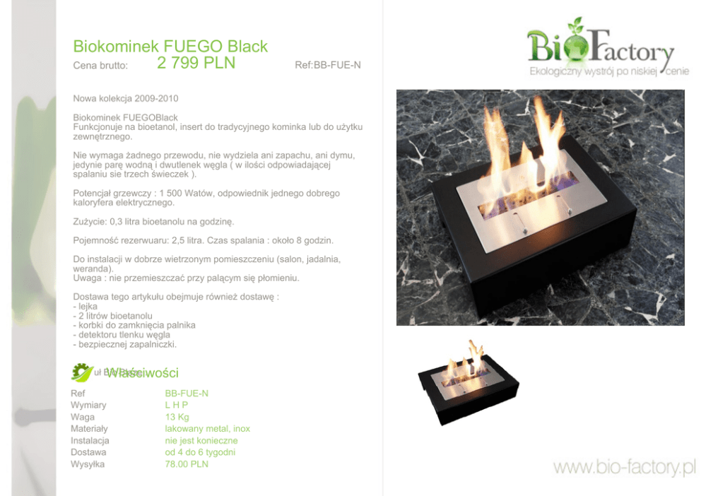 Biokominek FUEGO Black 2 799 PLN Cena brutto: Ref: BB-FUE-N Nowa kolekcja 2009-2010 Biokominek FUEGOBlack Funkcjonuje na bioetanol, insert do tradycyjnego kominka lub do użytku zewnętrznego. Nie wymaga żadnego przewodu, nie wydziela ani zapachu, ani dymu, jedynie parę wodną i dwutlenek węgla ( w ilości odpowiadającej spalaniu sie trzech świeczek ). Potencjał grzewczy : 1 500 Watów, odpowiednik jednego dobrego kaloryfera elektrycznego. Zużycie: 0,3 litra bioetanolu na godzinę. Pojemność rezerwuaru: 2,5 litra. Czas spalania : około 8 godzin. Do instalacji w dobrze wietrzonym pomieszczeniu (salon, jadalnia, weranda). Uwaga : nie przemieszczać przy palącym się płomieniu. Dostawa tego artykułu obejmuje również dostawę : - lejka - 2 litrów bioetanolu - korbki do zamknięcia palnika - detektoru tlenku węgla - bezpiecznej zapalniczki. Artykuł Bio Blaze... Właściwości Ref Wymiary Waga Materiały Instalacja Dostawa Wysyłka BB-FUE-N LHP 13 Kg lakowany metal, inox nie jest konieczne od 4 do 6 tygodni 78.00 PLN