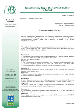 Bystra 2011-01-21 Zamówienia Publiczne Tel./Fax (33) 4991 810 Nr sprawy: 1/EZP/380/EAE/1/2011 Wykonawcy - wg rozdzielnika Wszyscy zainteresowani [email protected] Wyjaśnienie i zmiana treści siwz Dotyczy: postępowania przetargowego na wykonanie zabezpieczeń przeciwpoŜarowych w Pawilonach awilonach nr 4 oraz 2c 2 z apteką,, w ramach zadania „Zabezpieczenie poŜarowe po budynków Specjalistycznego Zespołu Chorób Płuc i Gruźlicy Gru licy w Bystrej Bystrej” - nr sprawy: 1/EZP/380/EAE/1/2011 EZP/380/EAE/1/2011 W związku zku ze złoŜonymi zło zapytaniami dotyczącymi treści siwz, stosownie tosownie do art. 38 ust 1 i 2 ustawy z dnia 29 stycznia 2004 r. Prawo zamówień zamówie publicznych, Specjalistyczny Zespół Chorób Płuc i Gruźlicy Gru w Bystrej wyjaśnia: Pytanie nr 1 rze robót występuje wyst pozycja 2.4 dostawa drzwi DP3 w ilości ilo 6 sztuk, natomiast W przedmiarze w zestawieniu stolarki drzwi DP3 D są wykreślone – Pawilon 2c. Czy w/w drzwi naleŜy nale wycenić ? Odpowiedź W poz. 2.4 przedmiaru nie ma mowa o drzwiach DP3. Pytającemu Pytaj cemu chodziło zapewne o poz. 2.3, w której omyłkowo podano 6 szt. drzwi DP3. Winno być: by 3 szt. drzwi DP3. być W załączeniu zeniu zmieniony zmieniony przedmiar robót oraz zmienione zestawienie stolarki. Pytanie nr 2 W dokumentacji przetargowej brakuje rzutów apteki. Są one konieczne dla właściwego wła umiejscowienia montaŜu m drzwi. Odpowiedź W ramach przedmiotowego zadania nie zaprojektowano montaŜu drzwi w części cz budynku, w której zlokalizowana jest apteka. Pytanie nr 3 Proszę o doprecyzowanie ile otworów nale naleŜy przygotować pod montaŜ monta stolarki drzwiowej oraz jaki jest zakres tych prac (nadproŜa, (nadpro kucie, murowanie) – Pawilon 2c wraz z apteką. aptek Odpowiedź 23 otwory. Zakres prac – zgodnie z opisem pozycji przedmiarowej 2.4 przedmiaru zamiennego, stanowiącego stanowi załącznik do niniejszego pisma. Pytanie nr 4 W dokumentacji przetargowej brakuje rzutów Pawilonu nr 4. Są S one konieczne dla właściwego umiejscowienia drzwi. drzwi Odpowiedź Zamawiający uzupełnił dokumentację dokumentacj o w/w rzuty architektoniczne w dniu 19.01.2011 pismem wyjaśniaj śniającym treść siwz. Strona 1 z 4 Pytanie nr 5 Proszę o doprecyzowanie ile otworów naleŜy przygotować pod montaŜ stolarki drzwiowej, oraz jaki jest zakres tych prac (nadproŜa, kucie, murowanie) – Pawilon 4 Odpowiedź Zgodnie z dokumentacją projektową, w szczególności rzutami architektonicznymi udostępnionymi w dniu 19.01.2011 r. Pytanie nr 6 W dokumentacji przetargowej brakuje 2 stron postanowienia nr 168/2010. Odpowiedź Pełna treść postanowienia 168/2010 w załączeniu. Pytanie nr 7 Czy w drzwiach naleŜy zamontować zamki antypaniczne?. Odpowiedź Nie. Pytanie nr 8 Czy w/w budynki posiadają centrale oddymiania oraz centrale sterowania drzwiami? Brak takich pozycji w przedmiarze. Odpowiedź Zgodnie z wyjaśnieniami z dnia 19.01.2011 r. Pytanie nr 9 W dokumentacji przetargowej brak informacji odnośnie systemu oddymiania – rysunki. Odpowiedź Rysunki udostępniono wraz z wyjaśnieniami z dnia 19.01.2011 r. Pytanie nr 10 W przedmiarze brak central sterujących oddymianiem (są w projekcie) Odpowiedź Dostawę i montaŜ central oddymiania naleŜy uwzględnić w kosztorysie ofertowym jako dodatkowe pozycje. Pytanie nr 11 W której pozycji naleŜy ująć centrale i dodatkowe moduły? Odpowiedź Dostawę i montaŜ central oddymiania i modułów naleŜy uwzględnić w kosztorysie ofertowym jako dodatkowe pozycje. Pytanie nr 12 Do trzymaczy elektromagnetycznych w takiej ilości powinna być dodatkowa centrala sterująca czy naleŜy ją doliczyć ? Odpowiedź Projekt przewiduje odpowiednią centralę. NaleŜy wycenić i wykonać zgodnie z projektem. Pytanie nr 13 W przedmiarze brak pozycji czujek dymu i sygnalizatorów, czy naleŜy je ująć? Odpowiedź NaleŜy ująć tylko czujki dymu – zgodnie z projektem. Pytanie nr 14 Ilości z przedmiaru są inne niŜ w opisie i zestawieniu materiałów w projekcie dotyczącym oddymiania. Proszę o podanie faktycznej ilości. Odpowiedź NaleŜy przyjąć ilości, zgodnie z pismami wyjaśniającymi oraz załączonymi do wyjaśnień rysunkami. Strona 2 z 4 Pytanie 15 Wymiary klap oddymiających to wymiary zewnętrzne czy wewnętrzne? (prześwit po otwarciu) Odpowiedź Wewnętrzne. Pytanie nr 16 Brak przycisku przewietrzania. Czy przycisk RT ma równieŜ słuŜyć do przewietrzania? Odpowiedź NaleŜy zamontować przycisk typu RT42PL – zgodnie z projektem. Osobny przycisk przewietrzania nie będzie montowany. Pytanie nr 17 W przedmiarze robót elektrycznych dla budynku P4 (zał. nr 3.2) oraz przedmiarze dla budynku P2c (zał. nr 3.4) brak pozycji z dostawą i montaŜem central oddymiania RZN, modułów sterujących TR-42 i IM 44-K. Czy wykonawca ma dostarczyć jedynie urządzenia objęte przedmiarem robót, czy powinien uwzględnić centrale oddymiania i moduły sterujące niezbędne do pracy systemu oddymiania? Odpowiedź Zgodnie z wyjaśnieniami z dnia 19.01.2011 r. Pytanie nr 18 W ramach dokumentacji przetargowej brak rysunków jednego z budynków – Pawilon nr 4. Brak teŜ części rysunkowej dot., części elektrycznej obejmowanej w ramach przedmiarów elektrycznych. Prosimy o jej udostępnienie na stronie internetowej przetargu. Odpowiedź Rysunki dla Pawilonu 4 udostępniono w dniu 19.01.2011 r. Brakujące rysunki do części elektrycznej – udostępnione jako załącznik do niniejszego pisma. Pytanie nr 19 Czy do drzwi z elektrotrzymaczami naleŜy zastosować RKZ (z kolejnością zamykania dwóch skrzydeł), czy zwykłe samozamykacze bez blokady np. GEZE 2000? Odpowiedź NaleŜy zamontować zamykacze umoŜliwiające zamykanie skrzydeł w odpowiedniej kolejności. Pytanie nr 20 Czy drzwi DP5 w pawilonie nr 4 mają być o ognioodporności EI30, gdyŜ w zestawieniu stolarki nie jest to określone? Odpowiedź NaleŜy wycenić zgodnie z zestawieni