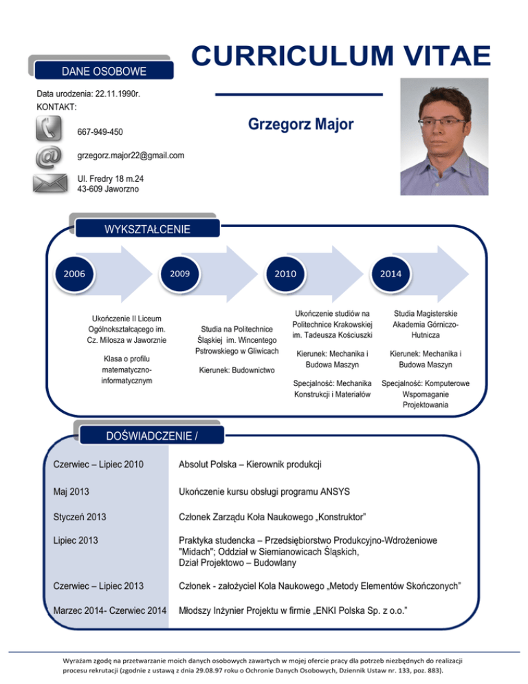 CURRICULUM VITAE DANE OSOBOWE Data urodzenia: 22.11.1990r. KONTAKT: Grzegorz Major 667-949-450 [email protected] Ul. Fredry 18 m.24 43-609 Jaworzno WYKSZTAŁCENIE 2006 2010 2009 Ukończenie II Liceum Ogólnokształcącego im. Cz. Milosza w Jaworznie Klasa o profilu matematycznoinformatycznym Studia na Politechnice Śląskiej im. Wincentego Pstrowskiego w Gliwicach Kierunek: Budownictwo 2014 Ukończenie studiów na Politechnice Krakowskiej im. Tadeusza Kościuszki Studia Magisterskie Akademia GórniczoHutnicza Kierunek: Mechanika i Budowa Maszyn Kierunek: Mechanika i Budowa Maszyn Specjalność: Mechanika Konstrukcji i Materiałów Specjalność: Komputerowe Wspomaganie Projektowania W DOŚWIADCZENIE / KURSY Czerwiec – Lipiec 2010 Absolut Polska – Kierownik produkcji Maj 2013 Ukończenie kursu obsługi programu ANSYS Styczeń 2013 Członek Zarządu Koła Naukowego „Konstruktor” Lipiec 2013 Praktyka studencka – Przedsiębiorstwo Produkcyjno-Wdrożeniowe "Midach"; Oddział w Siemianowicach Śląskich, Dział Projektowo – Budowlany Czerwiec – Lipiec 2013 Członek - założyciel Kola Naukowego „Metody Elementów Skończonych” Marzec 2014- Czerwiec 2014 Młodszy Inżynier Projektu w firmie „ENKI Polska Sp. z o.o.” Wyrażam zgodę na przetwarzanie moich danych osobowych zawartych w mojej ofercie pracy dla potrzeb niezbędnych do realizacji procesu rekrutacji (zgodnie z ustawą z dnia 29.08.97 roku o Ochronie Danych Osobowych, Dziennik Ustaw nr. 133, poz. 883). PRACE NAUKOWE „Obliczanie nieliniowej utraty stateczności w konstrukcjach ramowych w programie Ansys.” „Symulacja numeryczna propagacji fal sprężystych w celu detekcji uszkodzeń.” DODATKOWE UMIEJĘTNŚCI OBSŁUGA PROGRAMÓW KOMPUTEROWYCH: Autodesk AutoCad JĘZYKI OBCE: Angielski AutoDesk Inventor Niemiecki SolidWorks DODATKOWE UMIEJĘTNOŚCI: ANSYS MathCad Prawo jazdy ( kategoria B) MS Office Patent Żeglarza Jachtowego Catia v5 ZAINTERESOWANIA żeglarstwo narciarstwo alpejskie piłka nożna motoryzacja CECHY CHARAKTERU Wyrażam zgodę na przetwarzanie moich danych osobowych zawartych w mojej ofercie pracy dla potrzeb niezbędnych do realizacji procesu rekrutacji (zgodnie z ustawą z dnia 29.08.97 roku o Ochronie Danych Osobowych, Dziennik Ustaw nr. 133, poz. 883).