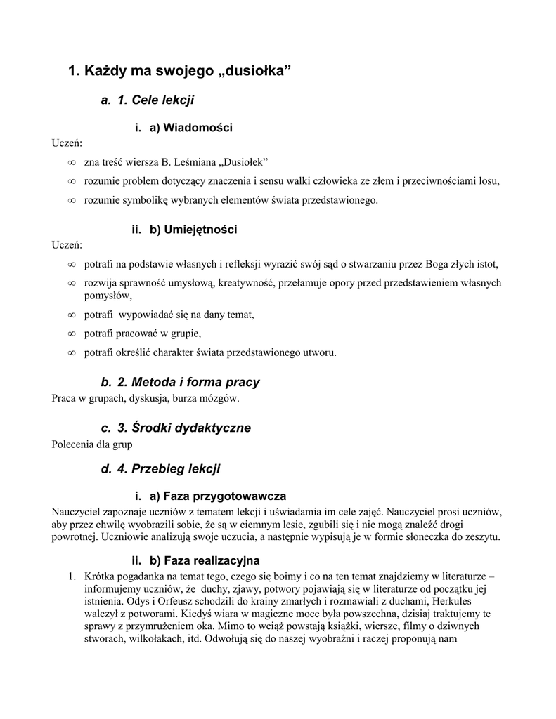 1. Każdy ma swojego „dusiołka” a. 1. Cele lekcji i. a) Wiadomości Uczeń: • zna treść wiersza B. Leśmiana „Dusiołek” • rozumie problem dotyczący znaczenia i sensu walki człowieka ze złem i przeciwnościami losu, • rozumie symbolikę wybranych elementów świata przedstawionego. ii. b) Umiejętności Uczeń: • potrafi na podstawie własnych i refleksji wyrazić swój sąd o stwarzaniu przez Boga złych istot, • rozwija sprawność umysłową, kreatywność, przełamuje opory przed przedstawieniem własnych pomysłów, • potrafi wypowiadać się na dany temat, • potrafi pracować w grupie, • potrafi określić charakter świata przedstawionego utworu. b. 2. Metoda i forma pracy Praca w grupach, dyskusja, burza mózgów. c. 3. Środki dydaktyczne Polecenia dla grup d. 4. Przebieg lekcji i. a) Faza przygotowawcza Nauczyciel zapoznaje uczniów z tematem lekcji i uświadamia im cele zajęć. Nauczyciel prosi uczniów, aby przez chwilę wyobrazili sobie, że są w ciemnym lesie, zgubili się i nie mogą znaleźć drogi powrotnej. Uczniowie analizują swoje uczucia, a następnie wypisują je w formie słoneczka do zeszytu. ii. b) Faza realizacyjna 1. Krótka pogadanka na temat tego, czego się boimy i co na ten temat znajdziemy w literaturze – informujemy uczniów, że duchy, zjawy, potwory pojawiają się w literaturze od początku jej istnienia. Odys i Orfeusz schodzili do krainy zmarłych i rozmawiali z duchami, Herkules walczył z potworami. Kiedyś wiara w magiczne moce była powszechna, dzisiaj traktujemy te sprawy z przymrużeniem oka. Mimo to wciąż powstają książki, wiersze, filmy o dziwnych stworach, wilkołakach, itd. Odwołują się do naszej wyobraźni i raczej proponują nam emocjonującą rozrywkę. Kiedy zapada zmrok i ciemność czai się za oknem, miło jest poczuć dreszczyk emocji. 2. Praca indywidualna, uczniowie wypełniają karty pracy (załącznik1). 3. Uświadomienie uczniom, że kilka elementów świata przedstawionego (postacie i wydarzenia) ma charakter symboliczny; przy pomocy nauczyciela uczniowie wskazują te elementy i objaśniają ich znaczenie dosłowne i przenośne 4. Nauczyciel dzieli klasę na grupy, 5 zespołów. Są wśród nich wybierani liderzy, sprawozdawcy, lektorzy, sekretarze. Uczniowie wspólnie wypełniają tabelkę. Po wykonaniu zadań zespoły prezentują swoje wyniki na forum klasy, są one omawiane a wnioski zapisane do zeszytu (załącznik 2) iii. c) Faza podsumowująca 1. Podsumowanie rozważań o symbolice utworu – uczniowie dochodzą do wniosku, iż każdy ma w życiu swego „dusiołka”, a następnie piszą, co jest ich „dusiołkiem” e. 5. Bibliografia 1. Brudnik E., Moszyńska A., Owczarska B, Ja i mój uczeń pracujemy aktywnie. Przewodnik po metodach aktywizujących, SFS, Kielce 2000. 2. Leśmian B., Dusiołek, w: Bobiński W., Świat w słowach i obrazach. Podręcznik do kształcenia literackiego i kulturowego w klasie III gimnazjum, WSiP, Warszawa 2000 f. 6. Załączniki g. a) Karta pracy ucznia załącznik 1. Czego się boję? b) zapisz synonimy do pojęcia strach, a następnie ułóż je w kolejności wskazującej na stopień natężenia cechy: ..................................................................................................................................................... c) zapisz określenia przymiotnikowe do pojęcia ‘strach‘: Jaki może być strach? d) zapisz nazwy czynności, które wykonujesz ze strachu: Co robię ze strachu? e) zapisz znane ci frazeologizmy na temat strachu, np. myśleć o czymś ze strachem: ....................................................................................................................................................... ....................................................................................................................................................... 4. Zapisz trzypunktowy plan, zawierający trzy najważniejsze wydarzenia utworu (bądź konsekwentny – stosuj albo zdania, albo równoważniki zdań): a) Odpoczynek.................................................................................................................. b) Sen - ....................................................................................................................... c) Przebudzenie -....................................................................................................................... załącznik 2. Polecenia dla grup: Wypełnijcie podane tabelki. W pierwszej umieśćcie swoje refleksje. W drugiej uzupełnijcie tabelę informacjami dotyczącymi wyglądu i cech bohaterów wiersza. DLACZEGO DOBRY BÓG STWORZYŁ ZŁE ISTOTY? JAKI JEST SENS WALKI CZŁOWIEKA ZE ZŁEM? i. BAJDAŁA ii. DUSIOŁEK iii. v. vi. b) Zadanie domowe Spróbuj narysować własnego Dusiołka. h. 7. Czas trwania lekcji 45 minut i. 8. Uwagi do scenariusza brak iv.
