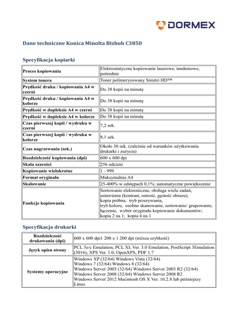 Dane techniczne Konica Minolta Bizhub C3850 Specyfikacja