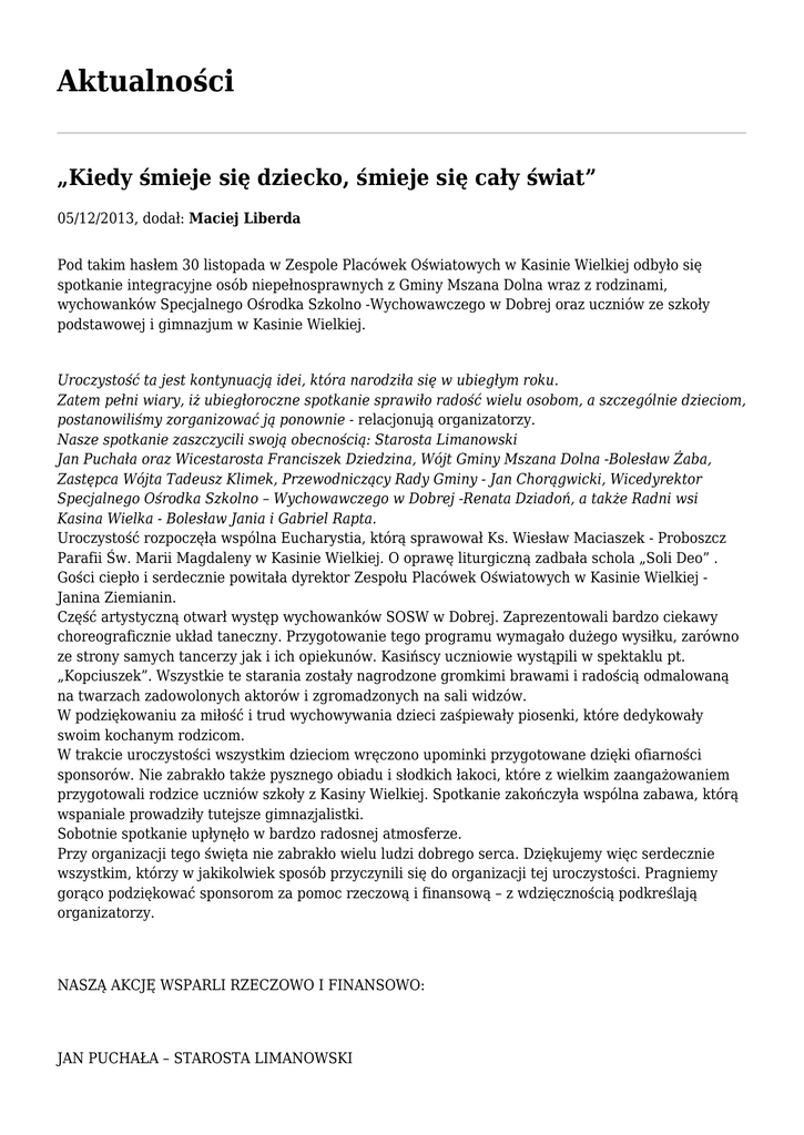 Aktualności „Kiedy śmieje się dziecko, śmieje się cały świat” 05/12/2013, dodał: Maciej Liberda Pod takim hasłem 30 listopada w Zespole Placówek Oświatowych w Kasinie Wielkiej odbyło się spotkanie integracyjne osób niepełnosprawnych z Gminy Mszana Dolna wraz z rodzinami, wychowanków Specjalnego Ośrodka Szkolno -Wychowawczego w Dobrej oraz uczniów ze szkoły podstawowej i gimnazjum w Kasinie Wielkiej. Uroczystość ta jest kontynuacją idei, która narodziła się w ubiegłym roku. Zatem pełni wiary, iż ubiegłoroczne spotkanie sprawiło radość wielu osobom, a szczególnie dzieciom, postanowiliśmy zorganizować ją ponownie - relacjonują organizatorzy. Nasze spotkanie zaszczycili swoją obecnością: Starosta Limanowski Jan Puchała oraz Wicestarosta Franciszek Dziedzina, Wójt Gminy Mszana Dolna -Bolesław Żaba, Zastępca Wójta Tadeusz Klimek, Przewodniczący Rady Gminy - Jan Chorągwicki, Wicedyrektor Specjalnego Ośrodka Szkolno – Wychowawczego w Dobrej -Renata Dziadoń, a także Radni wsi Kasina Wielka - Bolesław Jania i Gabriel Rapta. Uroczystość rozpoczęła wspólna Eucharystia, którą sprawował Ks. Wiesław Maciaszek - Proboszcz Parafii Św. Marii Magdaleny w Kasinie Wielkiej. O oprawę liturgiczną zadbała schola „Soli Deo” . Gości ciepło i serdecznie powitała dyrektor Zespołu Placówek Oświatowych w Kasinie Wielkiej Janina Ziemianin. Część artystyczną otwarł występ wychowanków SOSW w Dobrej. Zaprezentowali bardzo ciekawy choreograficznie układ taneczny. Przygotowanie tego programu wymagało dużego wysiłku, zarówno ze strony samych tancerzy jak i ich opiekunów. Kasińscy uczniowie wystąpili w spektaklu pt. „Kopciuszek”. Wszystkie te starania zostały nagrodzone gromkimi brawami i radością odmalowaną na twarzach zadowolonych aktorów i zgromadzonych na sali widzów. W podziękowaniu za miłość i trud wychowywania dzieci zaśpiewały piosenki, które dedykowały swoim kochanym rodzicom. W trakcie uroczystości wszystkim dzieciom wręczono upominki przygotowane dzięki ofiarności sponsorów. Nie zabrakło także pysznego obiadu i słodkich łakoci, które z wielkim zaangażowaniem przygotowali rodzice uczniów szkoły z Kasiny Wielkiej. Spotkanie zakończyła wspólna zabawa, którą wspaniale prowadziły tutejsze gimnazjalistki. Sobotnie spotkanie upłynęło w bardzo radosnej atmosferze. Przy organizacji tego święta nie zabrakło wielu ludzi dobrego serca. Dziękujemy więc serdecznie wszystkim, którzy w jakikolwiek sposób przyczynili się do organizacji tej uroczystości. Pragniemy gorąco podziękować sponsorom za pomoc rzeczową i finansową – z wdzięcznością podkreślają organizatorzy. NASZĄ AKCJĘ WSPARLI RZECZOWO I FINANSOWO: JAN PUCHAŁA – STAROSTA LIMANOWSKI BOLESŁAW ŻABA- WÓJT GMINY MSZANA DOLNA ZAKŁADY PRZETWÓRSTWA OWOCOWO- WARZYWNEGO TYMBARK FIRMA „BAHLSEN SWEET” Z JAWORNIKA SYLWESTER, WŁADYSŁAW CICHÓRZ-ZAKŁADY MIĘSNE W DOBREJ KS. WIESŁAW MACIASZEK – PROBOSZCZ PARAFII KASINA WIELKA IRENA HEBDA KÓŁKO ROLNICZE W KASINIE WIELKIEJ- ADAM FABIA KATARZYNA I BOLESŁAW JANIA- WŁAŚCICIELE CUKIERNI Z KASINY WIELKIEJ ANNA I JÓZEF WYDRA- WŁAŚCICIELE SKLEPU WIELOBRANŻOWEGO Z KASINY WIELKIEJ ZOFIA DZIĘTŁO -ZAKŁAD UBEZPIECZEŃ „UNIQA” W MSZANIE DOLNEJ PAŃSTWO ZAPAŁOWIE- WŁAŚCICIELE CUKIERNI Z NIEDŹWIEDZIA FOTO „MAJKA” Z MSZANY DOLNEJ MAREK FLORCZAK -WŁAŚCICIEL ZAKŁADU PRODUKCJI MIĘSNO-WĘDLINIARSKIEJ Z PODOBINA RENATA I GRZEGORZ KALETKA-WŁASCICIELE „DELIKATESÓW” Z KASINY WIELKIEJ GRAŻYNA I MACIEJ DULĘBA STEFANIA I ANDRZEJ PLEŃ BARBARA I MICHAŁ CIEŻAK AGNIESZKA KOŁODZIEJCZYK , ANDRZEJ SALA-FIRMA „LAJKONIK” ANDRZEJ MAREK SKOLARUS – ZAKŁADY MIĘSNE W KASINCE MAŁEJ TERESA I STANISŁAW CICHAŃSCY -ZAKŁADY MIĘSNE GABRIEL RAPTA- RADNY Z KASINY WIELKIEJ RODZICE UCZNIÓW ZPO KASINA WIELKA. mgr Ewa Ślaga mgr Helena Wrzecionek zdjęcia