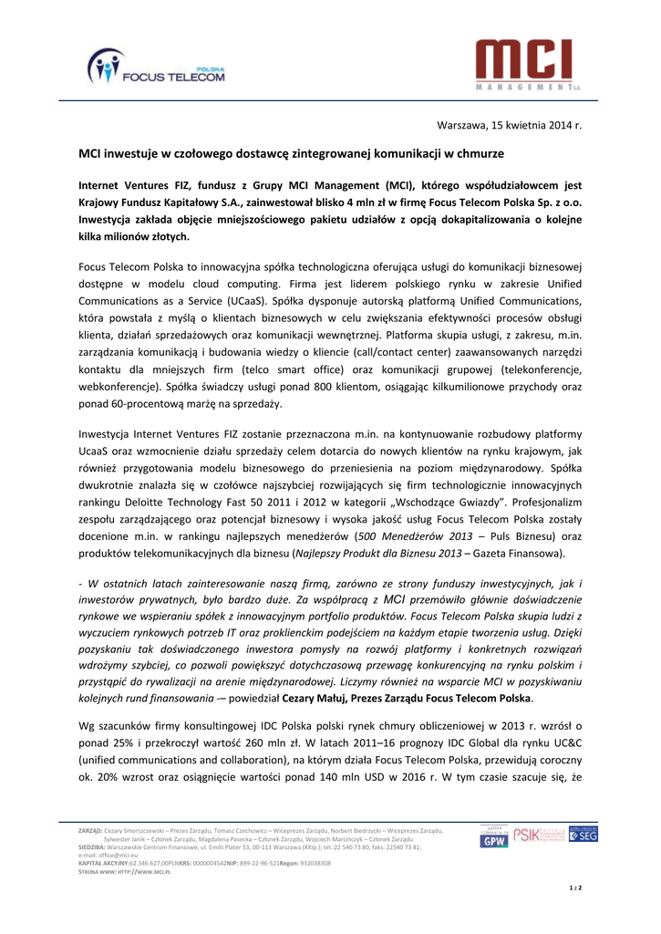 Warszawa, 15 kwietnia 2014 r. MCI inwestuje w czołowego dostawcę zintegrowanej komunikacji w chmurze Internet Ventures FIZ, fundusz z Grupy MCI Management (MCI), którego współudziałowcem jest Krajowy Fundusz Kapitałowy S.A., zainwestował blisko 4 mln zł w firmę Focus Telecom Polska Sp. z o.o. Inwestycja zakłada objęcie mniejszościowego pakietu udziałów z opcją dokapitalizowania o kolejne kilka milionów złotych. Focus Telecom Polska to innowacyjna spółka technologiczna oferująca usługi do komunikacji biznesowej dostępne w modelu cloud computing. Firma jest liderem polskiego rynku w zakresie Unified Communications as a Service (UCaaS). Spółka dysponuje autorską platformą Unified Communications, która powstała z myślą o klientach biznesowych w celu zwiększania efektywności procesów obsługi klienta, działań sprzedażowych oraz komunikacji wewnętrznej. Platforma skupia usługi, z zakresu, m.in. zarządzania komunikacją i budowania wiedzy o kliencie (call/contact center) zaawansowanych narzędzi kontaktu dla mniejszych firm (telco smart office) oraz komunikacji grupowej (telekonferencje, webkonferencje). Spółka świadczy usługi ponad 800 klientom, osiągając kilkumilionowe przychody oraz ponad 60-procentową marżę na sprzedaży. Inwestycja Internet Ventures FIZ zostanie przeznaczona m.in. na kontynuowanie rozbudowy platformy UcaaS oraz wzmocnienie działu sprzedaży celem dotarcia do nowych klientów na rynku krajowym, jak również przygotowania modelu biznesowego do przeniesienia na poziom międzynarodowy. Spółka dwukrotnie znalazła się w czołówce najszybciej rozwijających się firm technologicznie innowacyjnych rankingu Deloitte Technology Fast 50 2011 i 2012 w kategorii „Wschodzące Gwiazdy”. Profesjonalizm zespołu zarządzającego oraz potencjał biznesowy i wysoka jakość usług Focus Telecom Polska zostały docenione m.in. w rankingu najlepszych menedżerów (500 Menedżerów 2013 – Puls Biznesu) oraz produktów telekomunikacyjnych dla biznesu (Najlepszy Produkt dla Biznesu 2013 – Gazeta Finansowa). - W ostatnich latach zainteresowanie naszą firmą, zarówno ze strony funduszy inwestycyjnych, jak i inwestorów prywatnych, było bardzo duże. Za współpracą z MCI przemówiło głównie doświadczenie rynkowe we wspieraniu spółek z innowacyjnym portfolio produktów. Focus Telecom Polska skupia ludzi z wyczuciem rynkowych potrzeb IT oraz proklienckim podejściem na każdym etapie tworzenia usług. Dzięki pozyskaniu tak doświadczonego inwestora pomysły na rozwój platformy i konkretnych rozwiązań wdrożymy szybciej, co pozwoli powiększyć dotychczasową przewagę konkurencyjną na rynku polskim i przystąpić do rywalizacji na arenie międzynarodowej. Liczymy również na wsparcie MCI w pozyskiwaniu kolejnych rund finansowania -– powiedział Cezary Małuj, Prezes Zarządu Focus Telecom Polska. Wg szacunków firmy konsultingowej IDC Polska polski rynek chmury obliczeniowej w 2013 r. wzrósł o ponad 25% i przekroczył wartość 260 mln zł. W latach 2011–16 prognozy IDC Global dla rynku UC&C (unified communications and collaboration), na którym działa Focus Telecom Polska, przewidują coroczny ok. 20% wzrost oraz osiągnięcie wartości ponad 140 mln USD w 2016 r. W tym czasie szacuje się, że ZARZĄD: Cezary Smorszczewski – Prezes Zarządu, Tomasz Czechowicz – Wiceprezes Zarządu, Norbert Biedrzycki – Wiceprezes Zarządu, Sylwester Janik – Członek Zarządu, Magdalena Pasecka – Członek Zarządu, Wojciech Marcińczyk – Członek Zarządu SIEDZIBA: Warszawskie Centrum Finansowe, ul. Emilii Plater 53, 00-113 Warszawa (XXIp.); tel.:22 540 73 80, faks: 22540 73 81; e-mail: [email protected] KAPITAŁ AKCYJNY:62.346.627,00PLNKRS: 0000004542NIP: 899-22-96-521Regon: 932038308 STRONA WWW: HTTP://WWW.MCI.PL 1z2 obroty generowane przez sektor rozwiązań contact center będą wzrastać przeciętnie o ponad 24% rocznie. – Rynek ”cloud computing” to jeden z najszybciej rozwijających się segmentów IT w Polsce. Spółki, takie jak Focus Telecom Polska, ze swoim elastycznym modelem biznesowym, kreują istotną wartość dla swoich klientów. Łącząc innowacyjną ofertę z wysoką jakością obsługi klientów, mogą liczyć na dynamiczny wzrost skali działalności w najbliższych latach -– powiedział Tomasz Danis, zarządzający funduszu Internet Ventures FIZ. – Mówimy tutaj nie tylko o rynku polskim. W naszej ocenie model biznesowy Focus Telecom Polska oraz właściwa strategia działania w perspektywie 1-2 lat pozwolą spółce na ekspansję w skali globalnej. Inwestycja w Focus Telecom Polska to czwarta, po Hojo.pl, mGenerator i Feedo, inwestycja funduszu Internet Ventures FIZ w tym roku. Fundusz zdecydował się na dywersyfikację portfolio inwestycji. Dzięki ekspozycji na spółkę technologiczną oferującą wysokiej jakości rozwiązania komunikacyjne, w ramach synergii portfelowych, możliwe będzie potencjalnie m.in. skierowanie oferty usług Focus Telecom Polska do pozostałych spółek z grupy MCI oraz klientów biznesowych obsługiwanych przez takie spółki. To także kolejny projekt realizowany wspólnie z Krajowym Funduszem Kapitałowym (KFK), który w roli współudziałowca kilkunastu funduszy inwestycyjnych typu venture capital, wspiera inwestowanie w młode polskie firmy napotykające na barierę finansowania swego rozwoju ze względu na wczesny etap działalności operacyjnej i niepewność odnośnie efektu ekonomicznego. MCI MANAGEMENT SA - utworzony w 1999 r., to jeden z wiodących w regionie CEE, publicznie notowany fundusz private equity o charakterze multistage. MCI, za pośrednictwem 6 funduszy PE/VC: MCI.EuroVentures, MCI.TechVentures, MCI.BioVentures, MCI.CreditVentures, HelixVentures Partners i Internet Ventures, realizuje inwestycje w obszarze earlystage, growthstage i expansion/buyout stage w krajach Europy Środkowo-Wschodniej, a także w Niemczech i Austrii (DACH) o