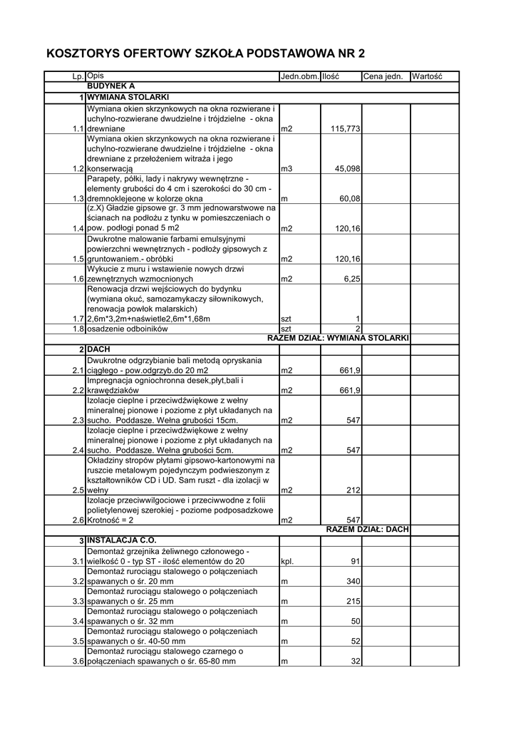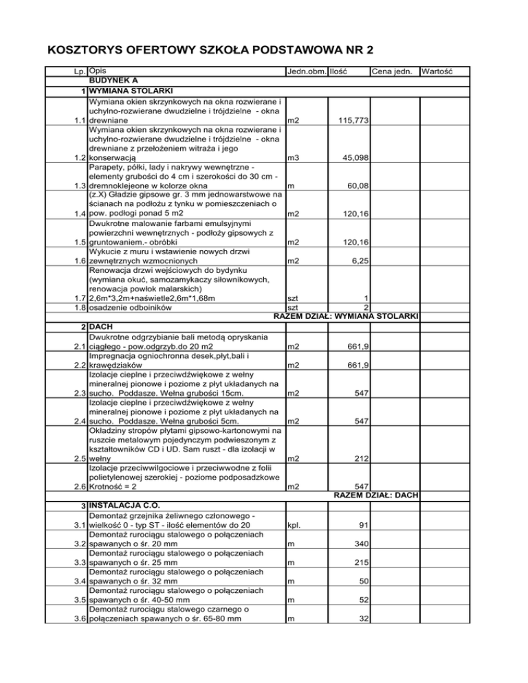 KOSZTORYS OFERTOWY SZKOŁA PODSTAWOWA NR 2 Lp. Opis Jedn.obm. Ilość Cena jedn. Wartość BUDYNEK A 1 WYMIANA STOLARKI Wymiana okien skrzynkowych na okna rozwierane i uchylno-rozwierane dwudzielne i trójdzielne - okna 1.1 drewniane m2 115,773 Wymiana okien skrzynkowych na okna rozwierane i uchylno-rozwierane dwudzielne i trójdzielne - okna drewniane z przełożeniem witraża i jego 1.2 konserwacją m3 45,098 Parapety, półki, lady i nakrywy wewnętrzne elementy grubości do 4 cm i szerokości do 30 cm 1.3 dremnoklejeone w kolorze okna m 60,08 (z.X) Gładzie gipsowe gr. 3 mm jednowarstwowe na ścianach na podłożu z tynku w pomieszczeniach o 1.4 pow. podłogi ponad 5 m2 m2 120,16 Dwukrotne malowanie farbami emulsyjnymi powierzchni wewnętrznych - podłoży gipsowych z 1.5 gruntowaniem.- obróbki m2 120,16 Wykucie z muru i wstawienie nowych drzwi 1.6 zewnętrznych wzmocnionych m2 6,25 Renowacja drzwi wejściowych do bydynku (wymiana okuć, samozamykaczy siłownikowych, renowacja powłok malarskich) 1.7 2,6m*3,2m+naświetle2,6m*1,68m szt 1 1.8 osadzenie odboiników szt 2 RAZEM DZIAŁ: WYMIANA STOLARKI 2 DACH Dwukrotne odgrzybianie bali metodą opryskania 2.1 ciągłego - pow.odgrzyb.do 20 m2 m2 661,9 Impregnacja ogniochronna desek,płyt,bali i 2.2 krawędziaków m2 661,9 Izolacje cieplne i przeciwdźwiękowe z wełny mineralnej pionowe i poziome z płyt układanych na m2 547 2.3 sucho. Poddasze. Wełna grubości 15cm. Izolacje cieplne i przeciwdźwiękowe z wełny mineralnej pionowe i poziome z płyt układanych na 2.4 sucho. Poddasze. Wełna grubości 5cm. m2 547 Okładziny stropów płytami gipsowo-kartonowymi na ruszcie metalowym pojedynczym podwieszonym z kształtowników CD i UD. Sam ruszt - dla izolacji w 2.5 wełny m2 212 Izolacje przeciwwilgociowe i przeciwwodne z folii polietylenowej szerokiej - poziome podposadzkowe 2.6 Krotność = 2 m2 547 RAZEM DZIAŁ: DACH 3 INSTALACJA C.O. Demontaż grzejnika żeliwnego członowego 3.1 wielkość 0 - typ ST - ilość elementów do 20 kpl. 91 Demontaż rurociągu stalowego o połączeniach 3.2 spawanych o śr. 20 mm m 340 Demontaż rurociągu stalowego o połączeniach 3.3 spawanych o śr. 25 mm m 215 Demontaż rurociągu stalowego o połączeniach 3.4 spawanych o śr. 32 mm m 50 Demontaż rurociągu stalowego o połączeniach 3.5 spawanych o śr. 40-50 mm m 52 Demontaż rurociągu stalowego czarnego o 3.6 połączeniach spawanych o śr. 65-80 mm m 32 Grzejniki stalowe dwupłytowe o wys. 600-900 mm i 3.7 dług. do 1600 mm (22KV) 3.8 Zawory termostatyczne 3.9 Głowice termostatyczne 3.10 Zawory odpowietrzające automatyczne o śr. 15 mm Przebicie otworów o powierzchni do 0.05 m2 w elementach z betonu żwirowego o grubości do 30 3.11 cm Rury przyłączne o śr. 15 mm do grzejników żeliwnych,stalowych,aluminiowych,płytowych o 3.12 połączeniu na gwint Rurociągi z tworzyw sztucznych (PP, PE, PB) o śr. zewnętrznej 16x2,2 mm na ścianach w budynkach 3.13 niemieszkalnych Rurociągi z tworzyw sztucznych (PP, PE, PB) o śr. zewnętrznej 20x2,8 mm na ścianach w budynkach 3.14 niemieszkalnych Rurociągi z tworzyw sztucznych (PP, PE, PB) o śr. zewnętrznej 25x3,5 mm na ścianach w budynkach 3.15 niemieszkalnych Rurociągi z tworzyw sztucznych (PP, PE, PB) o śr. zewnętrznej 32x4,4 mm na ścianach w budynkach 3.16 niemieszkalnych szt. szt. szt. 91 91 91 szt. 15 szt. 38 kpl. 91 m 238 m 102 m 215 m 50 Rurociągi z tworzyw sztucznych (PP, PE, PB) o śr. zewnętrznej 40 mm o połączeniach zgrzewanych, 3.17 na ścianach w budynkach niemieszkalnych m 38 Rurociągi z tworzyw sztucznych (PP, PE, PB) o śr. zewnętrznej 50 mm o połączeniach zgrzewanych, 3.18 na ścianach w budynkach niemieszkalnych m 14 m 32 m 689 m 689 m2 82 m 46 3.19 3.20 3.21 3.22 Rurociągi z tworzyw sztucznych (PP, PE, PB) o śr. zewnętrznej 63 mm o połączeniach zgrzewanych, na ścianach w budynkach niemieszkalnych Próba szczelności instalacji c.o. w budynkach niemieszkalnych - płukanie, czynności przygotowawcze i zakończeniowe Próba szczelności instalacji c.o. w budynkach niemieszkalnych - próba wodna ciśnieniowa Obud.słupów płytami gips.-karton.na rusztach metal.pojedyń.dwuwarstw.55-02 Otuliny termoizolacyjne z pianki PE z nacięciem 3.23 wzdłużnym gr. 20 mm; śr. zewn. rurociągu 54 mm Otuliny termoizolacyjne z pianki PE z nacięciem 3.24 wzdłużnym gr. 20 mm; śr. zewn. rurociągu 42 mm m 42 RAZEM DZIAŁ: INSTALACJA C.O. BUDYNEK A WARTOŚĆ KOSZTORYSOWA NETTO BUDYNEK A PODATEK VAT BUDYNEK A WARTOŚĆ KOSZTORYSOWA BRUTTO BUDYNEK B 1 WYMIANA STOLARKI Wymiana okien skrzynkowych na okna rozwierane i uchylno-rozwierane dwudzielne i trzydzielne 1.1 okna drewniane m2 Parapety, półki, lady i nakrywy wewnętrzne elementy grubości do 4 cm i szerokości do 30 cm 1.2 dremnoklejeone w kolorze okna m 80,920 27,67 1.3 1.4 1.5 1.6 2 2.1 2.2 2.3 2.4 2.5 3 3.1 3.2 3.3 3.4 3.5 3.6 3.7 3.8 (z.X) Gładzie gipsowe gr. 3 mm jednowarstwowe na ścianach na podłożu z tynku w pomieszczeniach o pow. podłogi ponad 5 m2 m2 55,34 Dwukrotne malowanie farbami emulsyjnymi powierzchni wewnętrznych - podłoży gipsowych z gruntowaniem. m2 55,34 Wykucie z muru i wstawienie nowych drzwi zewnętrznych wzmocnionych m2 5,358 osadzenie odbojników szt 2 RAZEM DZIAŁ: WYMIANA STOLARKI IZOLACJA STROPU Dwukrotne odgrzybianie bali metodą opryskania ciągłego - pow.odgrzyb.do 20 m2 m2 82 Impregnacja ogniochronna desek,płyt,bali i krawędziaków m2 82 Izolacje cieplne i przeciwdźwiękowe z wełny mineralnej pionowe i poziome z płyt układanych na sucho. Poddasze. Wełna grubości 20cm. m2 82 Izolacje przeciwwilgociowe i przeciwwodne z folii polietylenowej szerokiej - poziome podposadzkowe Krotność = 2 m2 82 Ślepa podłoga z o grubości na legarach ułożonych krzyżowo - legary + płyta OSB m2 82 RAZEM DZIAŁ: IZOLACJA STROPU INSTALACJA C.O. Demontaż grzejnika żeliwnego członowego wielkość 0 - typ ST - ilość elementów do 20 kpl. 41 Demontaż rurociągu stalowego o połączeni