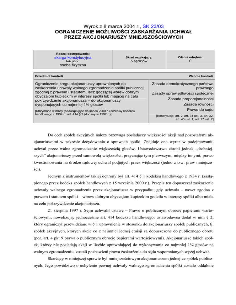 Wyrok z 8 marca 2004 r., SK 23/03 OGRANICZENIE MOŻLIWOŚCI ZASKARŻANIA UCHWAŁ PRZEZ AKCJONARIUSZY MNIEJSZOŚCIOWYCH Rodzaj postępowania: skarga konstytucyjna Inicjator: osoba fizyczna Skład orzekający: 5 sędziów Przedmiot kontroli Ograniczenie kręgu akcjonariuszy uprawnionych do zaskarżenia uchwały walnego zgromadzenia spółki publicznej zgodnej z prawem i statutem, lecz godzącej wbrew dobrym obyczajom kupieckim w interesy spółki lub mającej na celu pokrzywdzenie akcjonariusza – do akcjonariuszy dysponujących co najmniej 1% głosów [Utrzymane w mocy (obowiązujące do końca 2000 r.) przepisy kodeksu handlowego z 1934 r.: art. 414 § 2 (dodany w 1997 r.)] Zdania odrębne: 0 Wzorce kontroli Zasada demokratycznego państwa prawnego Zasady sprawiedliwości społecznej Zasada proporcjonalności Zasada równości Prawo do sądu [Konstytucja: art. 2, art. 31 ust. 3, art. 32, art. 45 ust. 1, art. 77 ust. 2] Do cech spółek akcyjnych należy przewaga posiadaczy większości akcji nad pozostałymi akcjonariuszami w zakresie decydowania o sprawach spółki. Znajduje ona wyraz w podejmowaniu uchwał przez walne zgromadzenie większością głosów. Ustawodawstwo chroni jednak „drobniejszych” akcjonariuszy przed samowolą większości, przyznając tym pierwszym, między innymi, prawo kwestionowania na drodze sądowej uchwał podjętych przez większość (jedno z tzw. praw mniejszości). Jednym z instrumentów takiej ochrony był art. 414 § 1 kodeksu handlowego z 1934 r. (zastąpionego przez kodeks spółek handlowych z 15 września 2000 r.). Przepis ten dopuszczał zaskarżenie uchwały walnego zgromadzenia przez akcjonariusza w przypadku, gdy uchwała – nawet zgodna z prawem i statutem spółki – wbrew dobrym obyczajom kupieckim godziła w interesy spółki albo miała na celu pokrzywdzenie akcjonariusza. 21 sierpnia 1997 r. Sejm uchwalił ustawę – Prawo o publicznym obrocie papierami wartościowymi, nowelizując jednocześnie art. 414 kodeksu handlowego: ustawodawca dodał w nim § 2, który ograniczył przewidziane w § 1 uprawnienie w stosunku do akcjonariuszy spółek publicznych, tj. spółek akcyjnych, których akcje co z najmniej jednej emisji są dopuszczone do publicznego obrotu (por. art. 4 pkt 9 prawa o publicznym obrocie papierami wartościowymi). Akcjonariusze takich spółek, którzy nie posiadają akcji w liczbie uprawniającej do wykonywania co najmniej 1% głosów na walnym zgromadzeniu, zostali pozbawieni prawa zaskarżenia do sądu wspomnianych wyżej uchwał. Skarżący w niniejszej sprawie był mniejszościowym akcjonariuszem jednej ze spółek publicznych. Jego powództwo o uchylenie pewnej uchwały walnego zgromadzenia spółki zostało oddalone 2 przez sąd na podstawie art. 414 § 2 k.h. Wyrok ten został utrzymany w mocy przez sąd drugiej instancji. W skardze konstytucyjnej zarzucono, że art. 414 § 2 k.h. jest sprzeczny z konstytucyjnymi zasadami państwa prawnego i sprawiedliwości społecznej (art. 2), proporcjonalności (art. 31 ust. 3) i równości (art. 32) oraz z konstytucyjnymi gwarancjami prawa do sądu (art. 45 ust. 1 i art. 77 ust. 2) i ochrony własności (art. 21 i art. 64 ust. 2). ROZSTRZYGNIĘCIE Zaskarżony przepis jest niezgodny z art. 2, art. 32, art. 45 ust. 1 i art. 77 ust. 2 w związku z art. 31 ust. 3 Konstytucji. Trybunał umorzył postępowanie w zakresie badania zgodności zaskarżonego przepisu z: 1) art. 21 ust. 2 Konstytucji – na podstawie art. 39 ust. 1 pkt 2 i ust. 2 ustawy o TK, z powodu cofnięcia skargi, 2) art. 21 ust. 1 i art. 64 ust. 2 Konstytucji – na podstawie art. 39 ust. 1 pkt 1 i ust. 2 ustawy o TK, z powodu zbędności orzekania. GŁÓWNE TEZY UZASADNIENIA 1. Zgodnie z unormowaniem międzyczasowym kodeksu spółek handlowych z 2000 r. (art. 619) o uprawnieniu do zaskarżenia uchwały podjętej pod rządami przepisów dawnego kodeksu handlowego z 1934 r. nadal decydują przepisy tegoż kodeksu, w tym art. 414 § 2. Skarżący zarzuca, że ten właśnie przepis stanowił podstawę naruszenia jego praw, co uzasadnia poddanie go kontroli konstytucyjności mimo uchylenia przepisów kodeksu handlowego (art. 39 ust. 3 ustawy o TK). 2. Wzorcami kontroli norm sprawowanej w trybie skargi konstytucyjnej mogą być tylko przepisy Konstytucji statuujące wolności lub prawa (wniosek z art. 79 ust. 1 Konstytucji). Przepisy art. 2 (zasady demokratycznego państwa prawnego i sprawiedliwości społecznej), art. 31 ust. 3 (zasada proporcjonalności) i art. 32 Konstytucji (zasada równości) nie są źródłem wolności ani praw, a wobec tego mogą stanowić podstawę skargi konstytucyjnej tylko w powiązaniu z przepisami konstytucyjnymi, z których wynikają wolności lub prawa. 3. Jednym z elementów prawa do sądu (art. 45 ust. 1 Konstytucji) jest możliwość inicjowania postępowania sądowego. Potwierdzeniem tego jest art. 77 ust. 2 Konstytucji, wyrażający zakaz zamykania drogi sądowej dochodzenia naruszonych wolności lub praw. 4. Pierwotnie art. 414 § 1 kodeksu handlowego statuował prawo zaskarżenia uchwał walnego zgromadzenia powziętych wbrew dobrym obyczajom kupieckim, godzącym w interesy spółki lub mającym na celu pokrzywdzenie akcjonariuszy. Dodanie kwestionowanego paragrafu drugiego służyło wyłącznie odebraniu tego prawa określonej grupie akcjonariuszy. Było to sprzeczne z art. 45 ust. 1 i art. 77 ust. 2 Konstytucji. 5. Zasada proporcjonalności (art. 31 ust. 3 Konstytucji) jest pomocna w ocenie zgodności z Konstytucją ograniczenia jednego prawa ze względu na konieczność ochrony innego. Pozwala ona ustalić, czy ustawodawca zachował równowagę między dwoma, konstytucyjnie chronionymi wartościami. 3 6. Funkcją prawa zaskarżenia uchwał organów spółki była eliminacja z obrotu uchwał podjętych m.in. w celu pokrzywdzenia akcjonariuszy. Sprawność działania spółek publicznych nie stanowi jednak wartości uzasadniającej pozbawienie akcjonariuszy mniejszościowych 